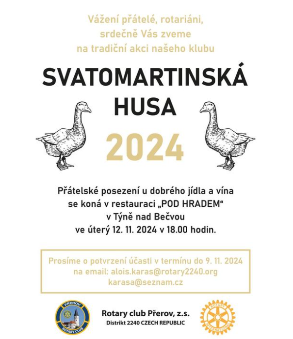 srdečně Vás zveme na tradiční akci našeho klubu „Společná večeře u Svatomartinské husy“.