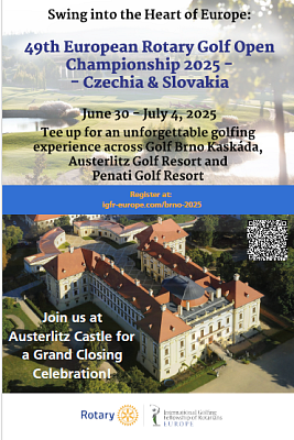 Prijmite pozvanie na Otvorené majstrovstvá Európy v Rotary golfe v dňoch 30.6.2025 až 4.7.2025 v Brne a jeho okolí.