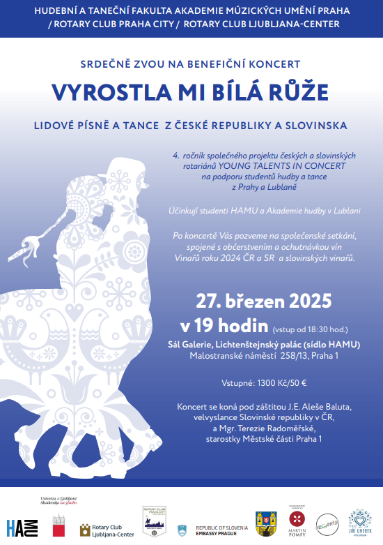 HUDEBNÍ A TANEČNÍ FAKULTA AKADEMIE MÚZICKÝCH UMĚNÍ PRAHA/ ROTARY CLUB PRAHA CITY / ROTARY CLUB LJUBLJANA-CENTER VÁS SRDEČNĚ ZVOU NA BENEFIČNÍ KONCERT VYROSTLA MI BÍLÁ RŮŽE LIDOVÉ PÍSNĚ A TANCE Z ČESKÉ REPUBLIKY A SLOVINSKA.