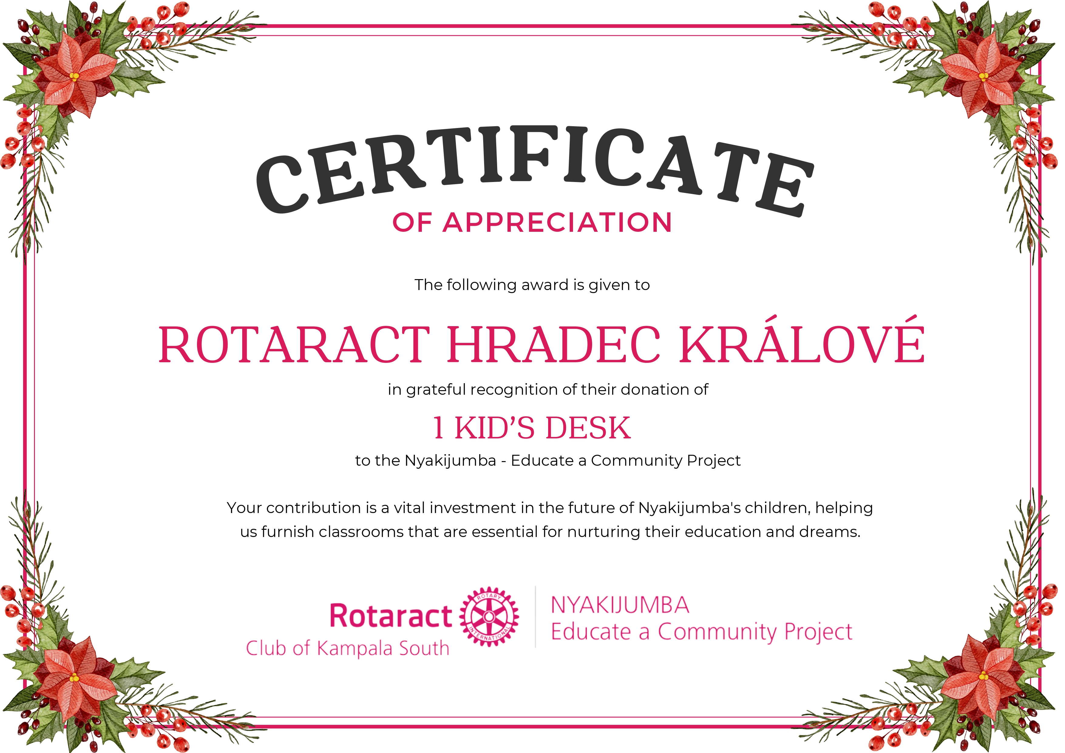 At Rotaract Hradec Králové, we believe that education is the key to a better future. That’s why we are proud to have contributed to the Nyakijumba – Educate a Community Project by donating a school desk to a classroom in Uganda.