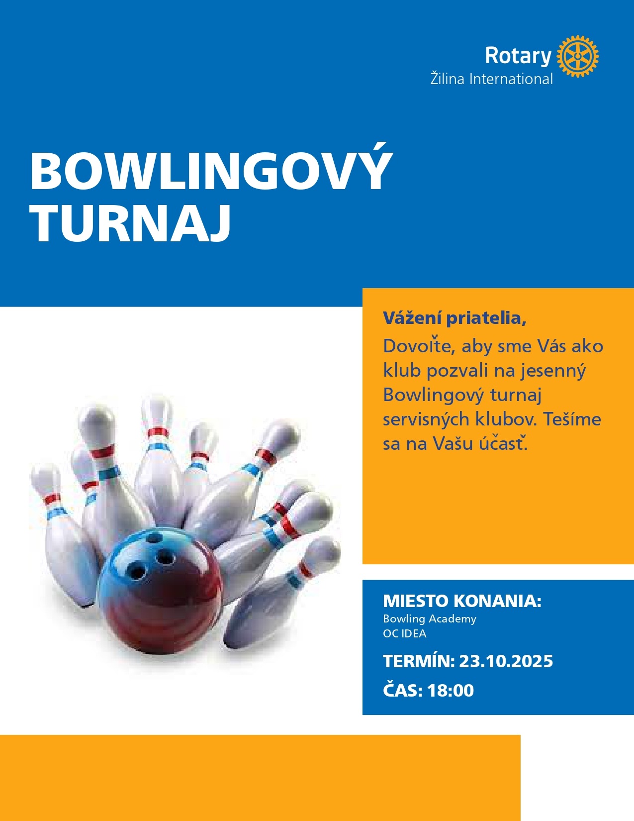 Bowlingový turnaj servisných klubov je už tradičná záležitosť organizovaná striedavo klubmi na jar a na jeseň každého roka. Tento rok pozývame 6 klubov pôsobiacich na území Žiliny (Rotary Žilina, Rotaract Žilina, Lions, Lions Ladies, Soroptimist).
