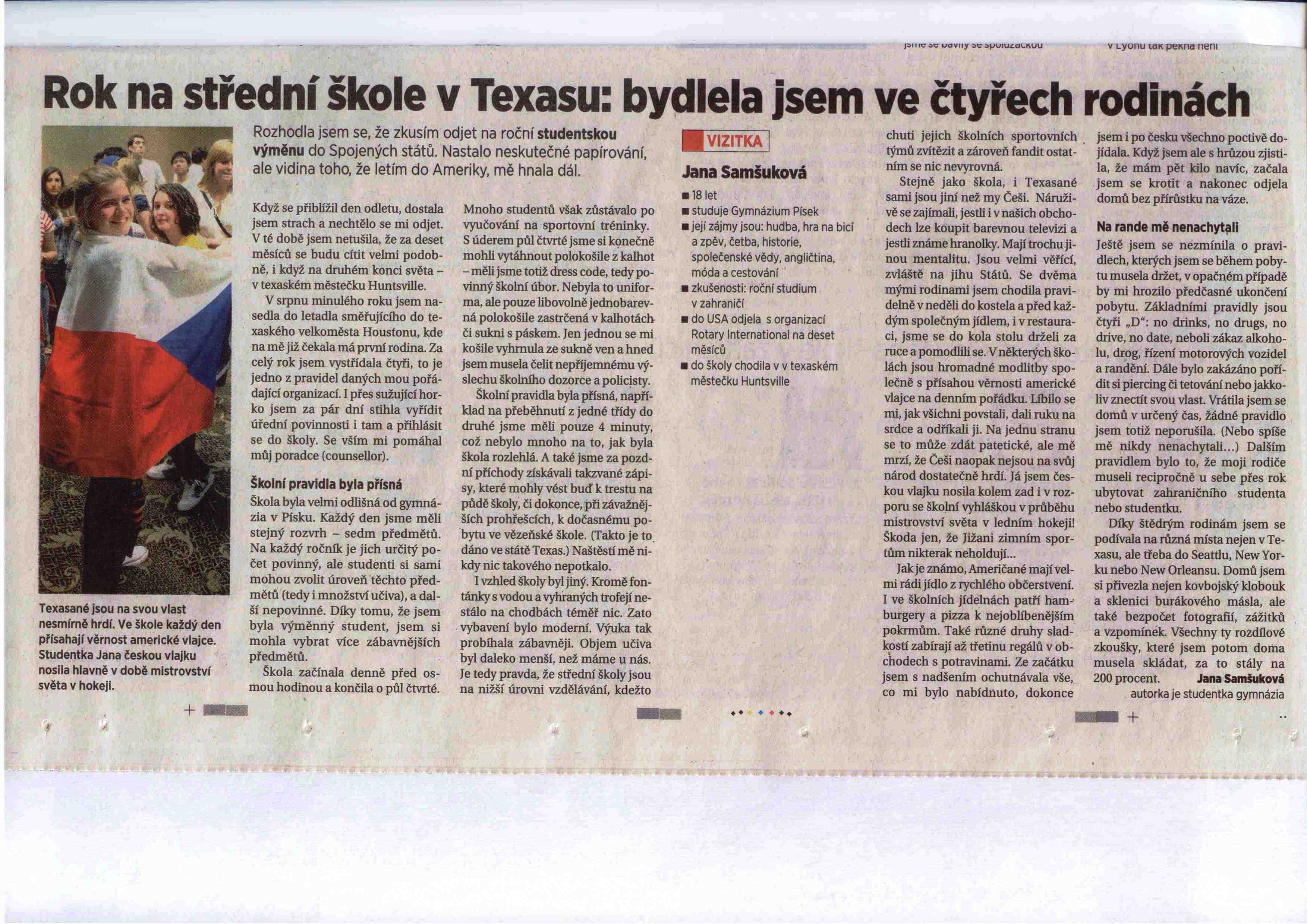 Naše výměnná studentka Jana Samšuková, která prožila rok 2009/10 na dlouhodobé výměně v Texasu se podělila o své zkušenosti na stránkách deníku DNES.