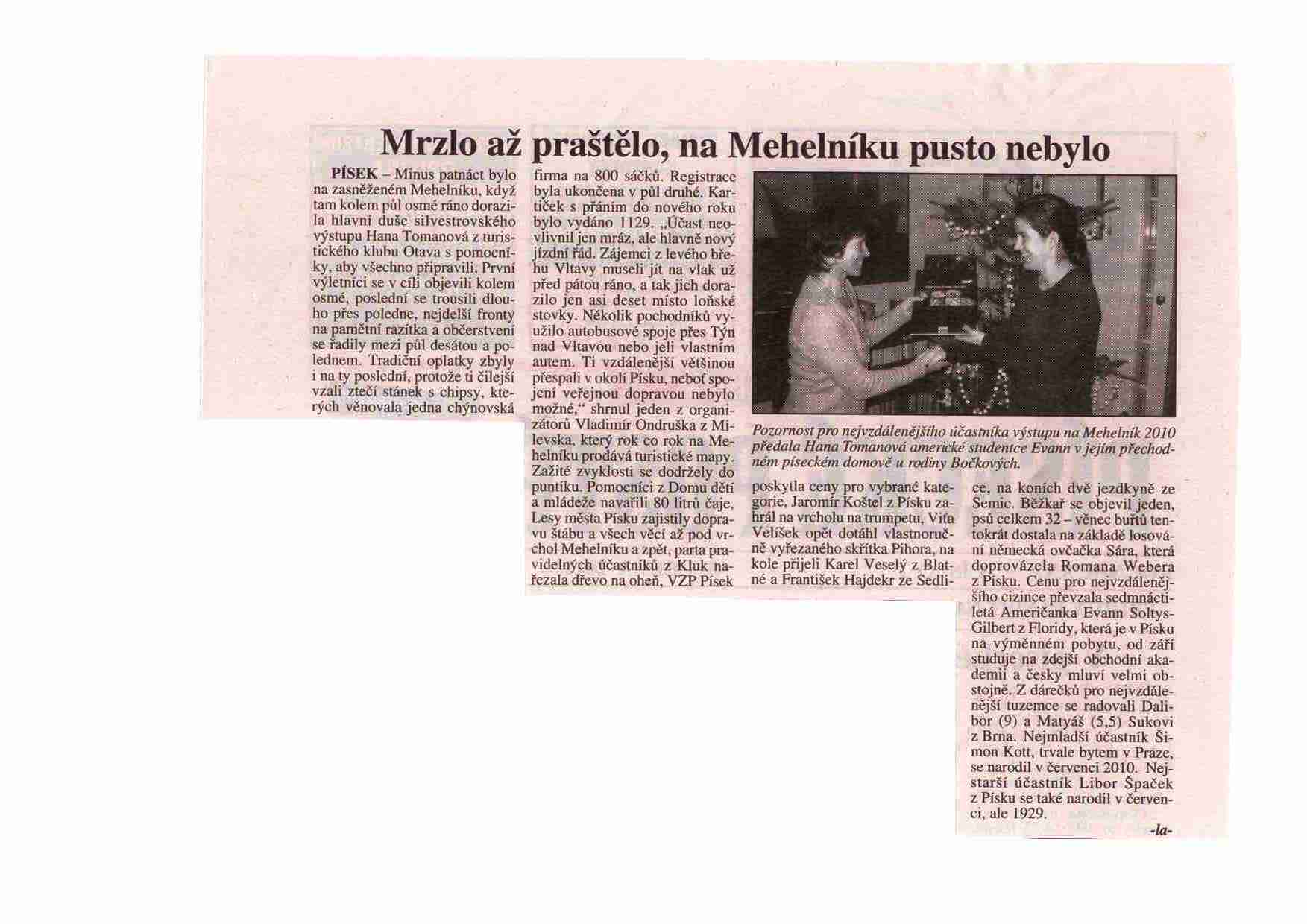 Svůj pobyt v Písku prožívá velmi aktivně, takže se určitě i s velkou dávkou zvědavosti zúčastnila tradičního silvestrovského výstupu na Mehelník - nejvyšší vrch Píseckých lesů. Jistě před startem netušila, že se stane nejvzdálenější účastnicí, ale ocenění nepotěšilo jen samotnou Evann, ale také všechny členy RC Písek.