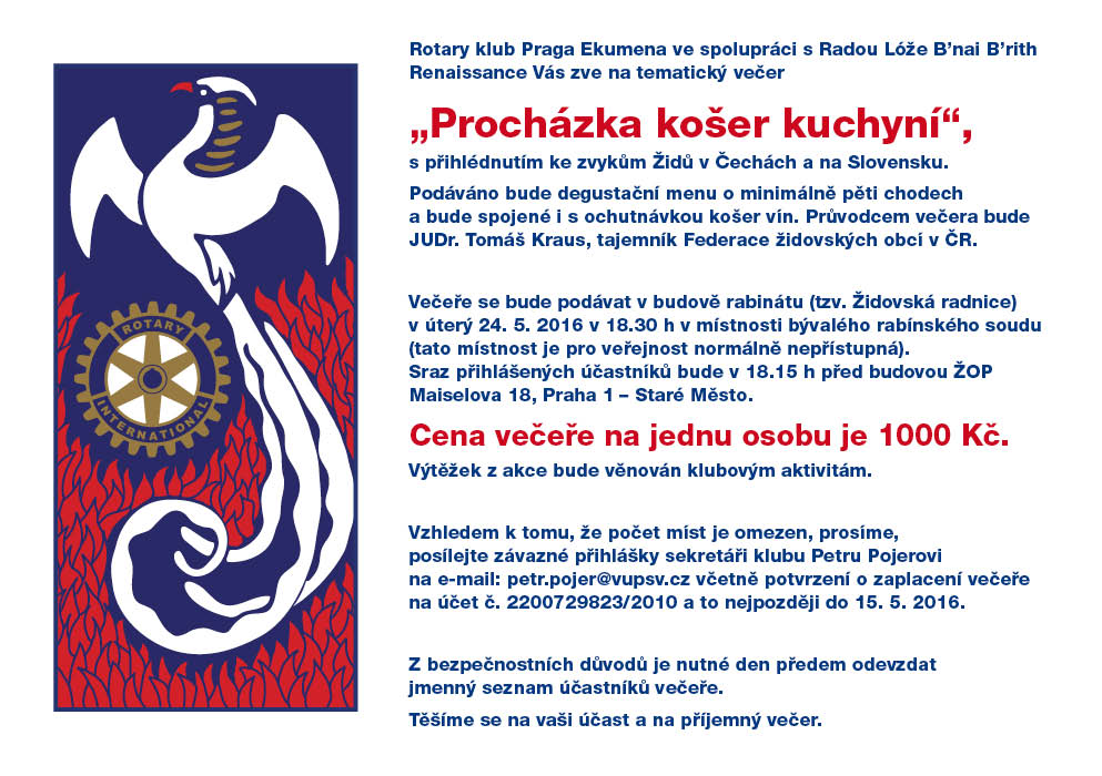 tematický večer pořádaný RC Praga Ekumena s názvem „Procházka košer kuchyní“, s přihlédnutím ke zvykům Židů v Čechách a na Slovensku.