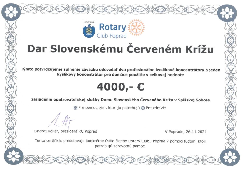 Členovia nášho klubu vypočuli podnet Územného Spolku Slovenského Červeného kríža v Poprade, preto sme 26.11.2021 mohli tomuto spolku slávnostne odovzdať 3 kyslíkové koncentrátory v hodnote 4000 EUR. Dva profesionálne a jeden mobilný koncentrátor kyslíka poslúžia klientom zariadenia opatrovateľskej služby Domu Červeného Kríža v Spišskej Sobote pri liečbe postcovidových stavov. Táto pomoc prichádza v najťažšej fáze pandémie COVID-19, preto ju Oblastný Spolok SČK Poprad veľmi ocenil. Členovia Rotary Clubu Poprad svojimi príspevkami, príspevkami 2% z dane z príjmu i prispením Nadácie Rotary dokázali počas niekoľkých mesiacov zhromaždiť požadovanú čiastku a dodávkou kyslíkových koncentrátorov prispieť k pomoci pacientom s následkami po ochorení koronavírusom. Územný Spolok Slovenského Červeného Kríža v Poprade je spoľahlivým partnerom Rotary Clubu Poprad. Naša pomoc tomuto spolku smerovala i v predchádzajúcich rokoch a to predovšetkým pri dodávkach polohovateľných postelí a dekubitných matracov.