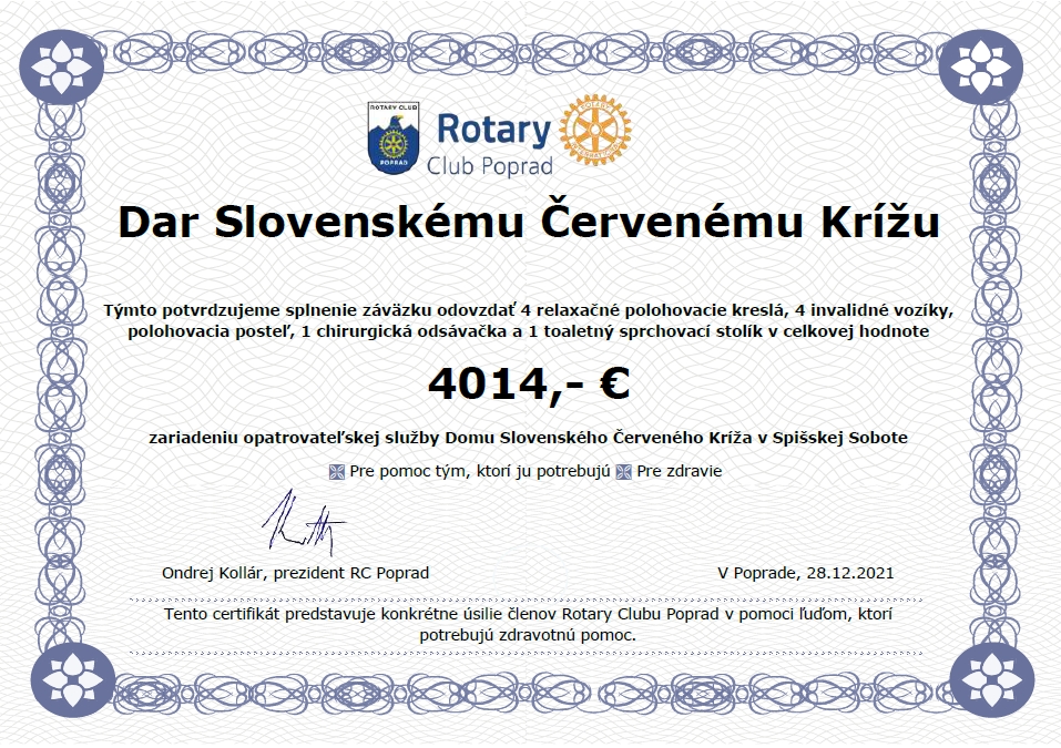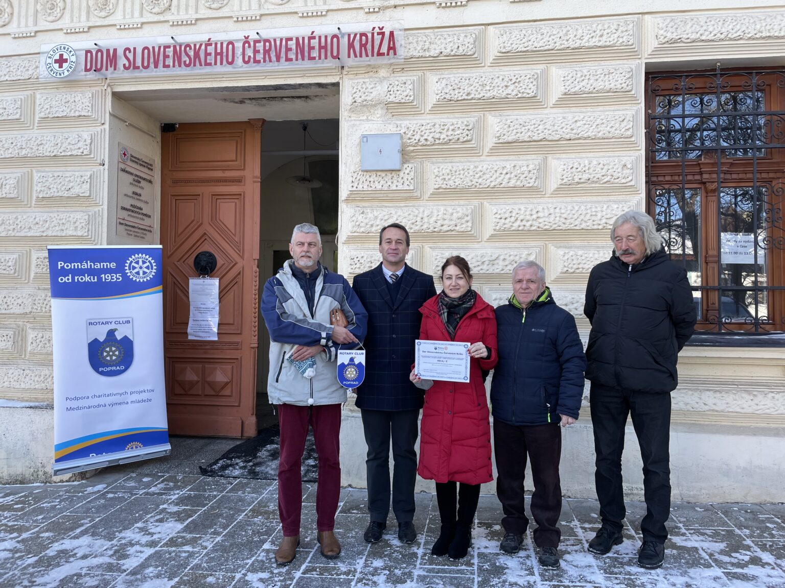 V decembri 2021 sme sa s našou pomocou vrátili do Domu Červeného Kríža, ktorému pomáhame už od roku 1998. Podarilo sa nám zhromaždiť 4014 EUR, za ktoré sme nakúpili štyri polohovateľné kreslá, štyri invalidné vozíky, jednu polohovateľnú posteľ, jednu chirurgickú odsávačku a jeden toaletný sprchovací stolík. Toto vybavenie sme 28. decembra odovzdali v Dome Červeného Kríža do rúk riaditeľky Územného spolku SČK Ing. Kučkovskej. Poznáme činnosť miestneho spolu SČK už viac ako 20 rokov a preto sme si istí, že naša pomoc pomôže zefektívniť a uľahčiť prácu zamestnancom a zlepšiť kvalitu života klientom Domu Červeného Kríža v Poprade.