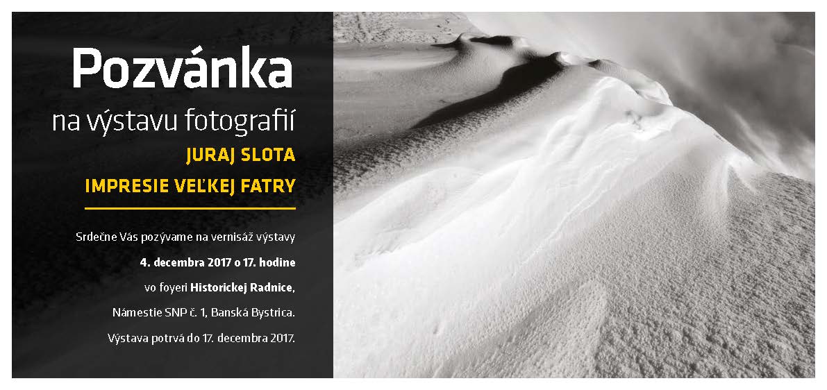 Najbližšie akcie: 4.12.2017 o 17,00 hod. Výstava fotografií Juraja Slotu, ,,Impresie Veľkej Fatry,, vo foyeri Historickej Radnice, Nám.SNP 1, B.B., dňa 7.12.2017 ,,Spájanie, Národný dom o 18,00 hod., dňa 11.12.2017 - Vianočná kapustnica s punčom, Benitzkého dom, 17,00 hod., Pozvanie platí aj s partnerkami a partnermi, poprosíme, aby ste nahlásili mailom B.Očenášovej do 5.12.2017, či máte záujem o kapustnicu s Tofu. (Zatiaľ rátame len s M.Klusom).