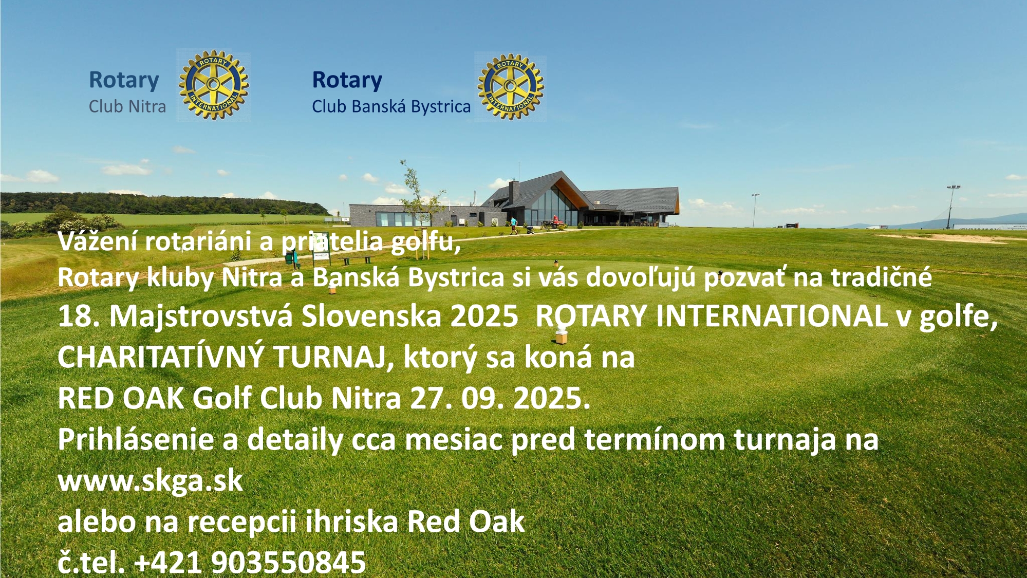 Rotary kluby Nitra a Banská Bystrica si vás dovoľujú pozvať na tradičné 18. Majstrovstvá Slovenska 2025 ROTARY INTERNATIONAL v golfe,