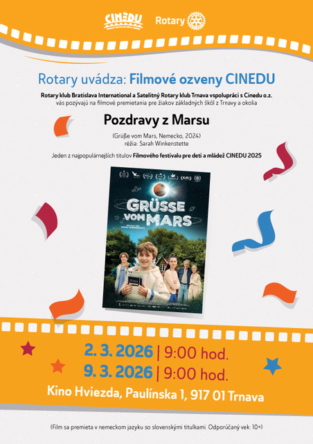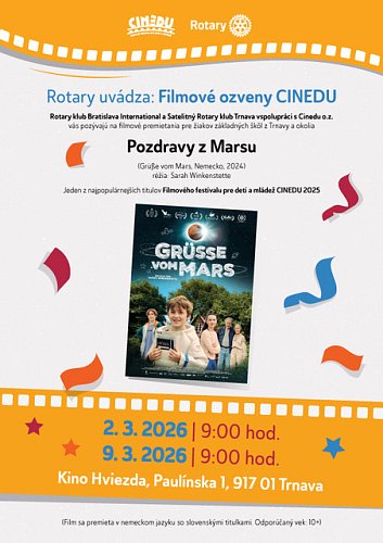 Edukačný projekt satelitného klubu v Trnave s našou spoluúčasťou v rámci ktorého bude 2x krát premietanie nemeckého filmu "Pozdravy z Marsu" (2024) pre žiakov základných škôl z Trnavy a okolia.