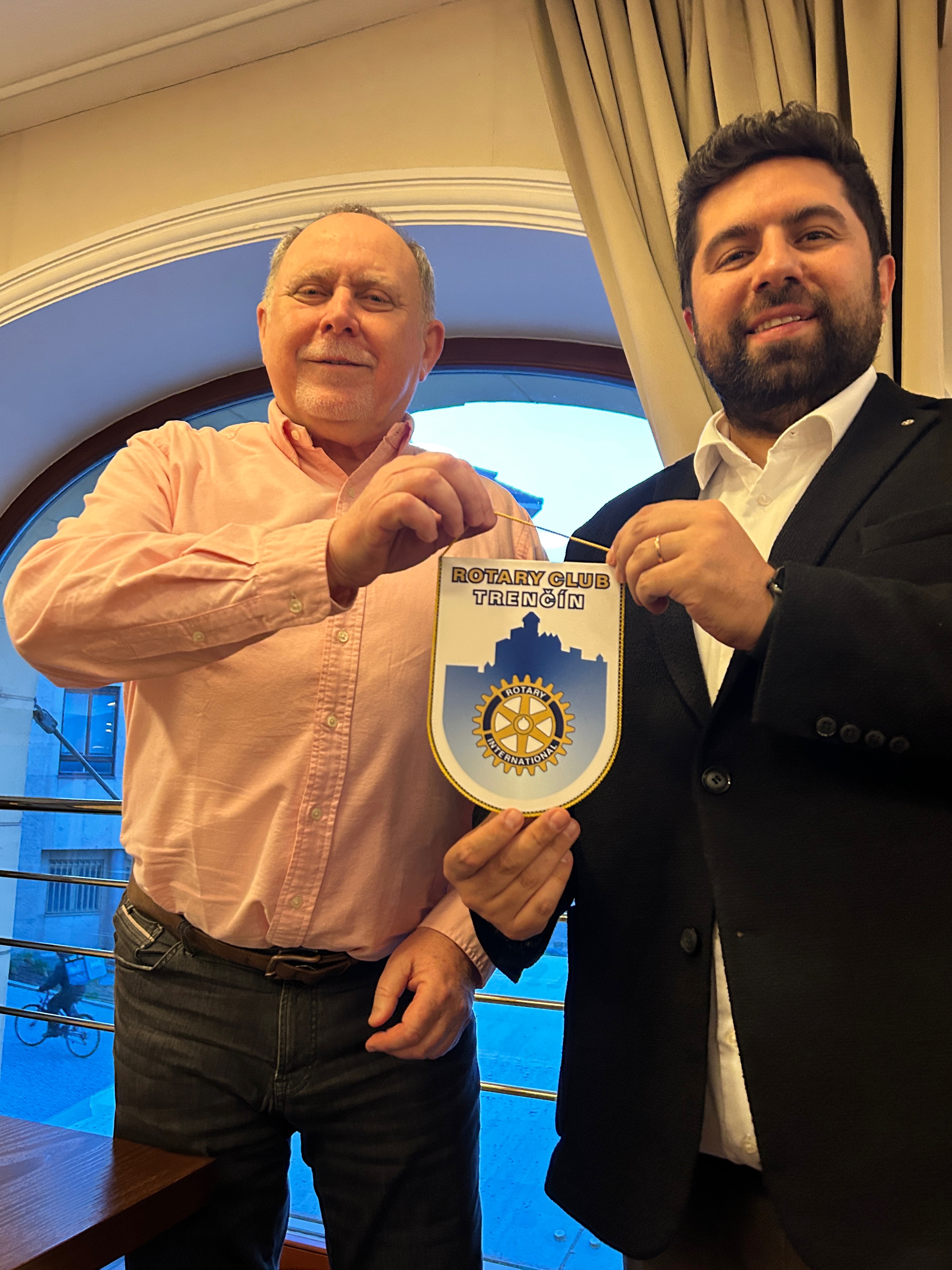 Prezident ROTARY CLUB Trenčín Vlado Koštial odovzdal Esenovi našu klubovú vlajočku.