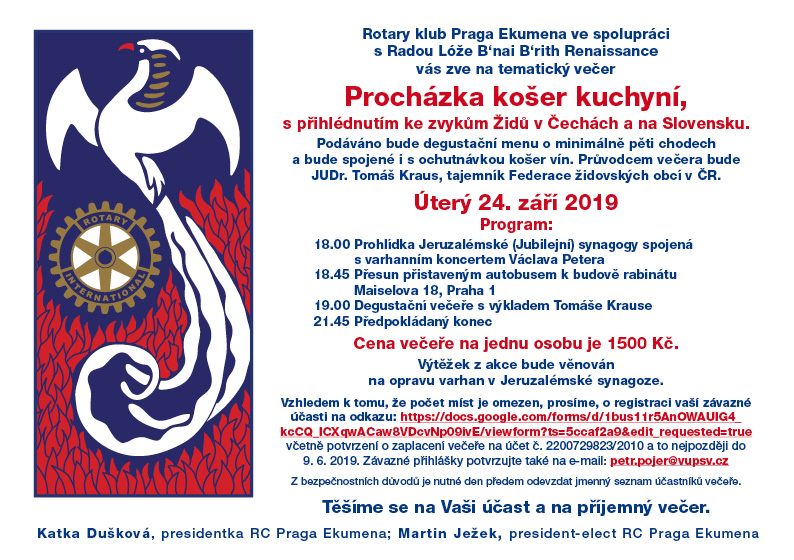 Podáváno bude degustační menu o minimálně pěti chodech a bude spojené i s ochutnávkou košer vín. Průvodcem večera bude JUDr. Tomáš Kraus, tajemník Federace židovských obcí v ČR.
