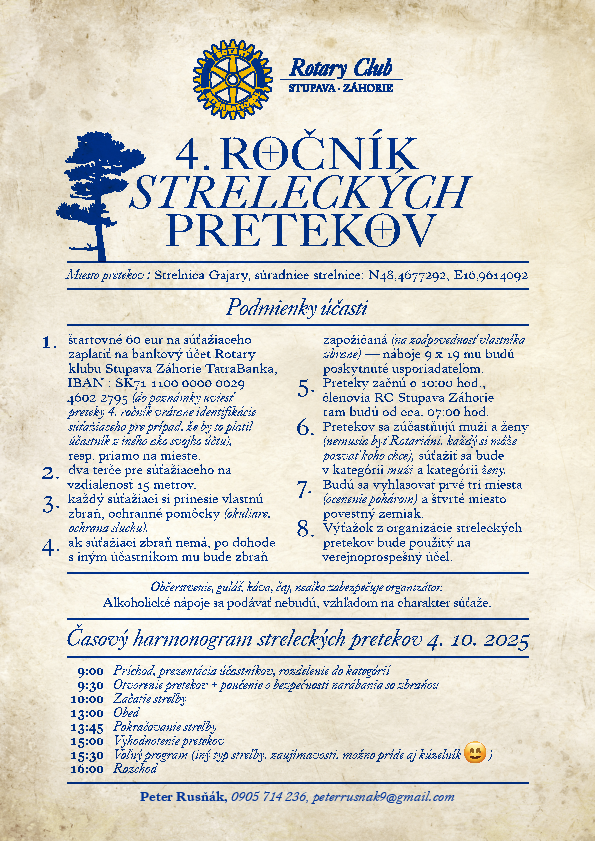 Rotary Club Stupava – Záhorie cordially invites all sports enthusiasts to the 4th edition of its shooting competition, taking place on October 4th, 2025 at the shooting range in Gajary. Proceeds from the event will go to a charitable cause.