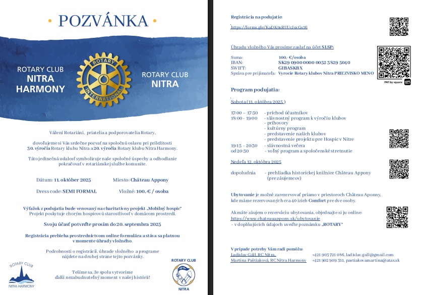 We warmly invite you to an exceptional occasion - the joint celebration of the 30th anniversary of Rotary Club Nitra and the 20th anniversary of Rotary Club Nitra Harmony. The event will be held in the historic surroundings of Apponyi Manor in Oponice on 11 October 2025, beginning at 17:00.