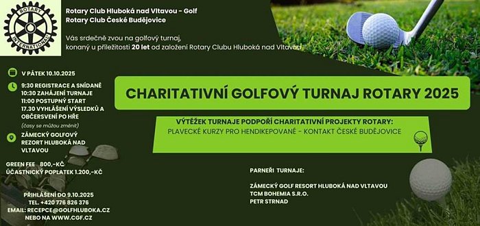On behalf of my friend, colleague, fellow Rotarian and outstanding golfer Honza Trstka, I would like to invite you to a charity golf tournament to be held on Friday, 10 October 2025 at Hluboká nad Vltavou.