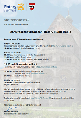 It has now been 30 years since the Rotary Club of Třebíč was re-established. During this time, we have achieved much that has benefited those in need of our assistance - be it support for people with disabilities or the encouragement of young students. Our 30th anniversary celebration is a rare opportunity to look back and reflect on our history.