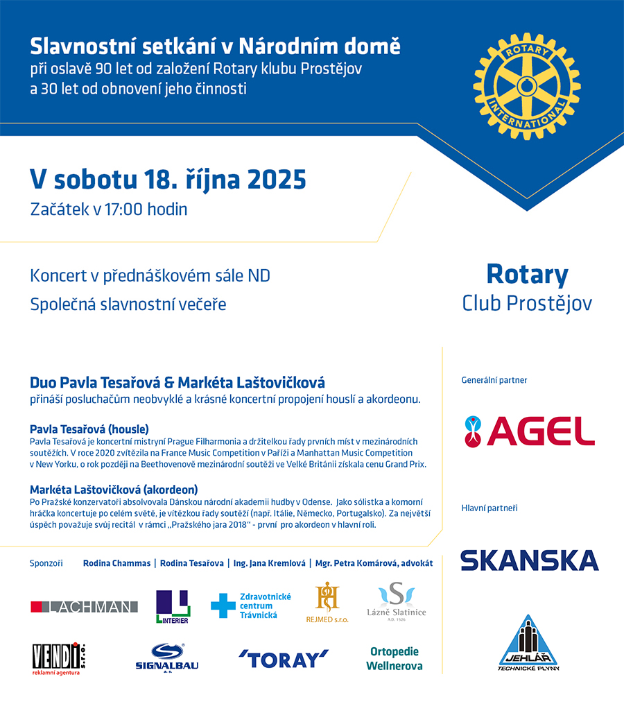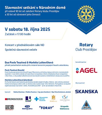 Rotary Club Prostějov warmly invites you to a festive event on the occasion of the 90th anniversary of the founding of Rotary Club Prostějov and the 30th anniversary of the renewal of its activities.