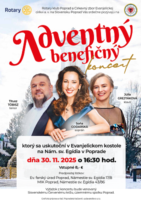 The Rotary Club of Poprad and the Parish of the Evangelical Church of the Augsburg Confession in Slovakia, Poprad, cordially invite you to an Advent charity concert, to be held in the Evangelical Church on St Egidius Square on 30 November 2025 at 4:30 p.m.