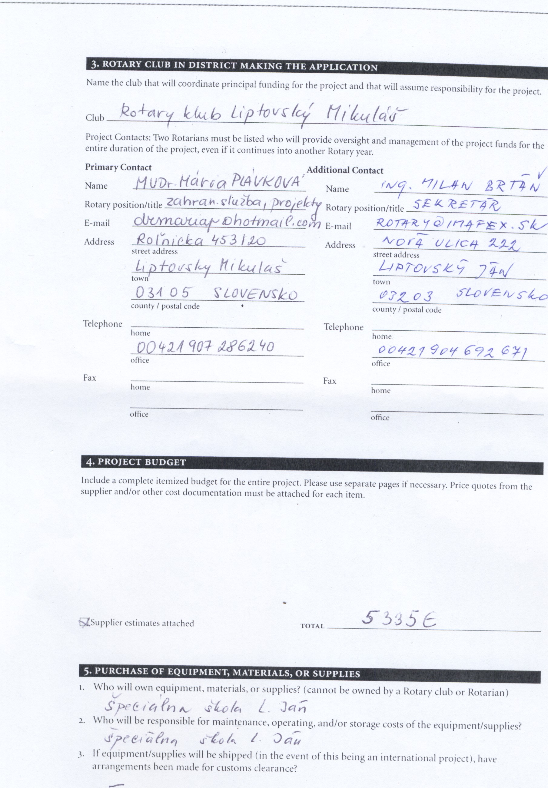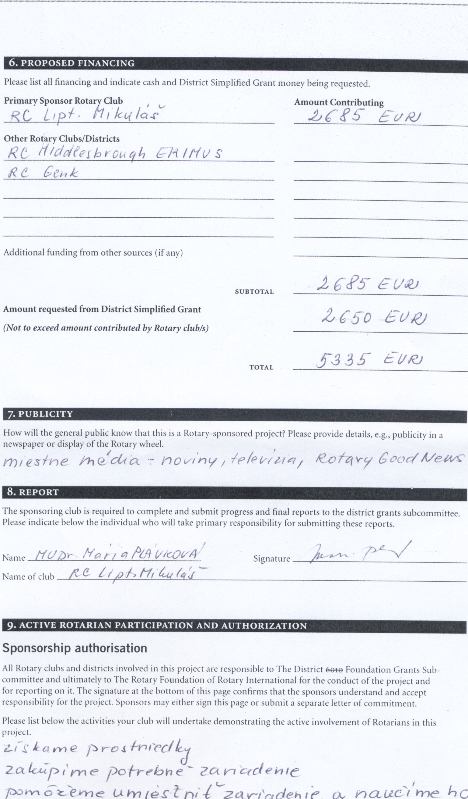 Rotary klub chce prostredníctvom prostriedkov svojich a distriktných zakúpiť prístrojové vybavenie pre toto pracovisko.