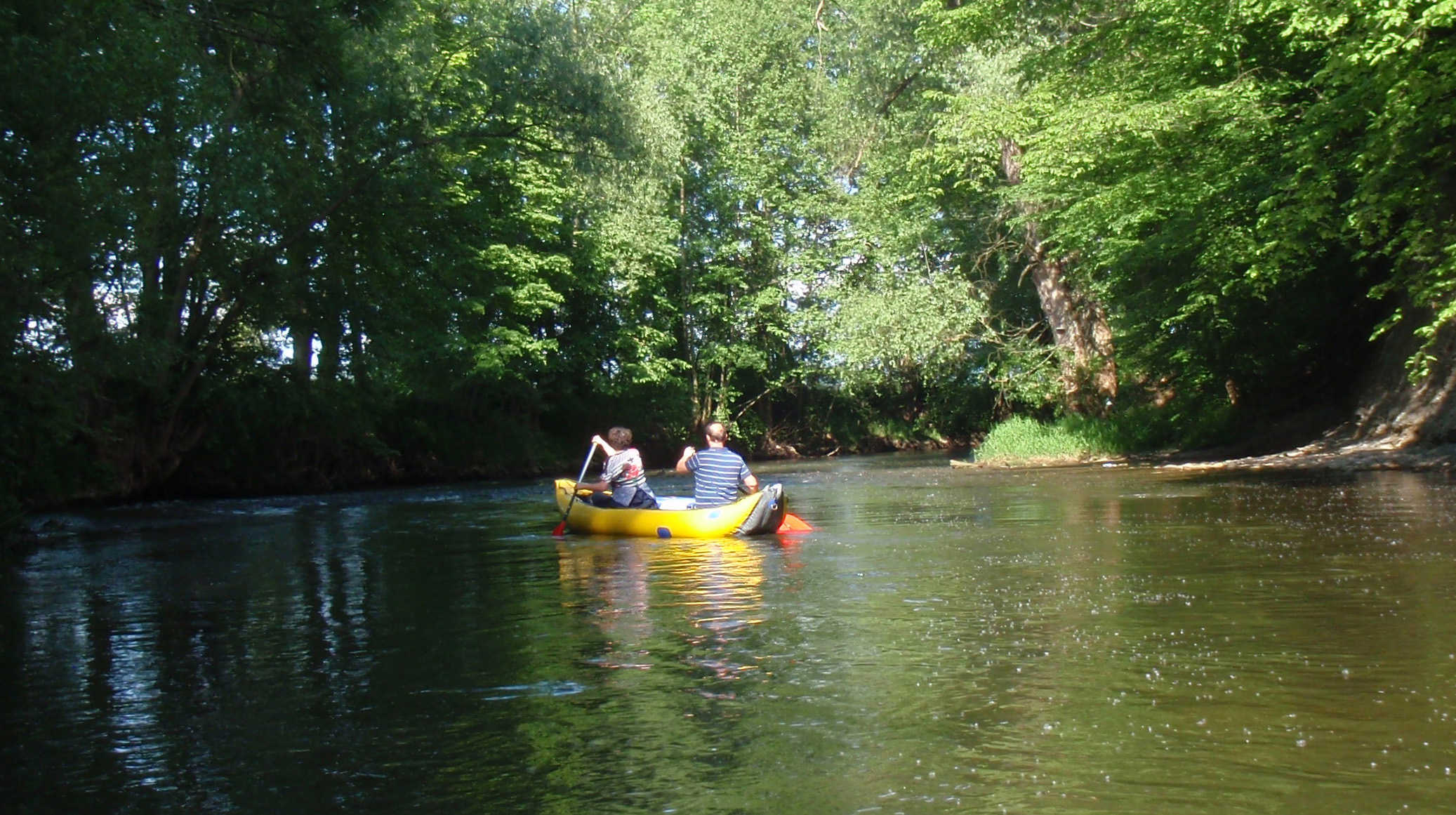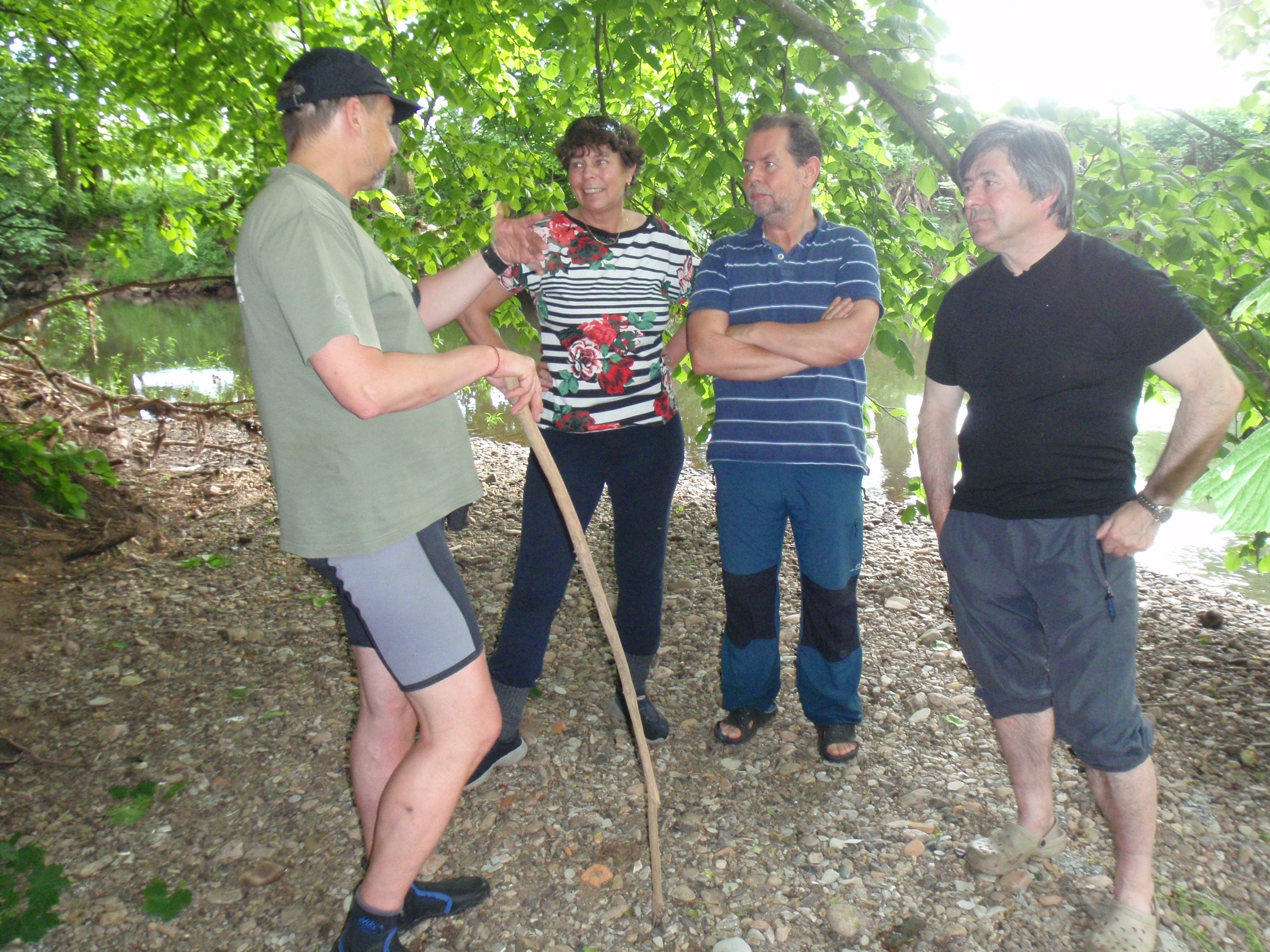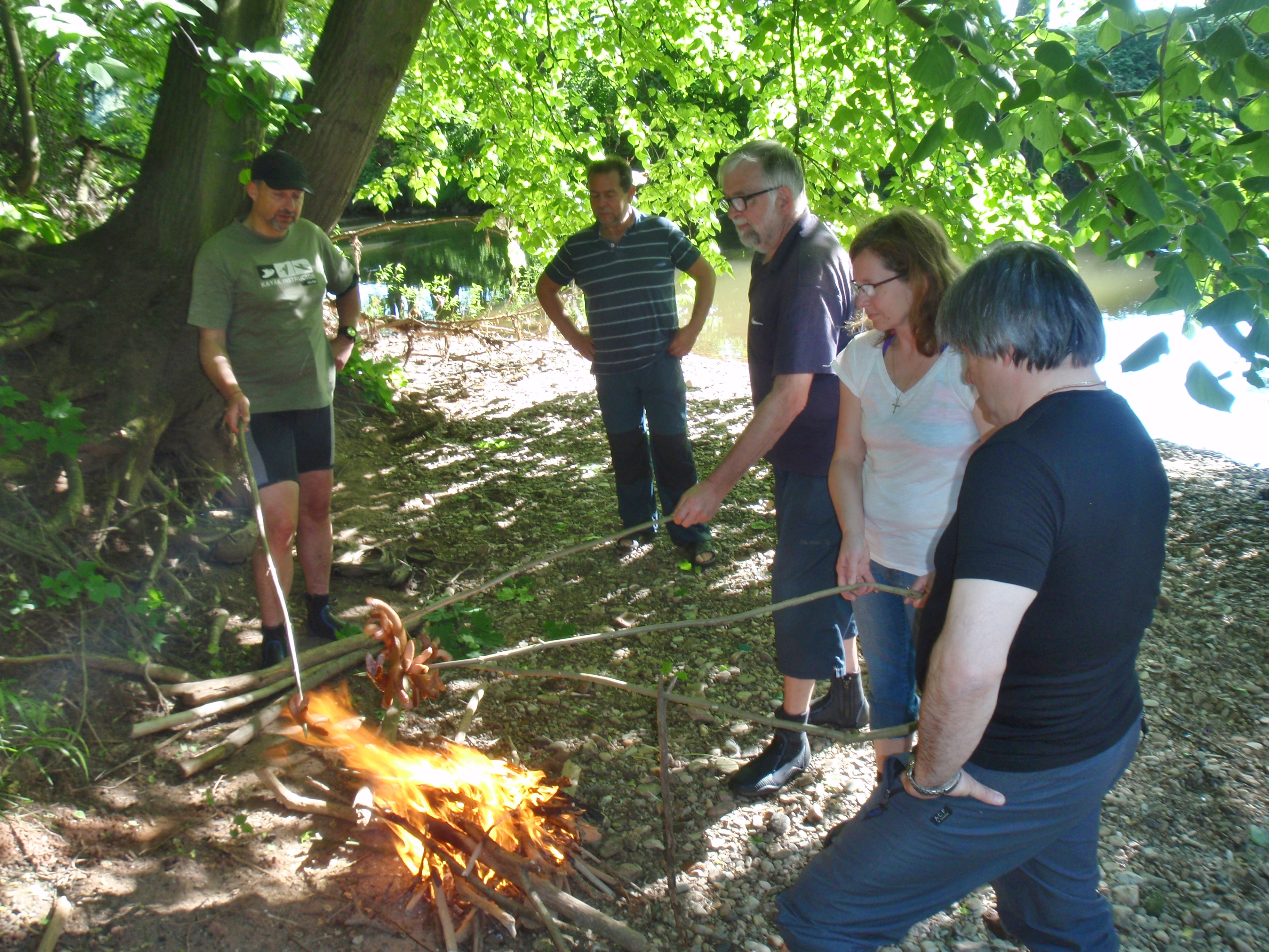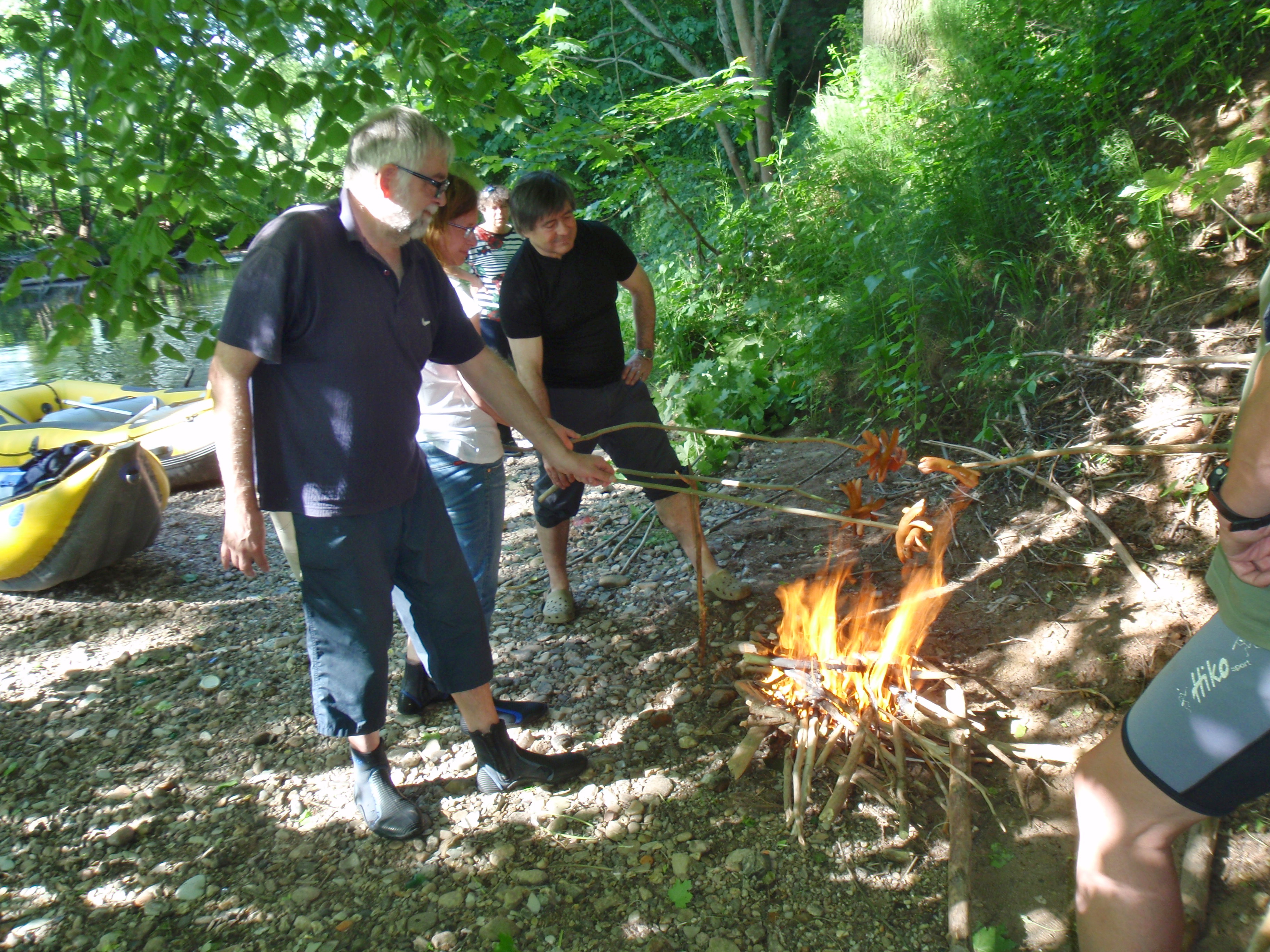 Občerstvovací zastávka pak byla zvolena asi po dalším kilometru jízdy. Bez papíru či dalších „mastňáckých“ pomůcek se Petru Sogelovi velmi brzy podařilo rozdělat oheň. Vzhledem k nízkému stavu vody bylo i v bezprostřední blízkosti řeky spousta suchého dříví. To bylo využito k opékání kvalitních párků z masny fy Šrol.