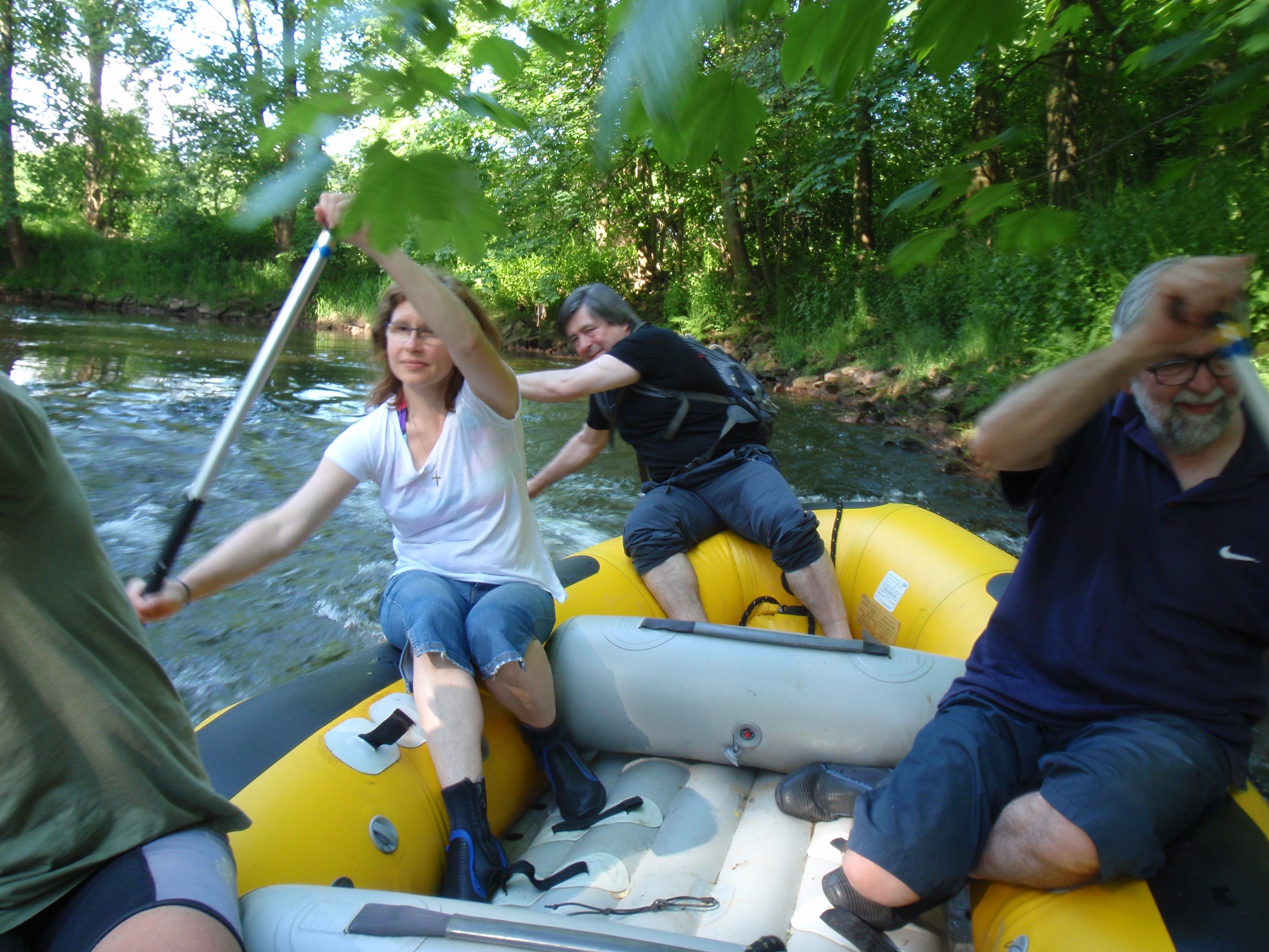 Po zkompletování osádky raftu se mohlo cca v 16,30 hod. vyrazit na cestu po Labi. V úvodní části sjížděné řeky se do čela propracovala posádka kanoe manželů Sogelových. Jejich vedení bralo osazenstvo raftu jako výzvu, jíž se iniciovalo zvýšené úsilí všech pěti členů posádky raftu toto pořadí změnit. Když ani zvýšená frekvence záběrů nepomáhala, bylo využito lsti zkušených vodáků. Nejbližší mělčina byla velmi halasně zvolena jako místo nejvhodnější pro grilování, a když u ní vedoucí kanoe přistála, původní záměr byl ihned změněn a raft v proudu proletěl na vedoucí pozici. Po celý zbytek jízdy si pak naše těžkotonážní plavidlo vedoucí pozici udržovalo, což vedlo k nadšení celé posádky raftu.