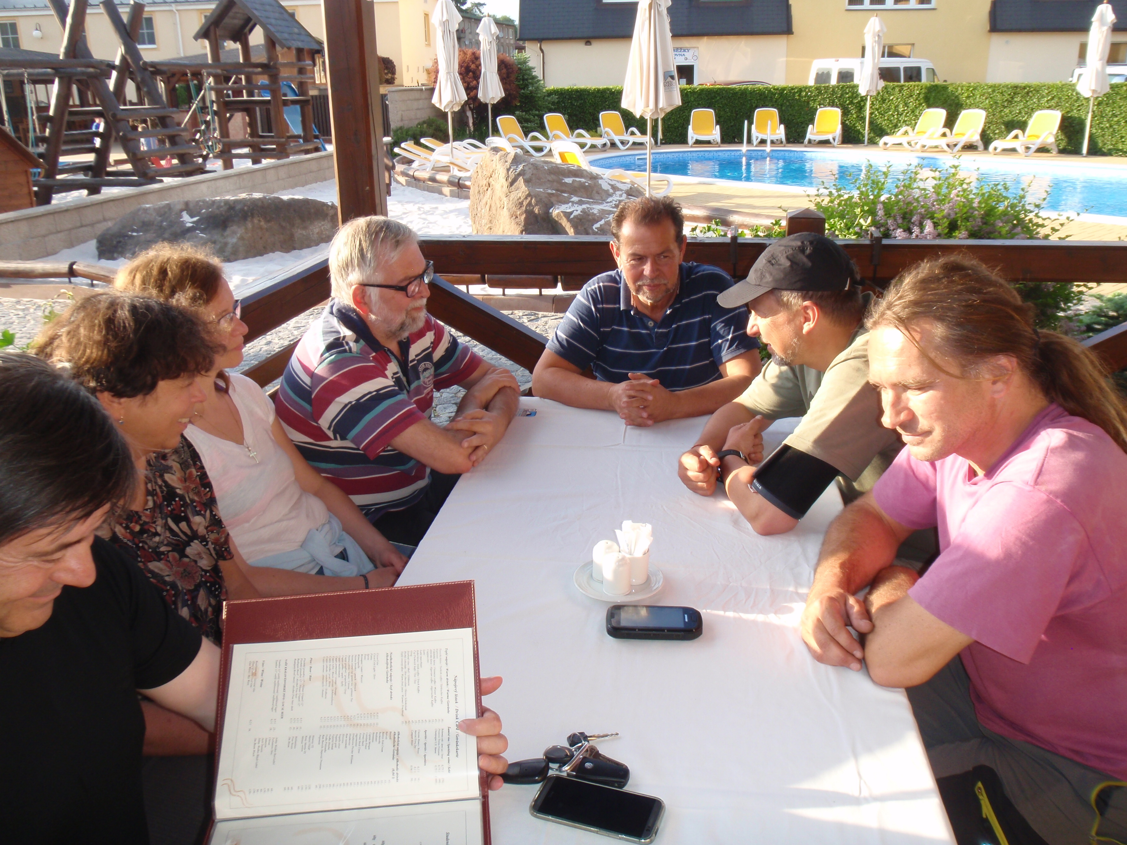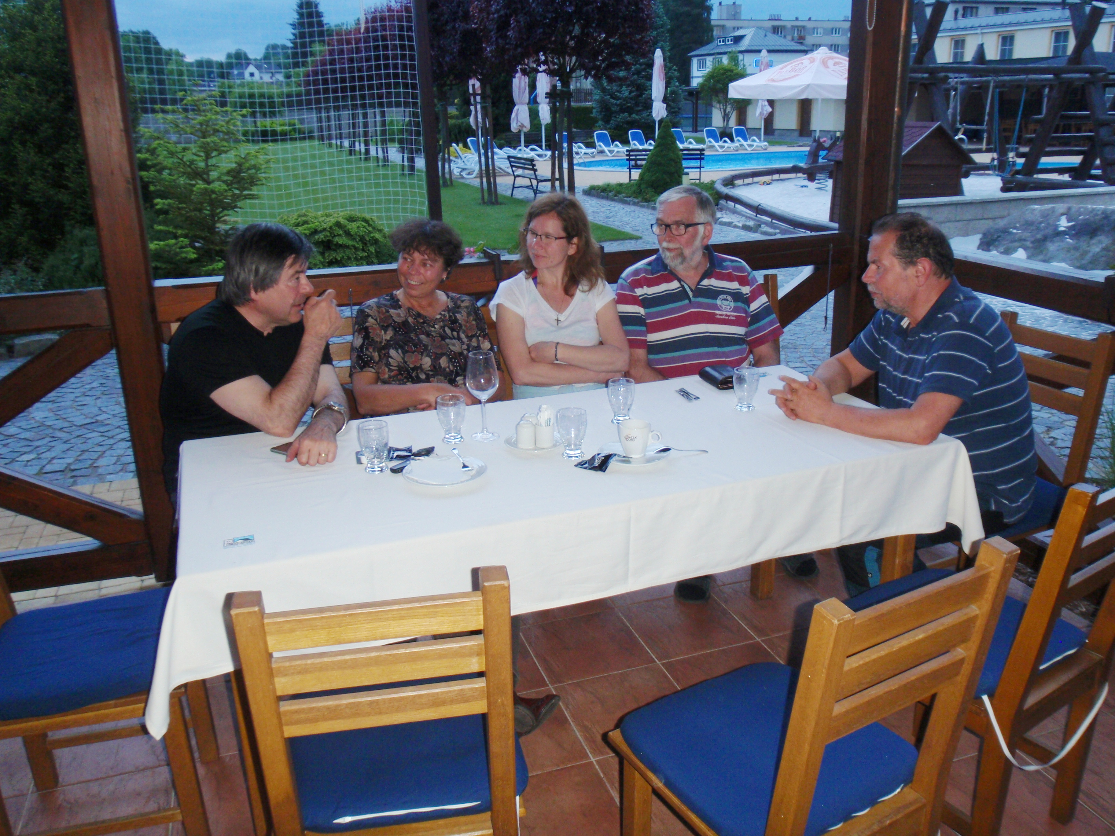 Velmi útulné prostředí velké restaurace penzionu vedlo k tomu, že přítel Karel Rada po prostudování jídelního lístku změnil původně objednanou společnou večeři na jednu ze specialit restaurace – jehněčí svíčkovou s noky a špenátem. Tato volba byla skutečným gurmánským vyvrcholením dne. O tento požitek se připravili manželé Sogelovi, paní Houdková a doprovázející řidič CK Klíč, kteří si zvolili místo speciality zdravou a sterilní zeleninu. Po pohodové večeři jsme si neodpustili kávu s různými typy desertů a diskutovali především o gastronomii. Přestože jsme seděli ve vnější části restaurace, ani jsme nezaznamenali drobný deštík spojený s překvapivým zhoršením počasí ani to, že čas pokročil tak rychle až do večerních hodin. Do Trutnova jsme se vrátili krátce po 21. hodině.