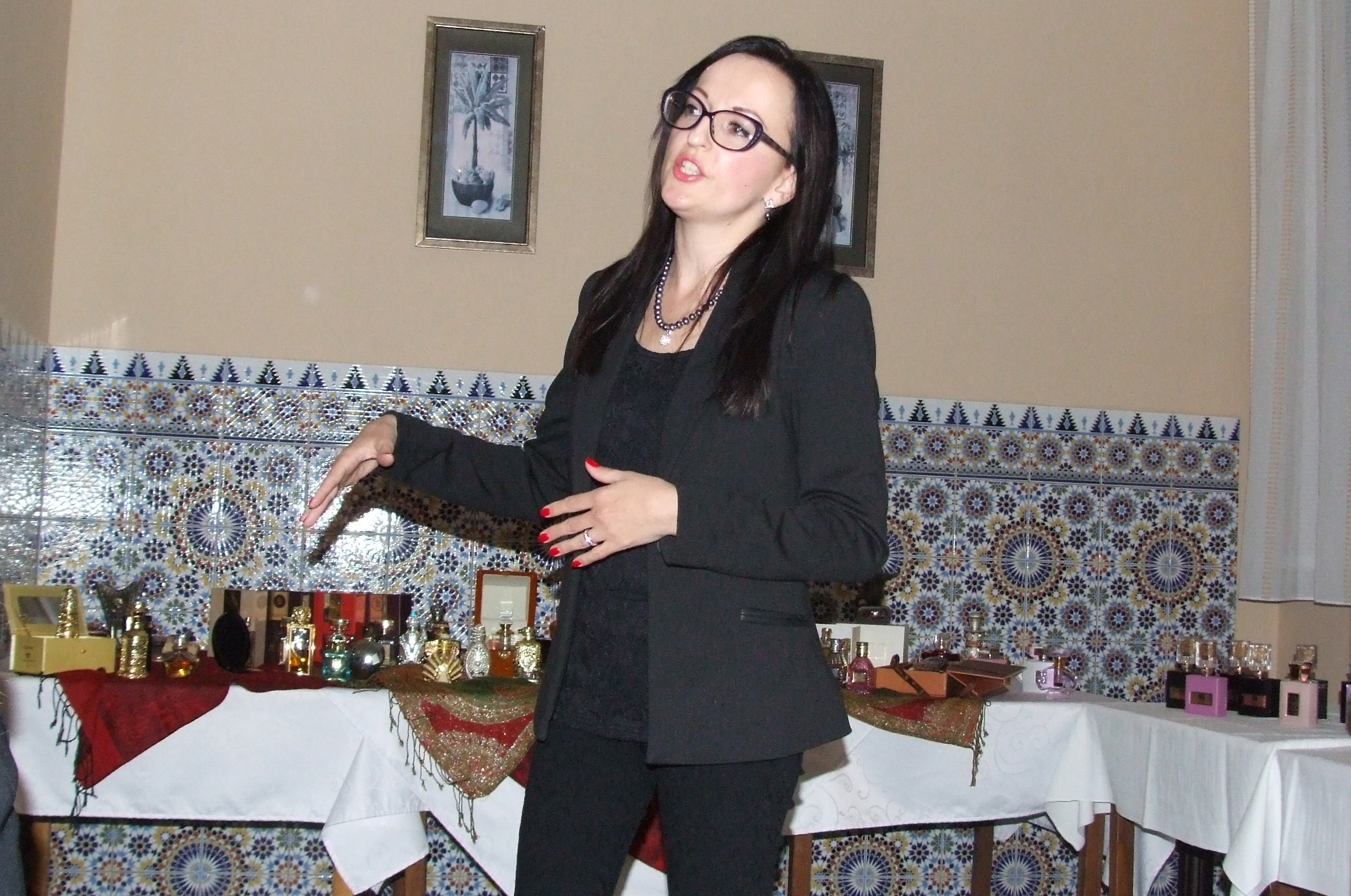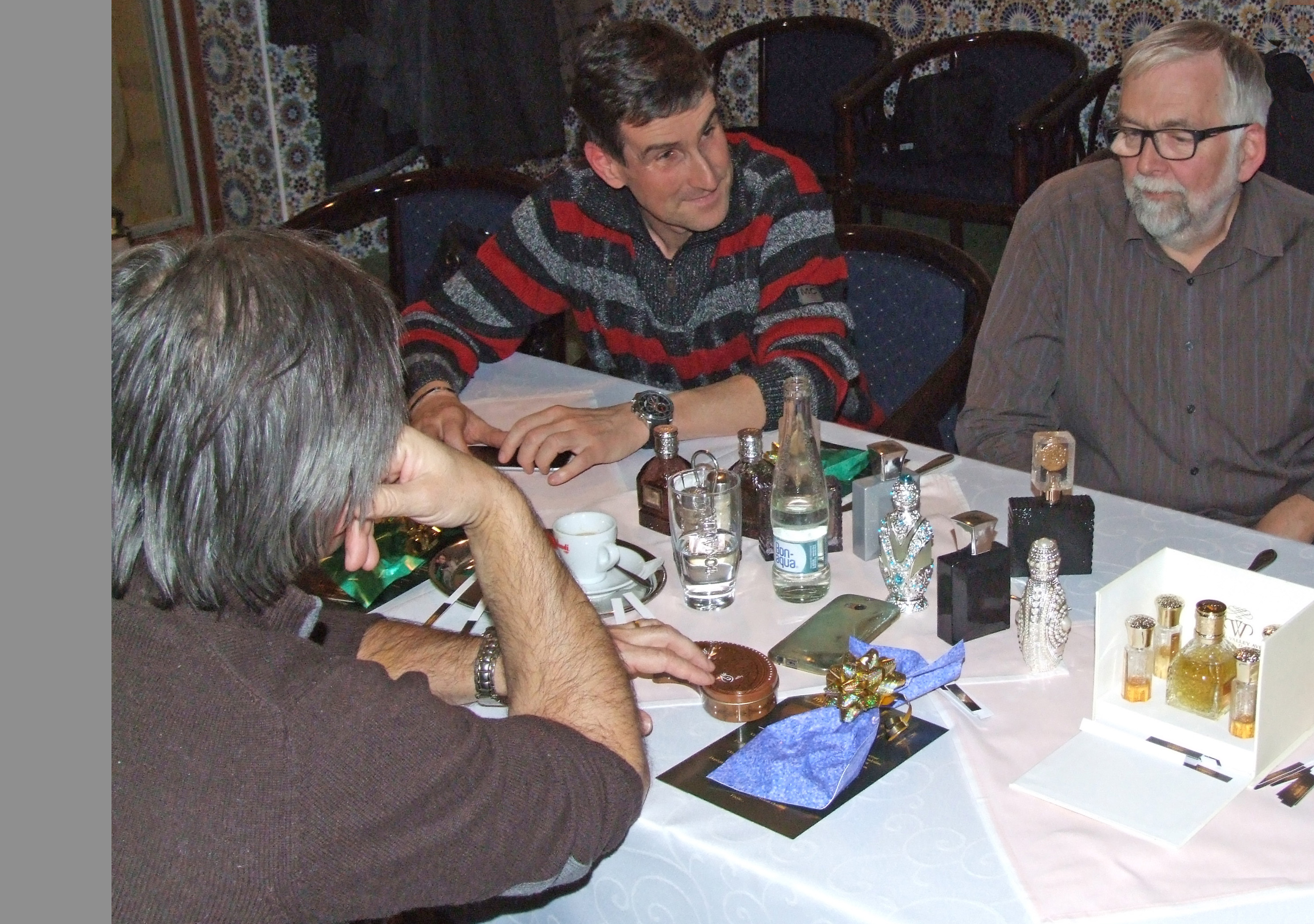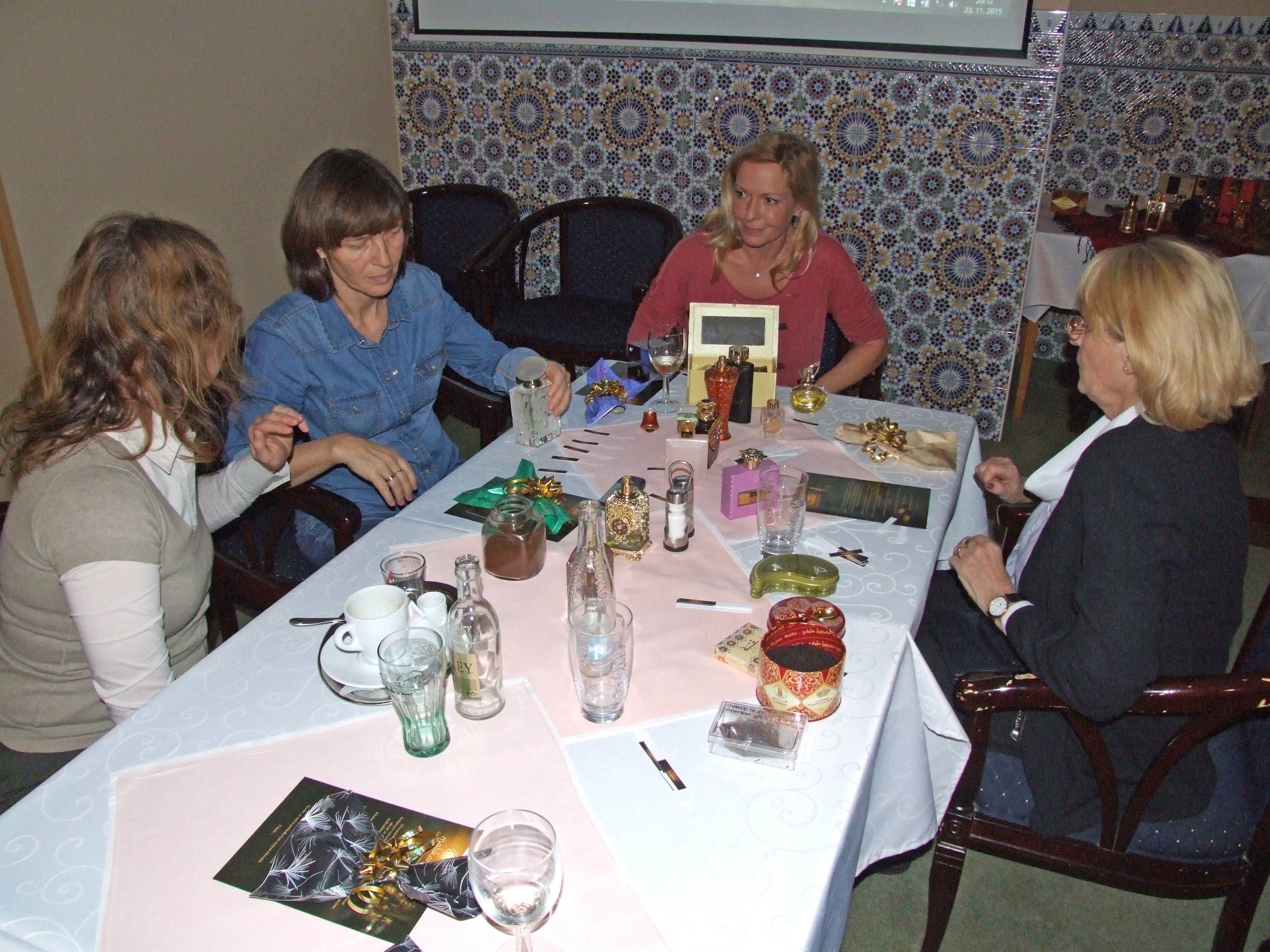 Po večeři představila paní Houdková hosta dnešní schůzky paní Renée Hájkovou, která je obchodní zástupkyní společnosti Malikab. V následující přibližně dvouhodinové části pí Hájková dataprojektorem prezentovala několik desítek fotografií ze svých cest do islámských zemí Arabského poloostrova, kde získává specifické arabské parfémy. V jakémsi teoretickém úvodu nám všem vysvětlila základní rozdíly ve složení arabských parfémů v porovnání s evropskou a americkou produkcí. Tím, že se arabské parfémy vyrábějí přidáváním různých přírodních rostlinných a živočišných vonných esencí na olejový základ, je tím zajištěna podstatně delší trvanlivost a kvalita vůně, v porovnání se známými evropskými parfémy, které mají alkoholový základ. Pí Hájková sama přiváží parfémy z jednotlivých arabských zemí, a tak má osobní zkušenosti s jejich specifikou výroby. Výroba parfémů má v této části světa mimořádně dlouhou tradici a je spojena s uznávanými osobnostmi, mnohdy spřízněnými s panovnickými rodinami. Velká pozornost je zde věnována i samotným nádobkám, v nichž se parfémy uchovávají. Mají nejen nespornou kvalitu, ale mnohdy i uměleckou hodnotu. Tvary i zdobnost flakonů je pro některé z arabských distributorů zcela speciální. Paní Hájková do své předváděcí akce zařadila i ukázku jakési vykuřovací nádoby a adekvátní látky, které se v arabských státech využívají k provoňování domů, oděvů či vlasů. V další části svého vystoupení nám začala prezentovat jednotlivé parfémy, které si na naši schůzku s sebou přinesla. Vedle popisu jejich složení a charakteristiky zajistila i individuální testování jednotlivých vůní. Nejprve kolovaly testovací papírky, později celé flakony. Jednotliví účastníci prezentace se snažili najít v záplavě vůní ty, které se jim zdály být nejpříjemnější. V této části schůzky se zcela přirozeně vyselektovaly tři skupiny testujících. Manželky členů našeho Rotary klubu si sedly pohromadě, aby si mohly navzájem konzultovat své čerstvě získané poznatky a z nich odvodit další postup finalizující v nákupu určité značky parfému. Druhou, stejně početnou skupinu, vytvořila mužská část osazenstva. V této skupině byl poněkud skeptičtější přístup k přehršli čichových vjemů, nicméně i zde v ojedinělých případech (v tomto ohledu vynikal především Karel Rada) docházelo k pokusům o systematizaci vůní nejprve formou testovacích papírků, později celých flakonů. Třetí nejméně početnou skupinku tvořily dcerky Richarda F. a Karla R., jež zatím ještě svodům parfemů nepodlehly, neboť v získávání nebo vytváření image mají zatím naprosto jiné preference, než je vůně.