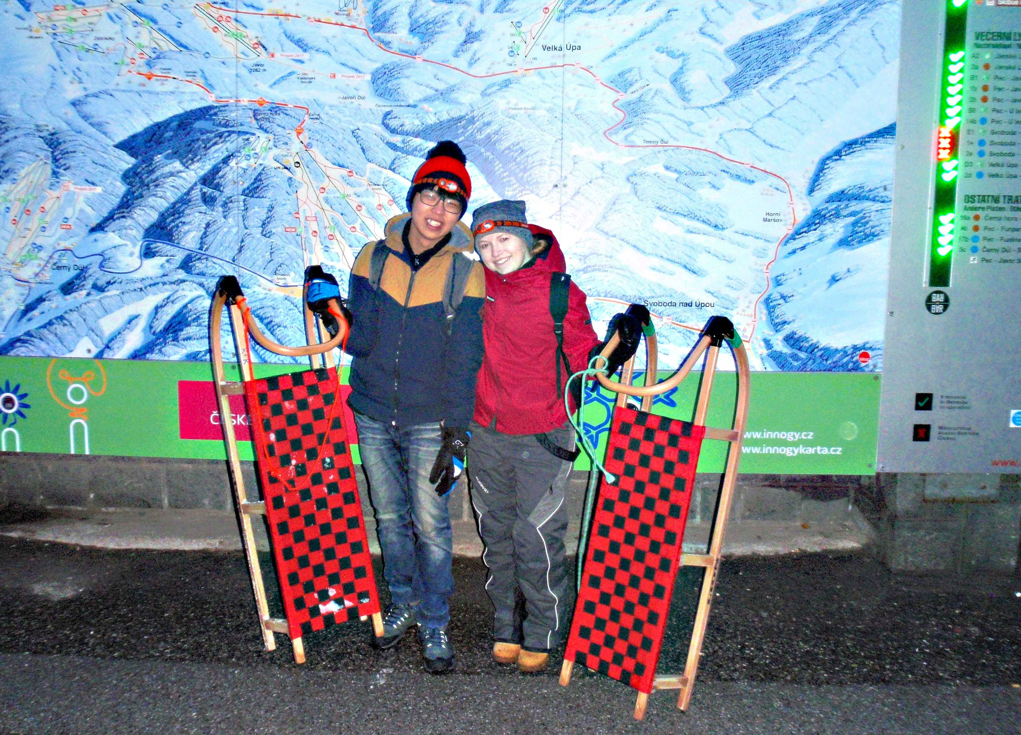 První únorová schůzka RC se uskutečnila v Jánských Lázních. Na programu schůzky bylo sportovní vyžití členů klubu spojené s upevněním přátelských vztahů mezi rotariány a jejich rodinnými příslušníky. Schůzky se s nadšením zúčastnili i oba naši zahraniční studenti. Organizátorem celé schůzky byl místní Past president Vašek Němec. Sraz všech účastníků byl v 16.45 hodin. Ve stanovenou dobu byl na místě srazu u půjčovny saní jen Honza Doubek s chotí, tedy člen RC s nejvzdálenějším bydlištěm. Ostatní účastníci naplánovaného sjezdu Černé hory na saních se stačili dostavit rovněž do 17.00 hodin. Zapůjčení saní a čelových svítilen proběhlo během několika minut, a tak jsme se mohli přesunout k budově se spodní stanicí kabinkové lanovky. Odjezd lanovky se poněkud opozdil, čímž vzniklo dost času na fotografování před mapou zdejšího lyžařského areálu i na prohlídku pohyblivého modelu původní kabinkové lanovky, který je instalován uvnitř budovy. V 17.30 jsme se již začali přepravovat lanovkou na vrchol Černé hory. Počasí bylo pro naši akci celkem příznivé, neboť bylo jen těsně pod 0o C a nefoukal ani vítr. Inverzní ráz počasí se projevoval v jasné obloze na vrcholu a nízké oblačnosti v nižších polohách. Po nenápadně značené sáňkařské dráze se nás vydalo celkem 12. Sjezd Černé hory na saních se stal naší tradiční každoroční zimní klubovou akcí již asi před 5 lety. Proto můžeme průběh jednotlivých sjezdů poměrně dobře srovnávat. Letošní sjezd byl poznamenán výrazně větší vrstvou sněhu, než v předchozích letech. Současně se projevila poněkud zanedbaná péče o kvalitu sáňkařské dráhy. Oba tyto vlivy způsobily, že trať, po níž jsme se tentokrát vydali, nebyla dostatečně zpevněná a saně se do neupraveného sněhu na řadě míst bořily. To negativně ovlivňovalo zejména rychlost sjezdu. Nedostatečné úprava sáňkařské dráhy a její značné využívání mělo za následek velkou nerovnost povrchu. V některých místech byly v cestě, až půlmetrové jámy, v nichž se někdy při pomalejší jízdě saně úplně zastavily a sáňkař je v důsledku setrvačnosti nechtěně upustil. Naštěstí se ani při těchto karambolech nikdo nezranil. Až v nejspodnější části sáňkařské trasy byl povrch sněhu upraven, čímž jsme si připomněli, jak jsme jezdili rychle a plynule bez kodrcání v minulých letech. Větší sněhová vrstva nám, na rozdíl od minulých let, umožnila dojet se saněmi prakticky až ke vchodu do budovy se spodní stanicí lanovky. Ti, kteří absolvovali předchozí sáňkařské sjezdy Černé hory, letošní sjezd posuzovali kriticky. Ti, kteří s námi sjezd absolvovali poprve, byli spokojeni a akci si pochvalovali jako zdařilou.