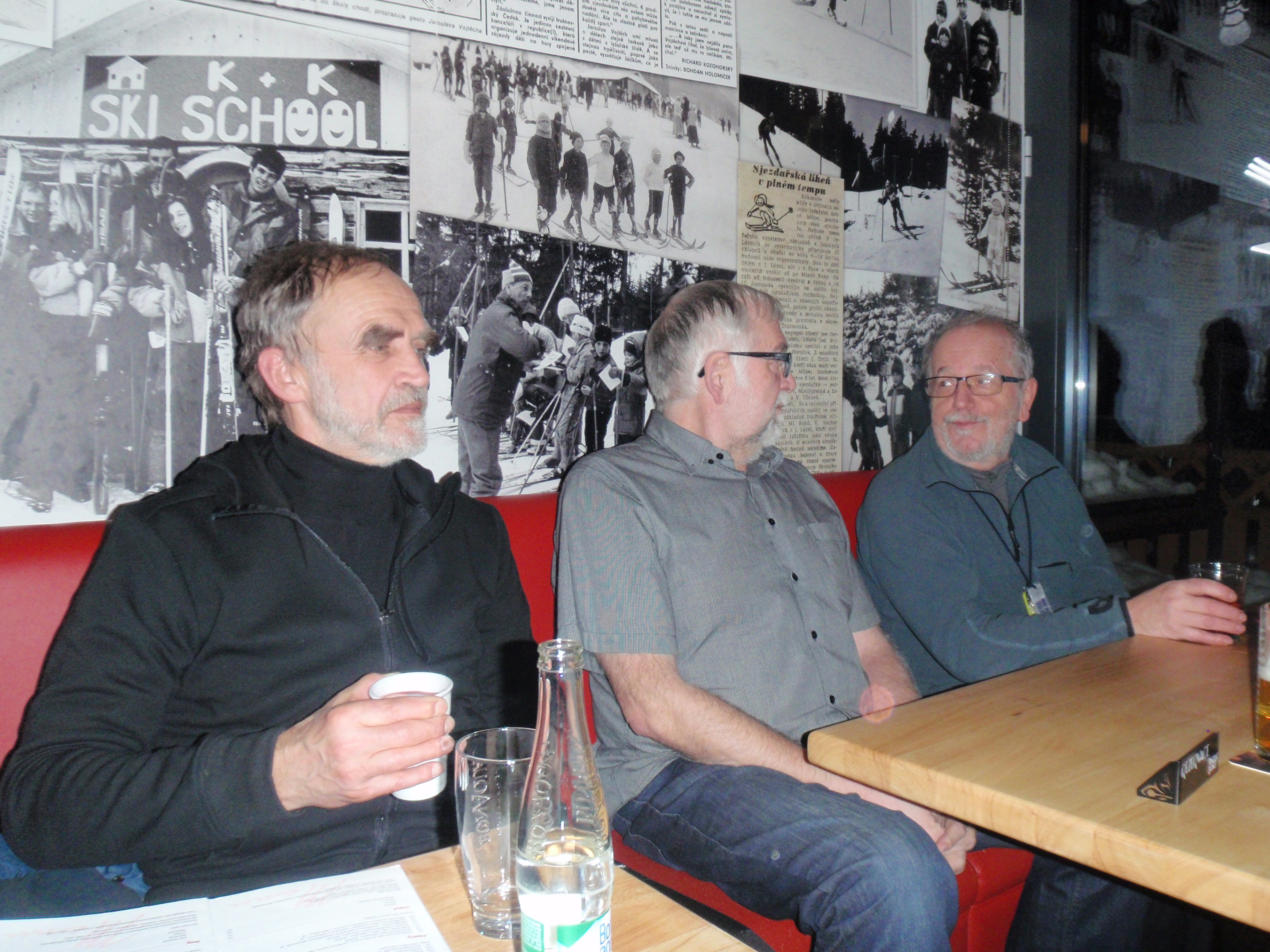 Po dojezdu jsme vrátili zapůjčené saně a čelové svítilny do Ski Rent Shopu a přesunuli jsme se do přízemí téže budovy, kde jsme měli zarezervovaná místa v restauraci Karmela. Tam jsme po předchozím sportovním výkonu doplnili tělesné tekutiny a objednali si večeře. Dalších cca 40 minut jsme využili k vylíčení strastí předchozí sportovní akce a k neformální přátelské diskusi. Až při konzumaci objednaných večeří jsme si připoměli, že i při loňské návštěvě téže restaurace byli nejspokojenější ti z nás, kteří zvolili jako hlavní chod pečenou kachnu se zelím a knedlíky. Ostatní dietněji laděné večeře nás přece jen tolik nenadchly. Nejmladší účastníci si doplnili jídelníček o mohutný zmrzlinový pohár, který v nich zmizel s rekordní rychlostí. Tím byli v druhé fázi naší společné akce spokojeni snad úplně všichni. Až v této závěrečné části doplnili naši početnou skupinu Jirka Malinský a Richard Houdek, kteří pro své pracovní zaneprázdnění nemohli absolvovat předchozí sportovní část našeho setkání, ale svou účast na klubové akci si nemohli nechat ujít.