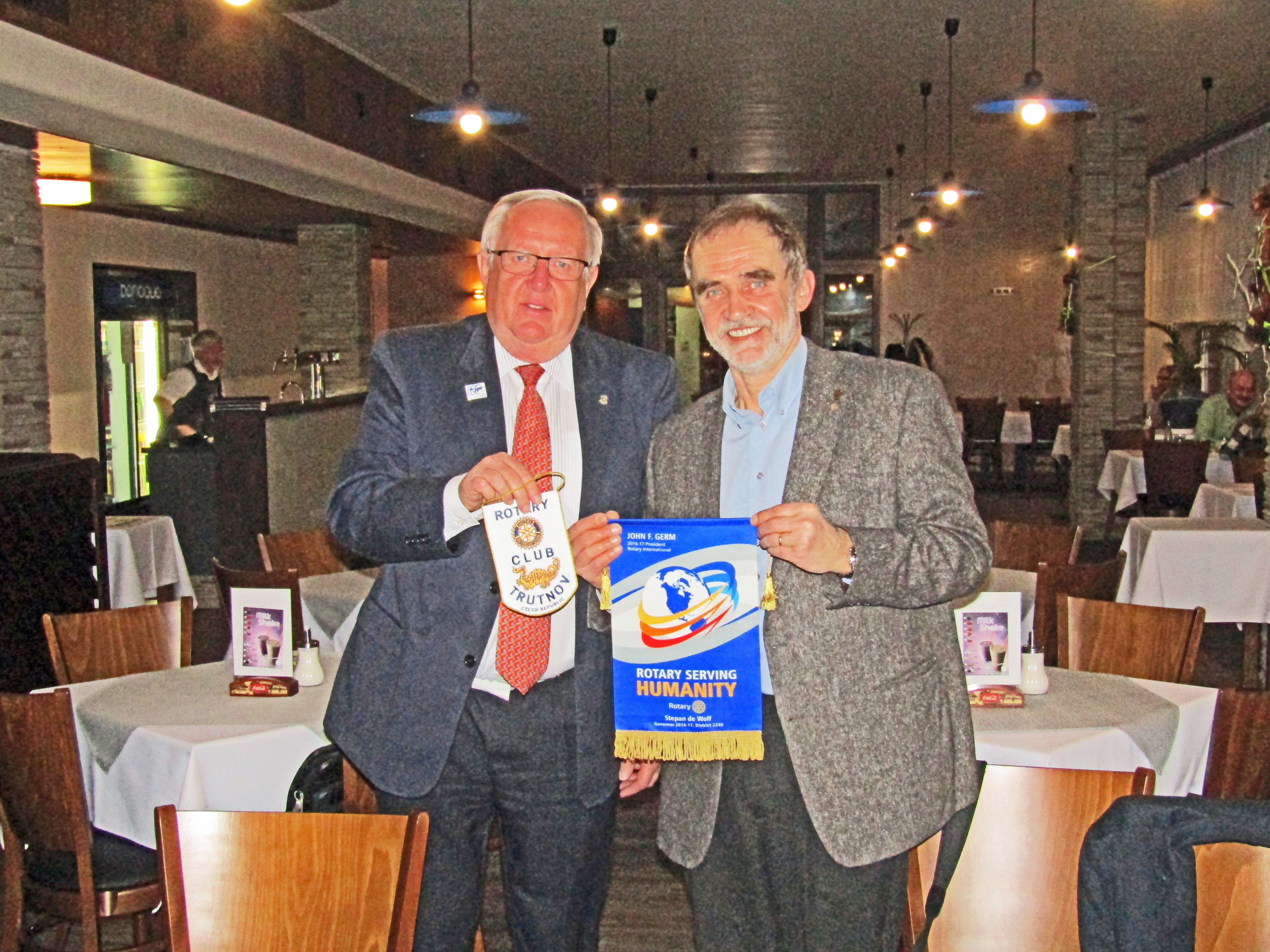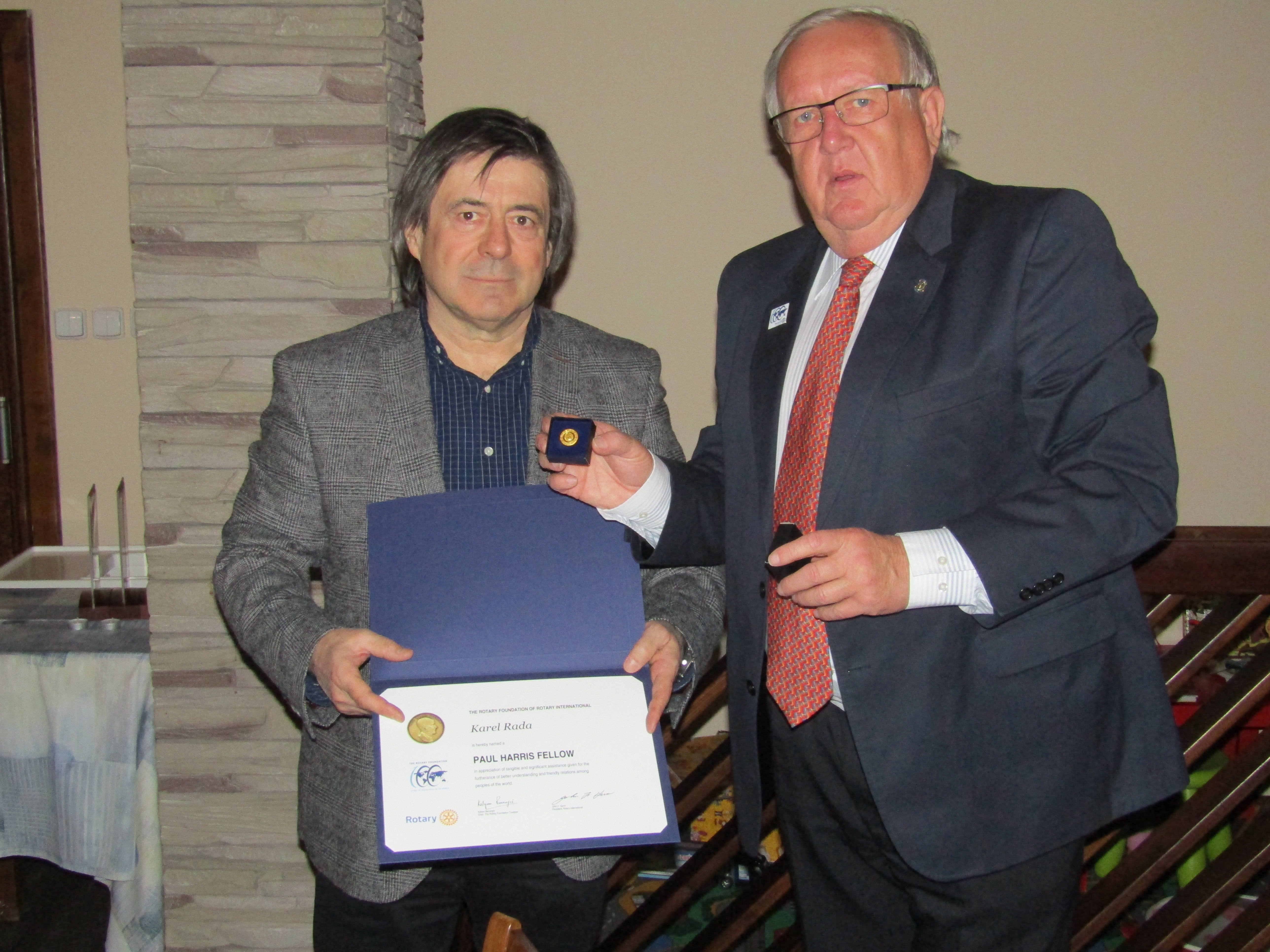 Po večeři se slova ujal guvernér Distriktu 2240 Štěpán de Wolf. Informoval nás, že jeho účasti na naší schůzce předcházely návštěvy drtivé většiny Rotary klubů v rozsahu „od Chebu po Košice“. Své poznatky o činnosti klubů, které přitom načerpal, pak využíval v průběhu celého večera. První část svého vystoupení věnoval guvernér svým oficiálním povinnostem. První z nich bylo předání guvernérské vlaječky našemu klubu a převzetí naší klubové vlaječky. V této souvislosti poznamenal, že ač je již vlastníkem více než 50 vlaječek českých i slovenských Rotary klubů, které jako guverner navštívil, vlaječku s dračím symbolem získal až u nás v Trutnově. Další dekorování souviselo s předáváním rotariánského vyznamenání. Vedení našeho RC navrhlo již před rokem Karlu Radovi za jeho aktivní činnost při práci s mládeží v souvislosti se zahraničními výměnami studentů udělení ocenění Paul Harris Fellows. Předání vyznamenání na Rotary konferenci v Ostravě v loňském roce se Karel nemohl z pracovních důvodů zúčastnit. Proto mohl předání vyznamenání uskutečnit až následující guvernér Distriktu 2240 Štěpán de Wolf. Další ocenění z rukou guvernéra získal náš Rotary klub rovněž Karlovou zásluhou. Již před dvěma roky Karel získal do našich řad dva nové členy Martina Veselého a Michala Šubrta. Rozšiřování členské základny našeho Rotary klubu ocenil dokonce president Rotary International za rok 2015-16 K. R. Ravindran Čestným uznáním našemu klubu za nejvyšší míru rozšiřování počtu členů v rámci našeho Distriktu 2240. Šlo vlastně o rozšíření počtu členů v RC o 16,6%. Až v následujícím roce 2016-17 se prokázalo, že přijímání těchto dvou nových členů nebyl příliš úspěšný počin. Jejich zapojení do činnosti klubu prakticky po roce úplně ustalo a po tragickém úmrtí Martina se ani Michal našich schůzek nezúčastňuje. Po sdělení této informace nás guvernér vyzval, abychom přijetím dalšího člena potvrdili opodstatněnost uděleného „Čestného uznání“od Rotary International.
