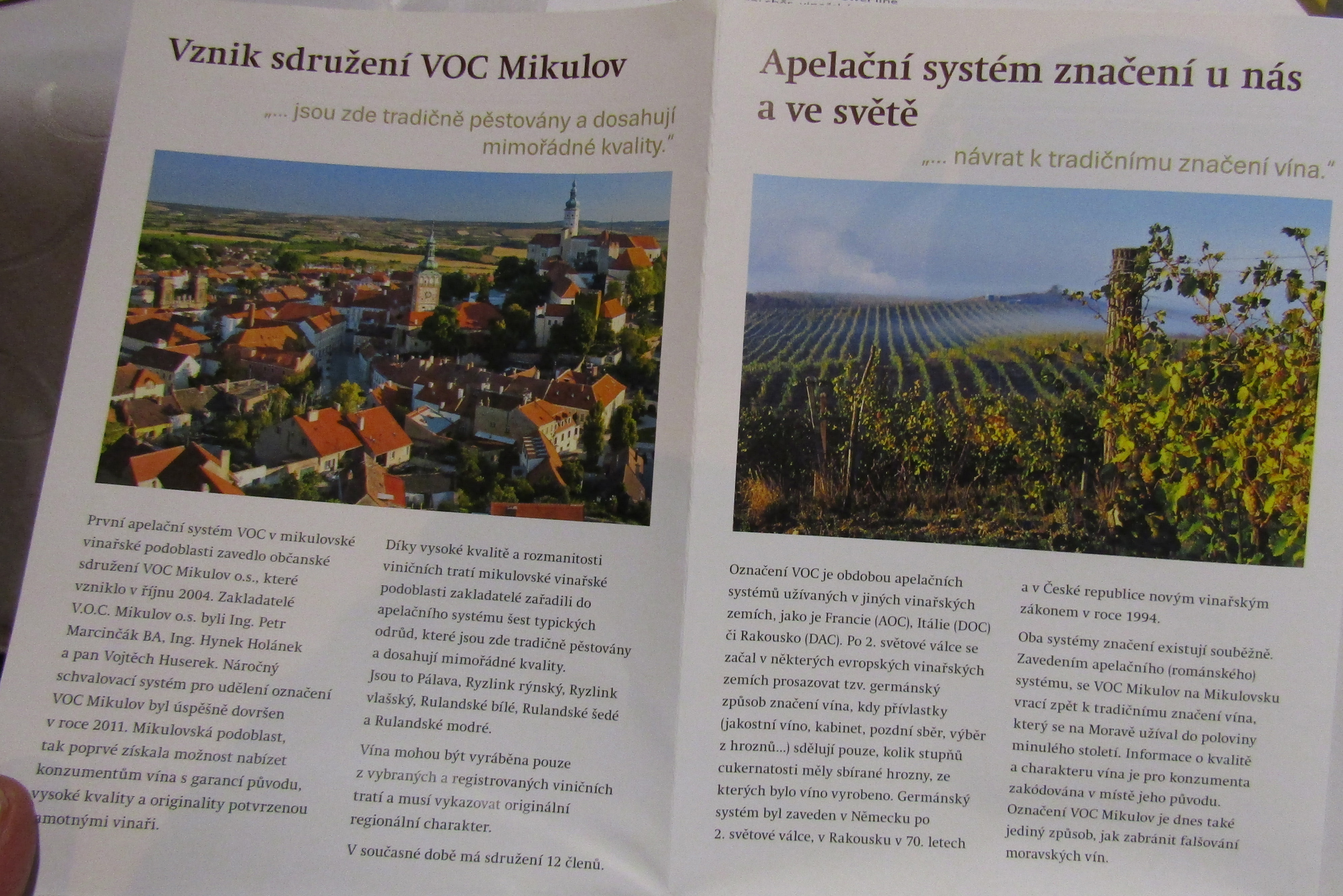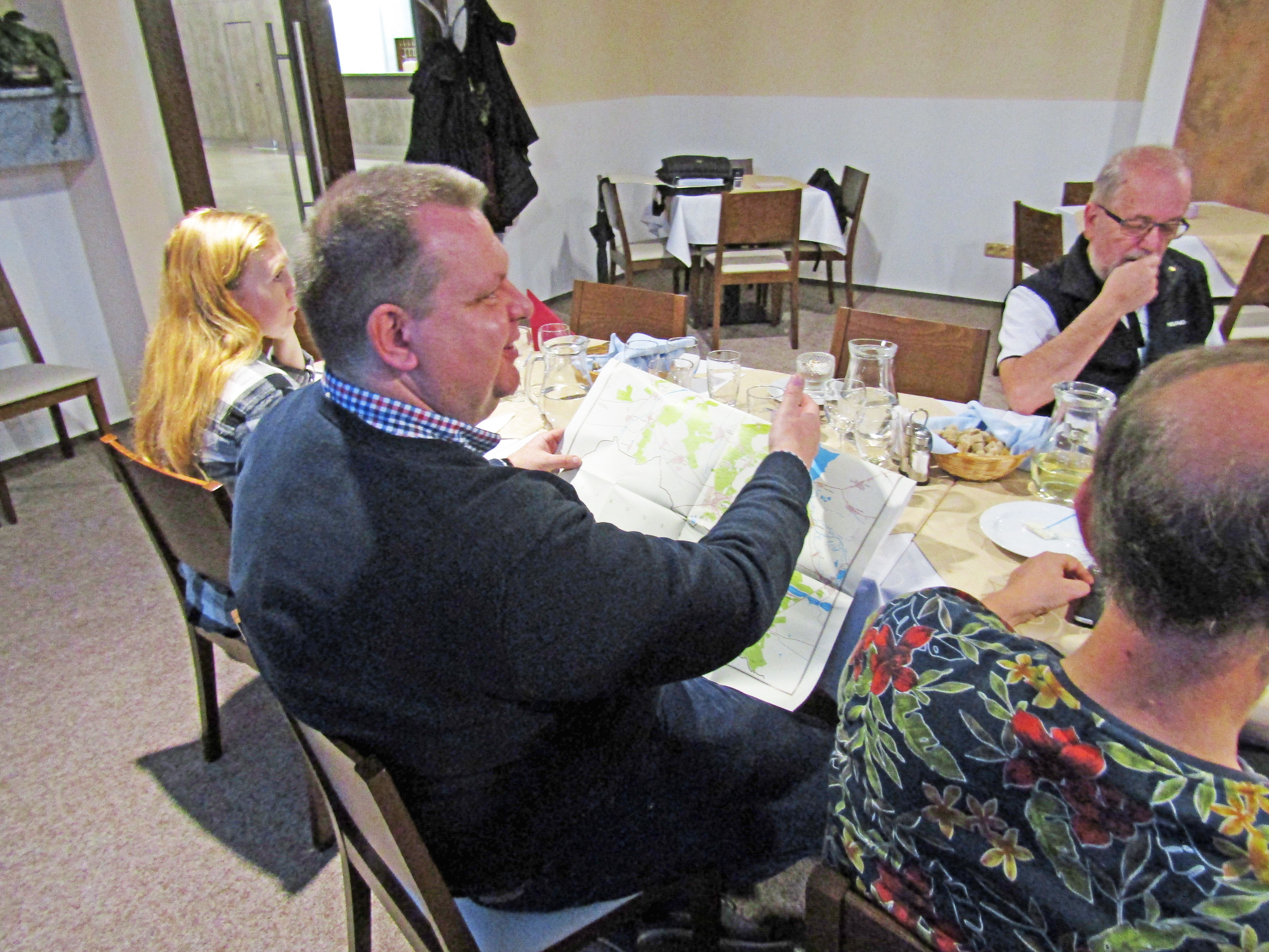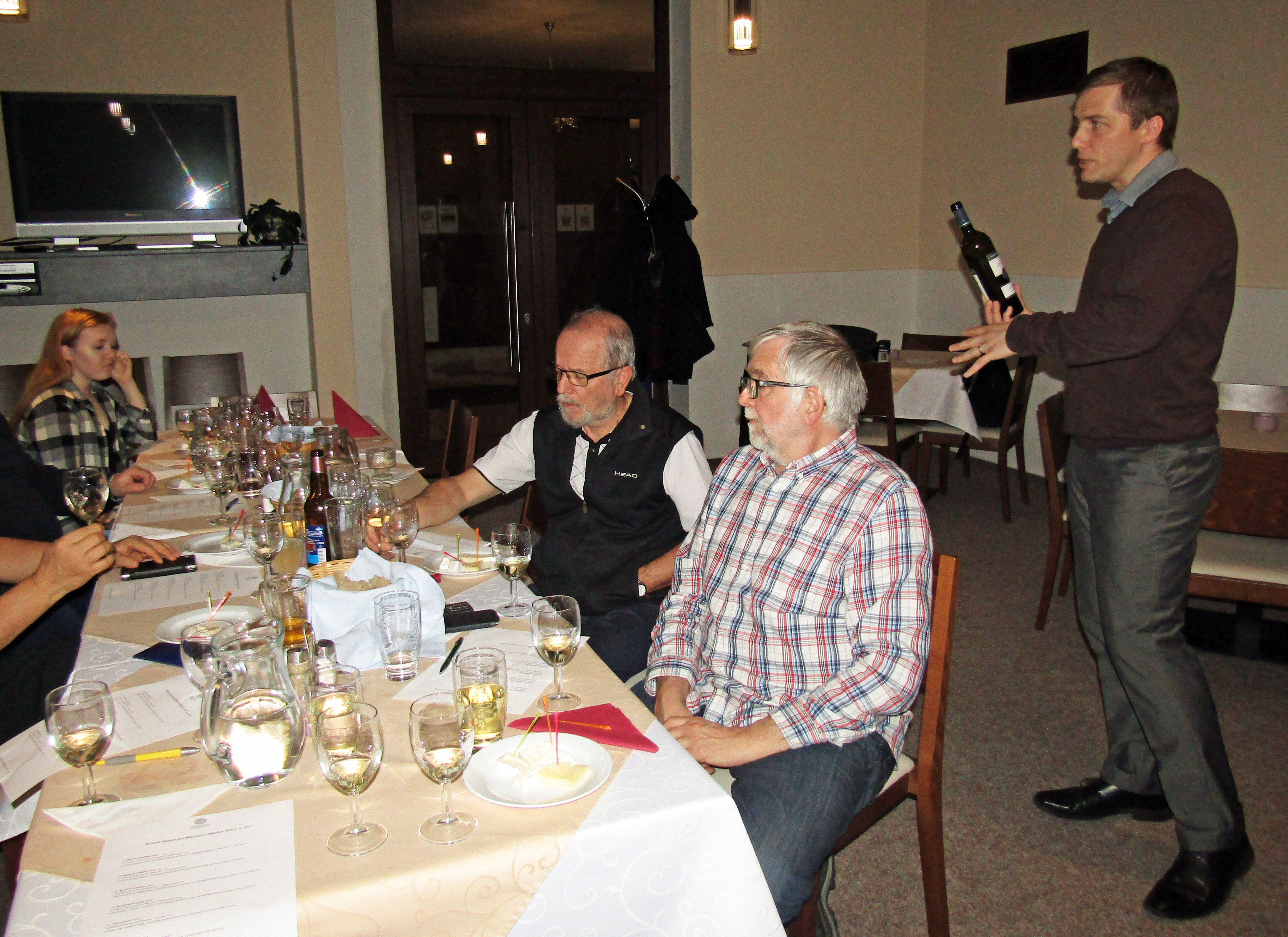 Po večeři tvořené kachním stehnem se špekovým knedlíkem a červeným zelím (desert čokoládová zmrzlina se šlehačkou) jsme přistoupili k hlavnímu bodu programu, jímž byla degustace 12 vín z produkce fy Mikrosvín Mikulov. Mladý someliér Pásler, který u nás kvalitní moravská vína prezentuje opakovaně, nás v úvodu seznámil se strategií a dalším rozvojem firmy. Pak následovala degustace zahájená novinkou Mikrosvínu, již byl nedávno odstřelený SEKT 2012. Po konzultacích s francouzskými vinaři bylo vytvořeno jako cuveé z vlašského a rýnského ryzlinku a chardonnay. Podrobně jsme byli seznámeni s několikaletým postupem výroby tohoto sektu. Pak již následovala přehlídka tradičních bílých vín, typických pro celou mikulovskou oblast. Someliér nám připravil nabídku pro vinařské fajnšmekry. Tak jsme mohli porovnávat vína téhož druhu z různých ročníků (Ryzlink rýnský 2013 a 2015) a diskutovat o tom, jak se v uvedených letech podepsaly klimatické podmínky na cukernatosti, aromatičnosti a přítomnosti kyselinek. Pak jsme se dostali ke skutečné lahůdce, když jsme měli možnost porovnávat tři Ryzlinky vlašské z jednoho ročníku 2015, které ovšem vyrostly na třech různých lokalitách Mikulovska. Dokonce i u nich byl rozdílný obsah cukru a aromatických látek, takže se tato vína dokonce lišila svým zařazením mezi suchá a polosladká. V této souvislosti jsme diskutovali o vlivu jednotlivých lokalit na vlastnosti vína, přičemž se uplatňuje nejen podloží, ale i orientace a sklon svahu popř. i vzdálenost od nejbližší vodní nádrže. Jednotlivé lokality, v nichž se testované vzorky urodily jsme si našli i na detailní mapě oblasti, kterou nám someliér Pasler poskytl.