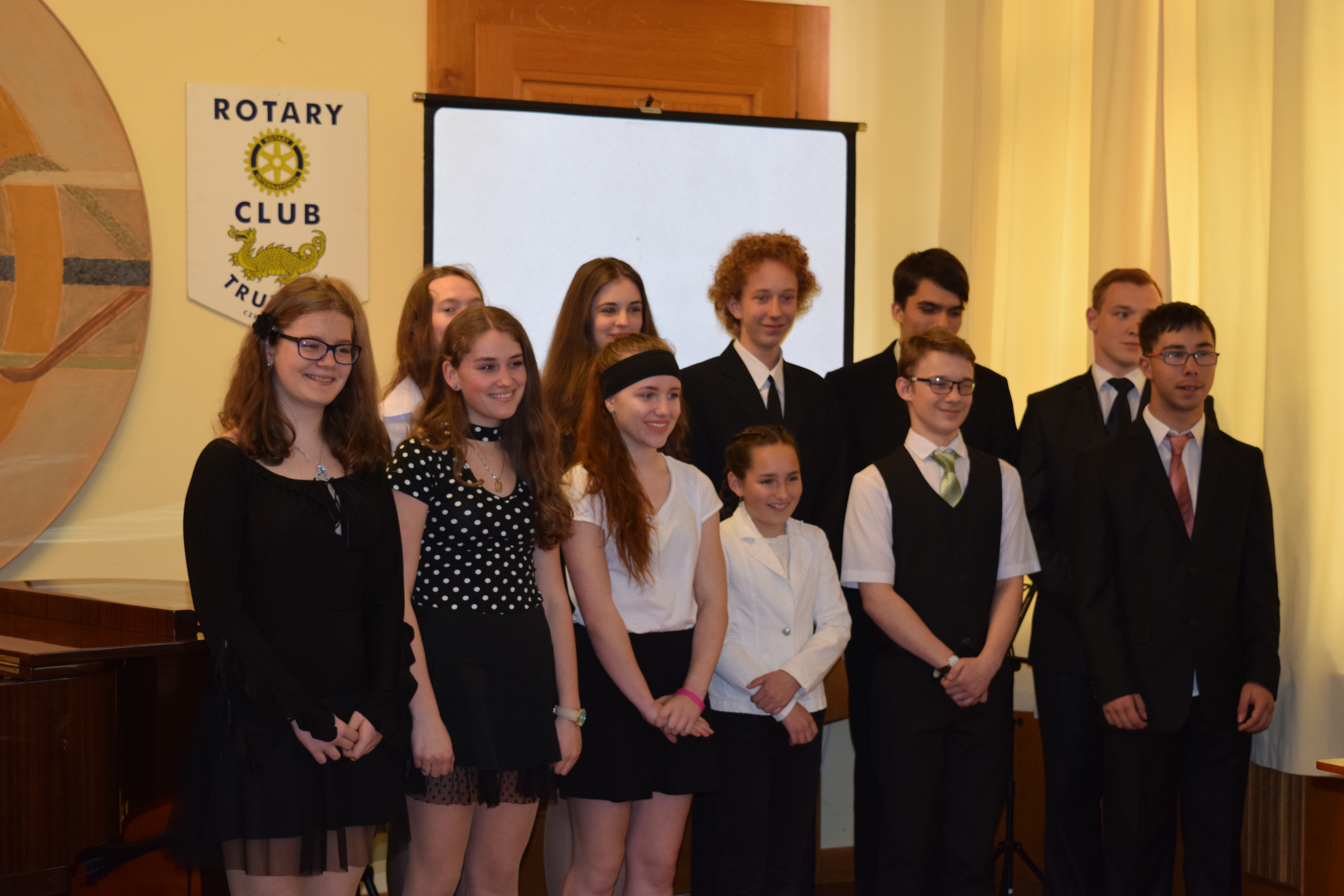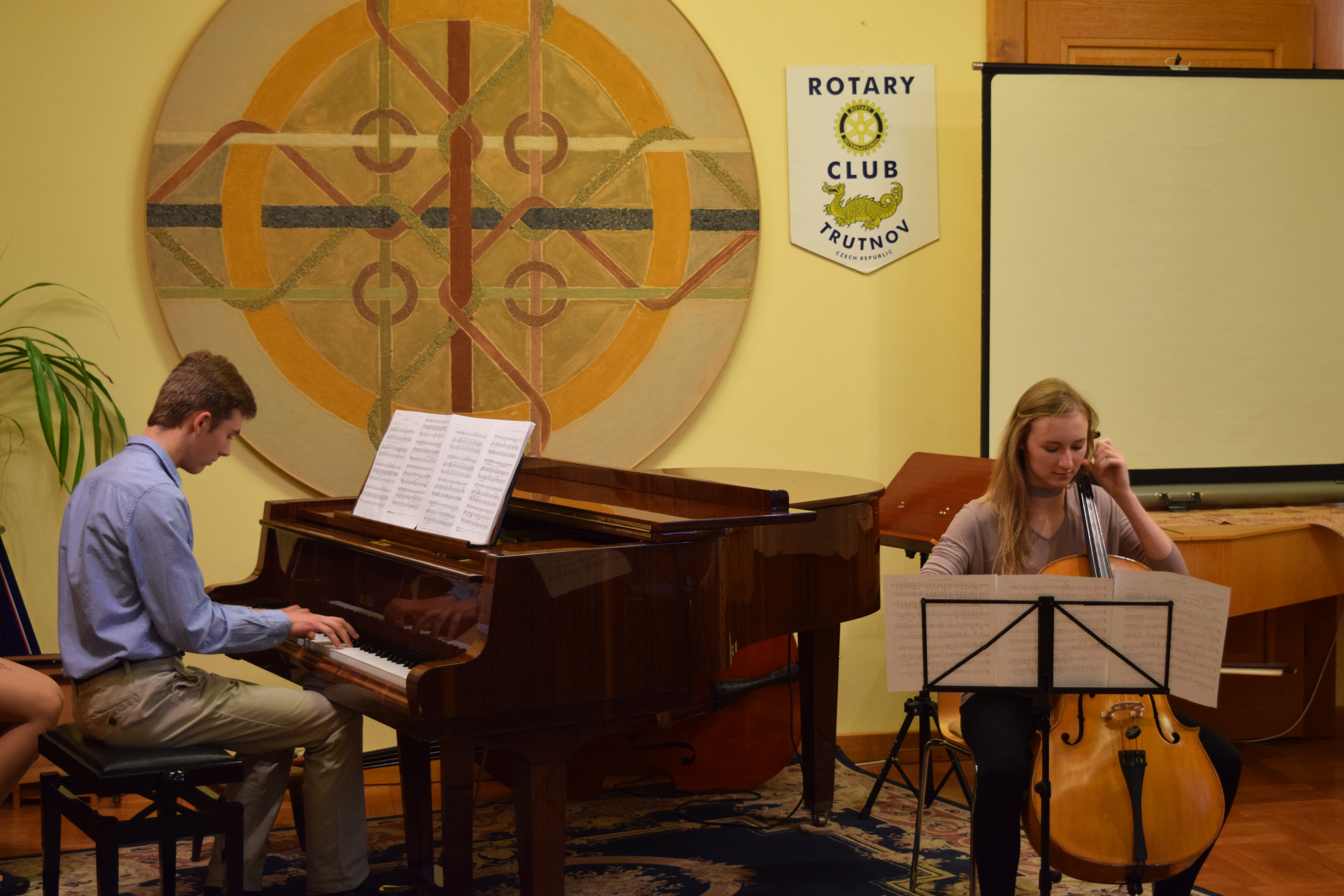 Před další částí plánovaného programu přišli opět na řadu žáci ZUŠ s několika skladbami pro klavír a violoncello. Po velmi kvalitní hudební produkci vystoupil Karel Rada, který v našem RC zajišťuje službu mládeži. Krátce pohovořil o dlouhodobých studentských výměnách a přitom představil studenta Honzu Veselého, který byl naším RC v minulém roce vyslán k ročnímu pobytu do USA. Dále představil i dvě studentky Kláru Čadovou a Michaelu Kulichovou, které budou svůj celoroční výměnný pobyt v USA a v Austrálii absolvovat v příštím rotariánském roce. Po tomto úvodu následovala prezentace fotografií Honzy Veselého z jeho pobytu v hlavním městě státu Washington – Olympii. Jednotlivé fotografie doprovázel Honza vyprávěním o svém výměnném pobytu. Své vystoupení si student velmi dobře připravil, takže dokázal všechny přítomné zaujmout mnoha zajímavými postřehy a odlišnostmi, s nimiž se setkal při svém pobytu v USA, jak v americkém školství, tak i v běžném životě typických Američanů.