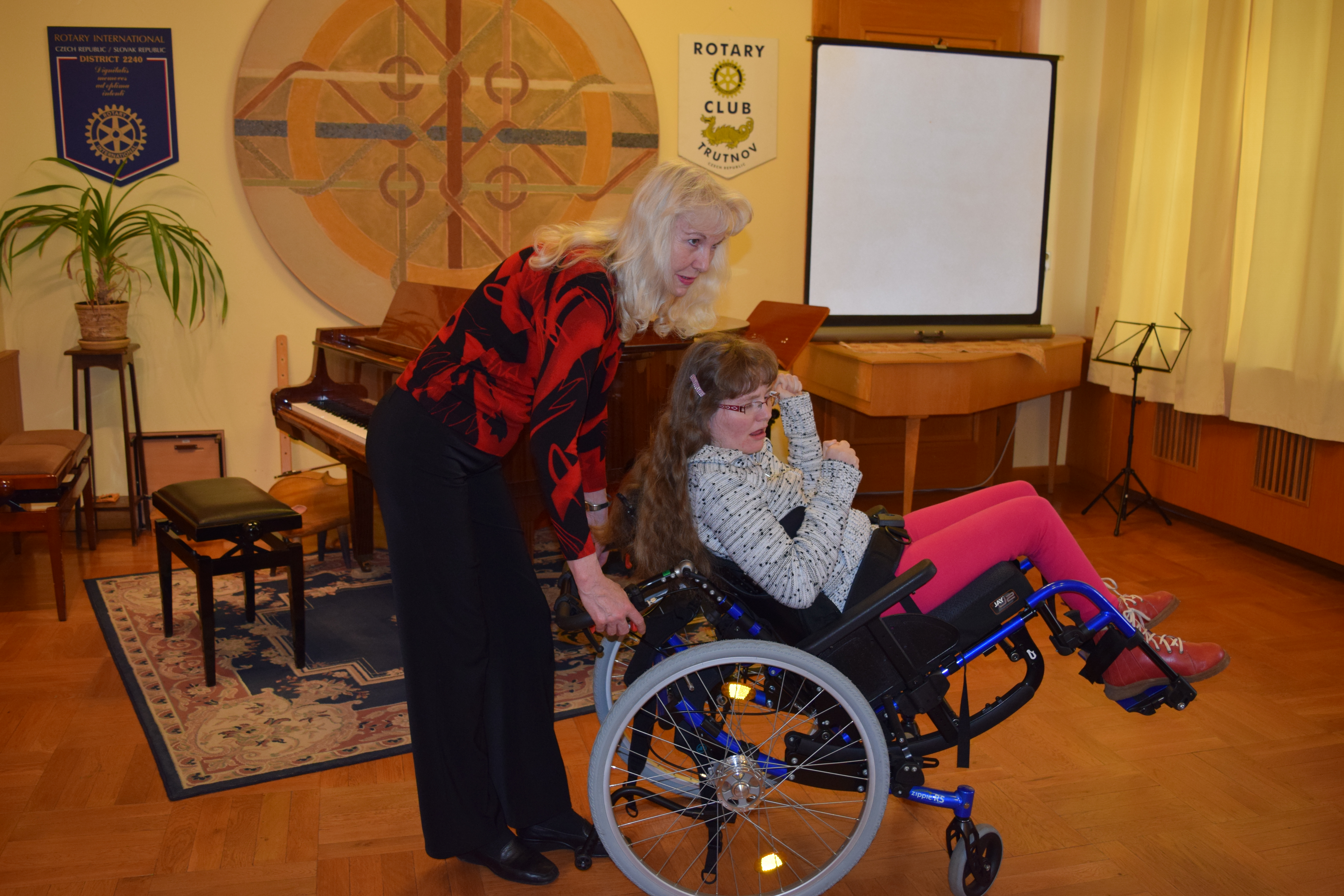Po přivítání přítomných a seznámení s programem předal president RC Vašek Flandera slovo smíšenému pěveckému sboru žáků ZUŠ, který zazpíval 3 písně. Po této kulturní vložce vystoupil pokladník RC Richard Houdek s informací o aktuálním ukončení projektu „Vozík pro Michalku“ v rámci našeho dlouhodobého programu Pomoci potřebným. V průběhu 1,5 roku jsme se snažili zajistit prostředky na nákup speciálního vozíku pro 26 letou dívku Michalku Krejčovou, která trpí závažným neurologickým onemocněním - Rettovým syndromem a je zcela závislá na své matce. K zajištění částky cca 110 tis. Kč jsme zrealizovali 2x charitativního rozdávání vánočního punče a sbírku při loňském vyhodnocení nejaktivnějších dobrovolníků. Obratili jsme se také na některé trutnovské organizace a na dopravní společnost Arriva Praha. V Trutnově jsme neuspěli, ale Arriva podpořila naší snahu částkou 42.700,- Kč tak, že jsme potřebné finanční prostředky shromáždili. Výsledkem byl nákup vozíku a tím i ulehčení každodenního života Michalce a především její mamince. Po Richardovi vystoupila paní Krejčová s velmi emotivním poděkováním našemu Rotary klubu a zejména R. Houdkovi za jeho úsilí zajistit chybějící finanční prostředky k umožnění nákupu vozíku, který výrazně usnadní pohyb Michalky v jejich bytě. Tím, že musí sama soustavně o svou dceru pečovat, žije pouze ze sociálních dávek a úhradu speciálně vyrobeného vozíku by si sama nemohla zajistit. Krátce po svém vystoupení odvezla paní Krejčová Michalku na charitativní koncert, který se od 19. hodin uskutečňoval v UFFU. O uvolnění z našeho dalšího programu požádala i paní Dana Skučková, která jako dobrovolnice spolupracuje s trutnovským Klubem vozíčkářů a na stejný koncert měla zajišťovat doprovod jednoho z vozíčkářů. Proto jsme její ocenění provedli ještě před jejím odchodem na další dobrovolnickou aktivitu. V účasti na další části našeho programu ji zastupovala její dcera.