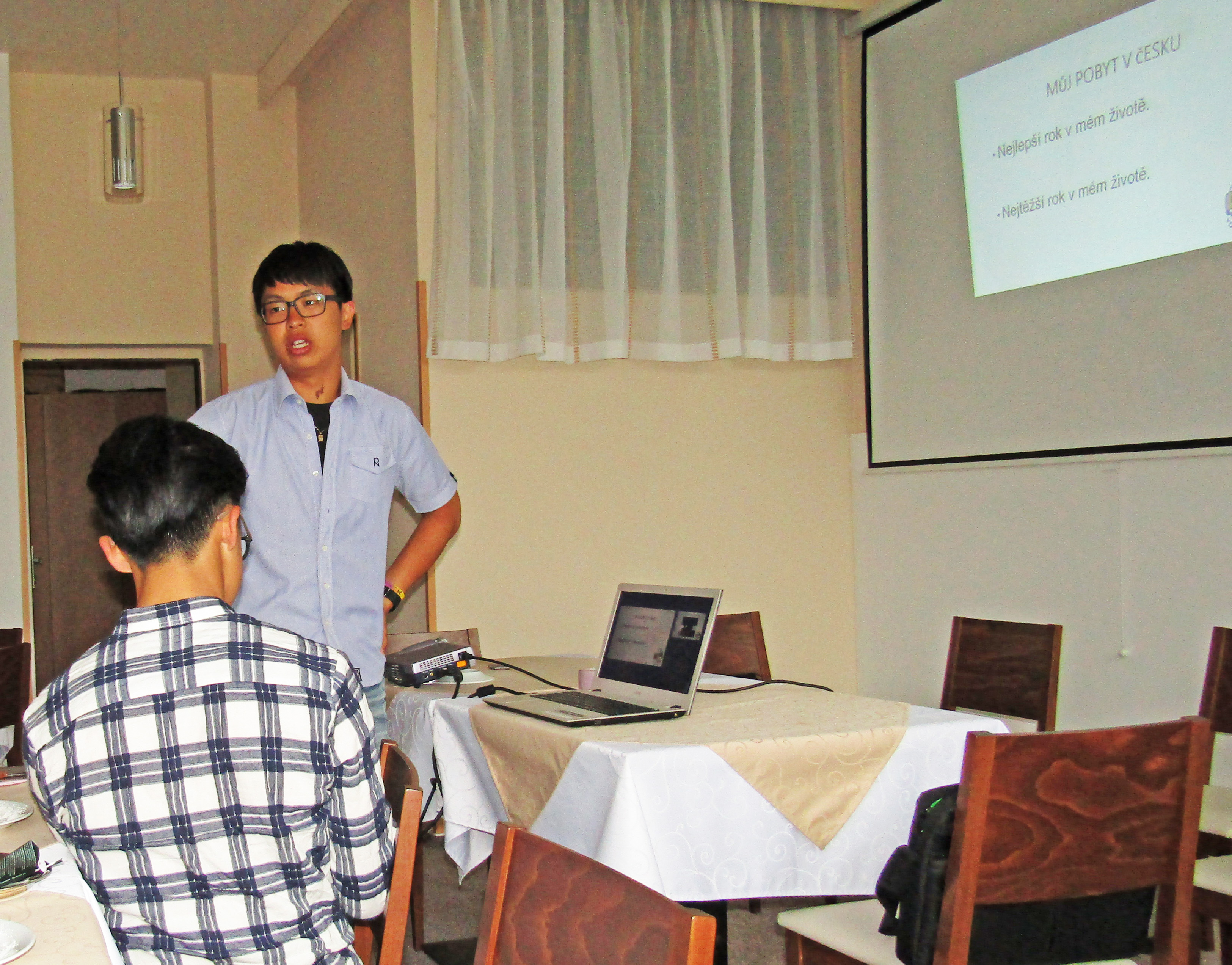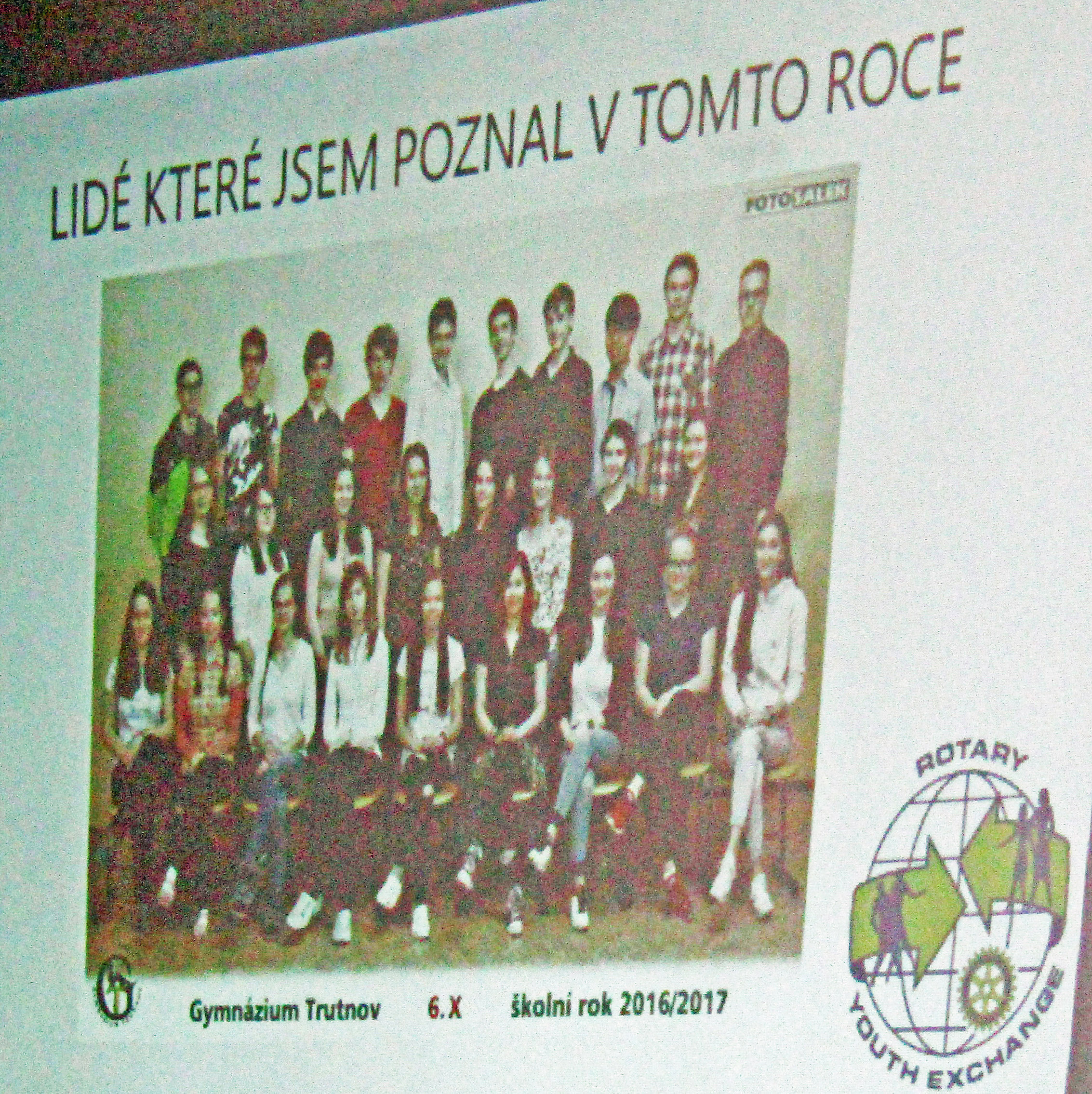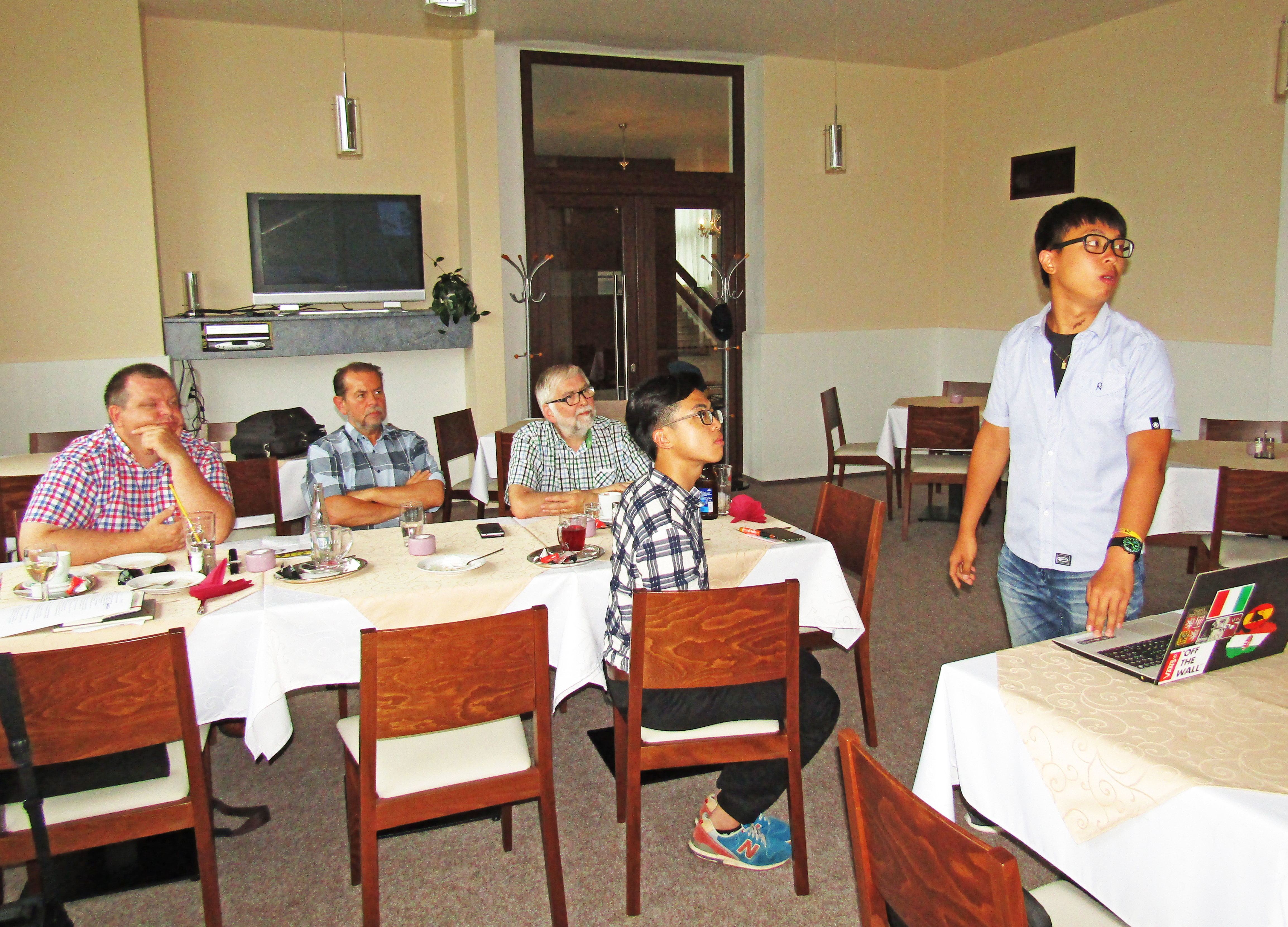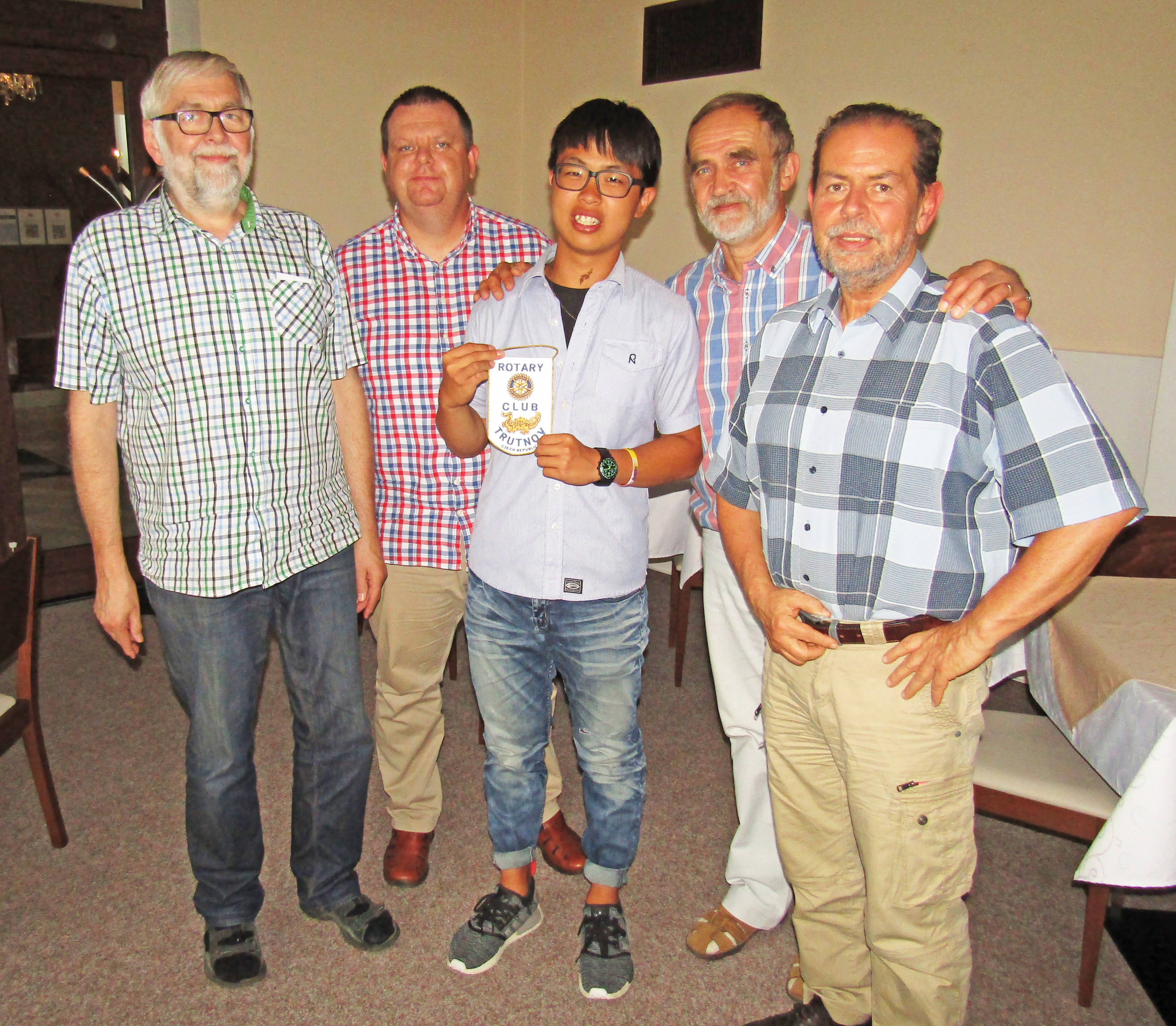 Čtvrtá a současně poslední červnová schůzka našeho Rotary klubu probíhala v salonku hotelu Patria. Hlavní náplní schůzky byla prezentace taiwanského studenta Deana Lee. Dean na schůzku přivedl svého staršího bratra, který za ním právě dnes přiletěl. V nepřítomnosti presidenta RC schůzku vedl sekretář RC. V úvodu schůzky Richard Houdek a Jirka Malinský upřesnili některé detaily a drobné změny v osobních údajích v členské databázi na webových stránkách Distriktu 2240. Petr Sogel ani Karel Javůrek úpravu aktuálního stavu členských údajů nepotřebovali. Po večeři, kterou tvořila čtvrtka pečeného kuřete na másle a tymiánu s vařenými bramborami a s čerstvou zeleninou a speciální desert 3 šištičky z bramborového těsta plněné mákem a šlehačkou, následovala bilanční prezentace našeho zahraničního studenta Deana Lee. Dean se stejně, jako jeho kolegyně před týdnem, mohl pochlubit prakticky bezchybným komentářem v češtině. Své poměrně stručné vystoupení si pečlivě připravil do několika málo bilančních bodů. Hned v úvodu celý svůj roční pobyt ocenil, podobně jako americká studentka před týdnem, jako nejkrásnější rok svého dosavadního života. Tento rok však současně zhodnotil jako rok, který byl pro něj tím nejnáročnějším, vzhledem k nezbytnosti přizpůsobovat se kulturnímu prostředí, které bylo velmi odlišné od jeho dosavadních životních zkušeností. Za svůj největší zážitek v celoročním pobytu považuje několikanásobnou návštěvu Prahy, kterou ocenil jako nejkrásnější město na světě. Dále hodnotil i svou návštěvu Ratibořic, jako součást historie Česka, které je podle něj zemí příběhů. Oceňoval i zdejší přírodní bohatství, které zřejmě kontrastuje s jeho přelidněnou vlastí, v níž při poloviční rozloze žije více než dvojnásobek obyvatel v porovnání s ČR. Mezi jeho velké zážitky patřil i třítýdenní jihoevropský trip, při kterém spolu s ostatními výměnnými studenty navštívil Itálii, Francii a Španělsko. Mezi významné zážitky spojené s pobytem v Trutnově patřilo i setkání se zimními sporty. Poprve v životě si zde obul boty s bruslemi a byl na sněhu s lyžemi. Přestože tato seznamování se zimou provázely četné pády, zejména lyžování se mu prý skutečně zalíbilo. Za velké dobrodružství považoval vánoční výlet na Sněžku, kde prý byla podle jeho názoru neskutečně vysoká 80 cm vrstva sněhu. Nechtělo se mu uvěřit našemu tvrzení, že v pozdějších zimních měsících tam bylo sněhu více než dvojnásobek oproti této jeho zkušenosti. Velmi skromně přijal naši pochvalu své sportovní výkonosti, kterou prokázal při našich klubových miniturnajích ve stolním tenisu a badmintonu. V průběhu svého pobytu žil ve dvou hostitelských rodinách, s nimiž byl velmi spokojen. Kupodivu nepovažoval za problém ani půlroční každodenní dojíždění na gymnázium v Trutnově z Úpice. Velmi spokojen byl se svou gymnaziální třídou 6. X, kde získal mnoho kamarádů. Dobře se cítil i při schůzkách v našem klubu, takže i nás zařadil mezi své nejdůležitější přátele. Při svém závěrečném vystoupení na půdě RC Dean potvrdil, že velmi dobře rozumí i všem dotazům, které mu v českém jazyce přítomní rotariáni kladli. Na některé otázky, týkající se Taiwanu neznal odpověď a konzultoval je se svým šestadvacetiletým bratrem v čínštině. Deanův bratr absolvoval před lety jako středoškolák rovněž roční výměnný zahraniční pobyt v Mexiku, který mu zprostředkovalo taiwanské Rotary. Nyní již po vystudování univerzity pracuje jako veterinář. Na závěr nás Dean seznámil s tím, že jej ještě čekají dva roky studia na střední škole a pak studium na univerzitě. Jaké bude zaměření jeho dalšího studia a jaká bude jeho budoucí profese dosud neví. Požádal nás o vlaječku našeho Rotary klubu, kterou předá taiwanskému RC, jenž ho na výměnný pobyt vyslal. Rozloučení s našim prvním inboundem z Asie jsme uzavřeli společnou fotografií.