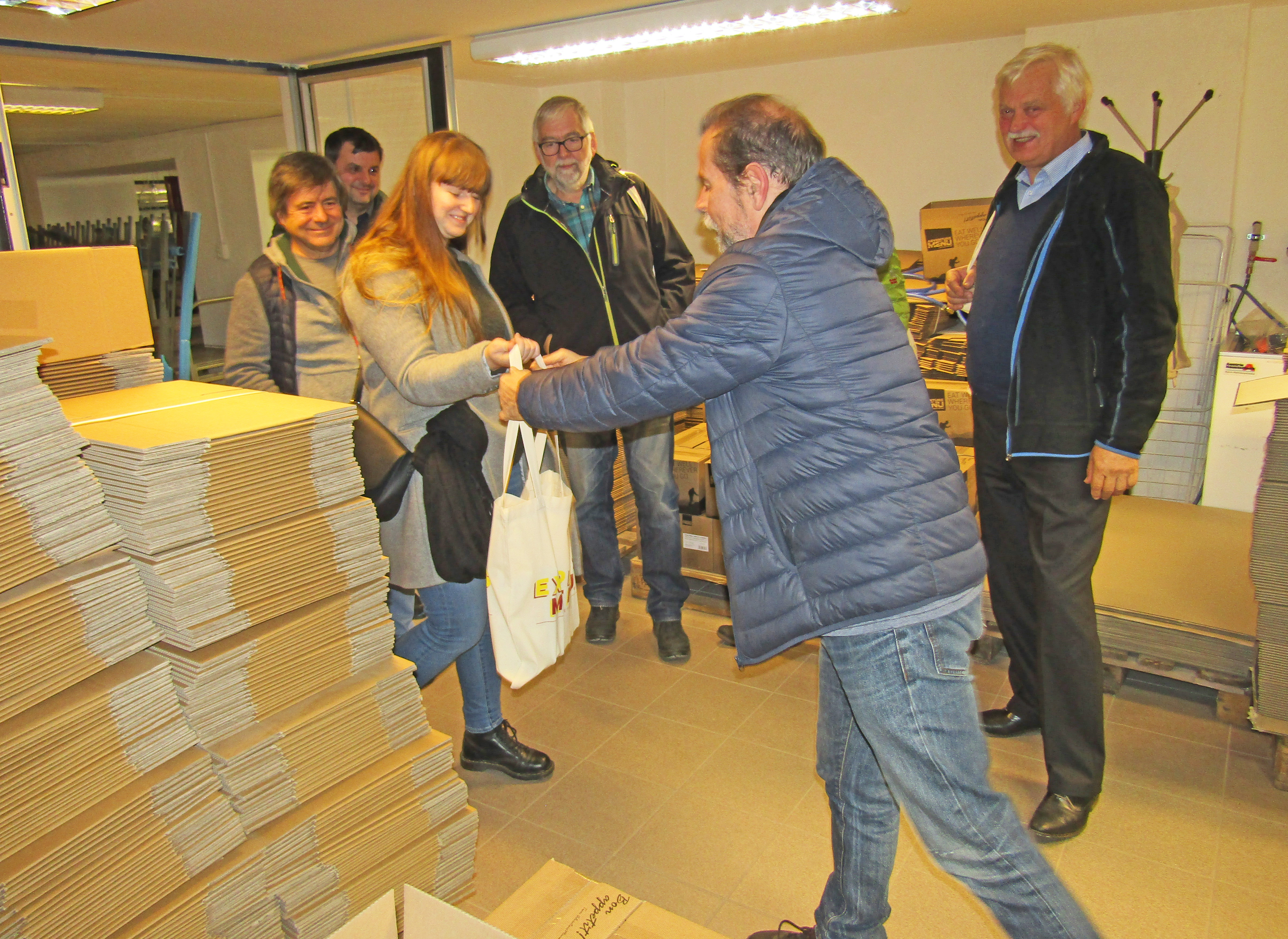 Na závěr exkurze ve stále ještě budované provozovně Expres Menu obdaroval Petr každého z účastníků taškou obsahující několik produktů z jeho unikátně vyráběných jídel.