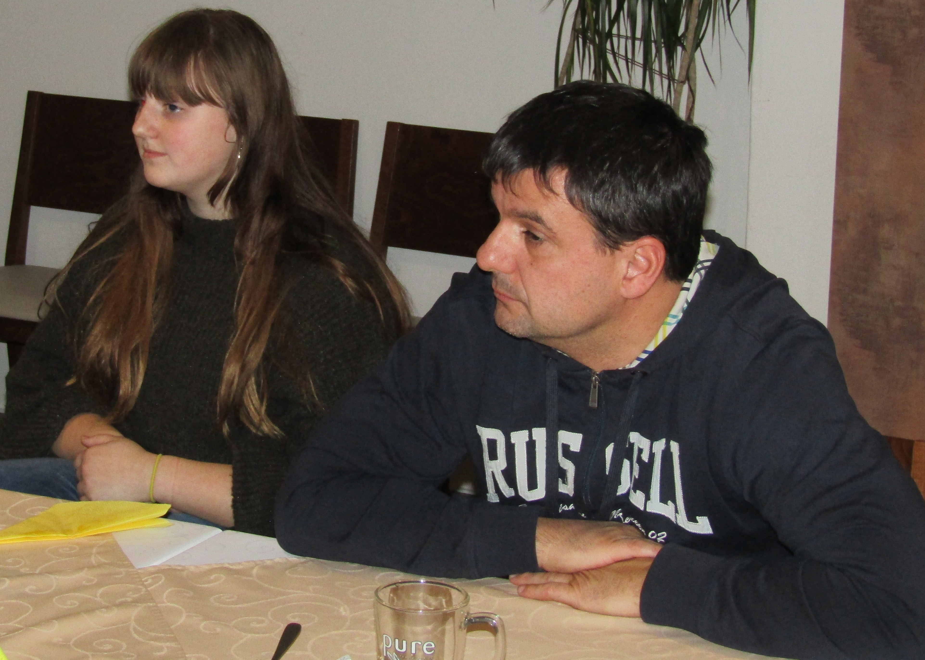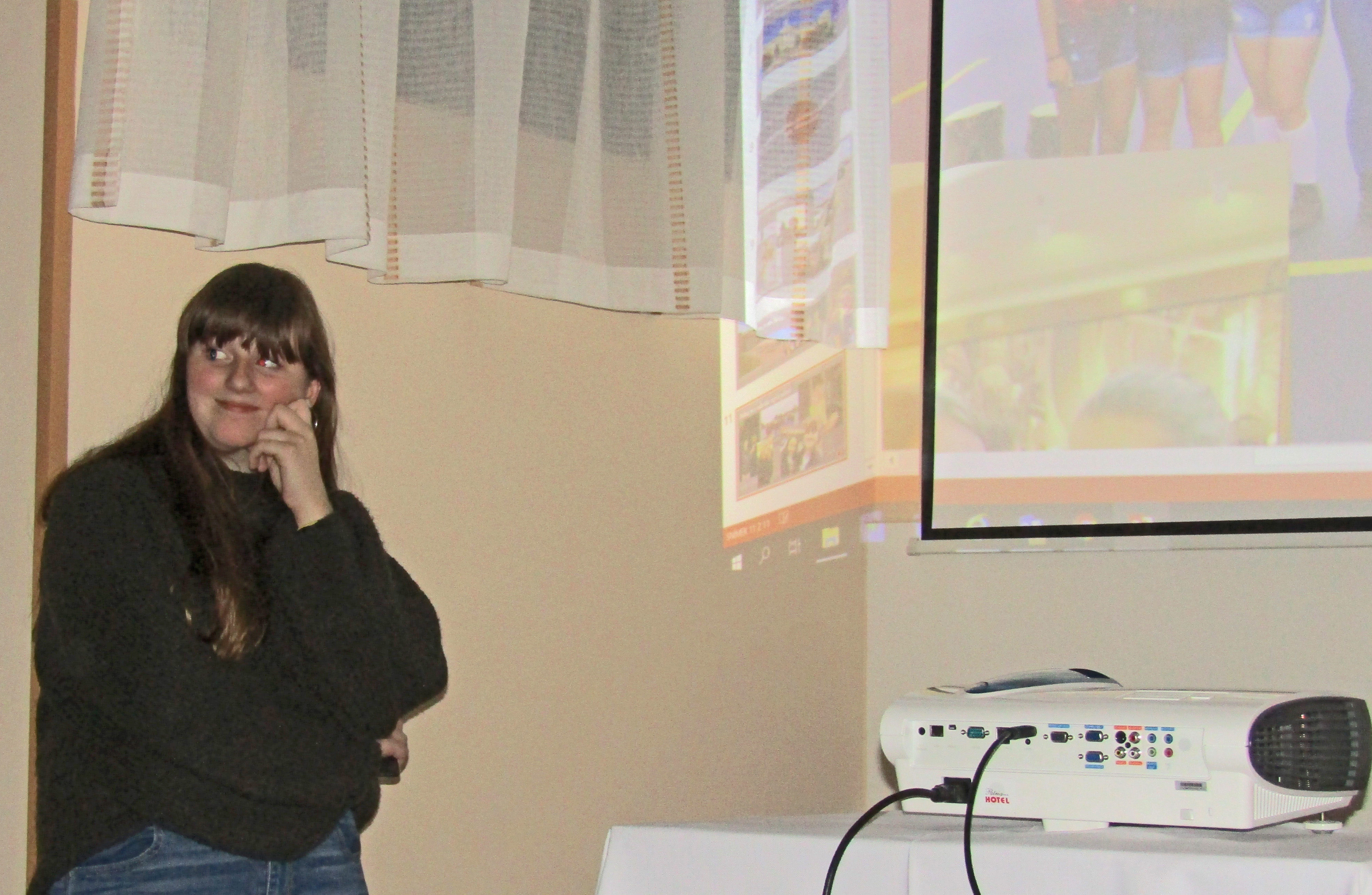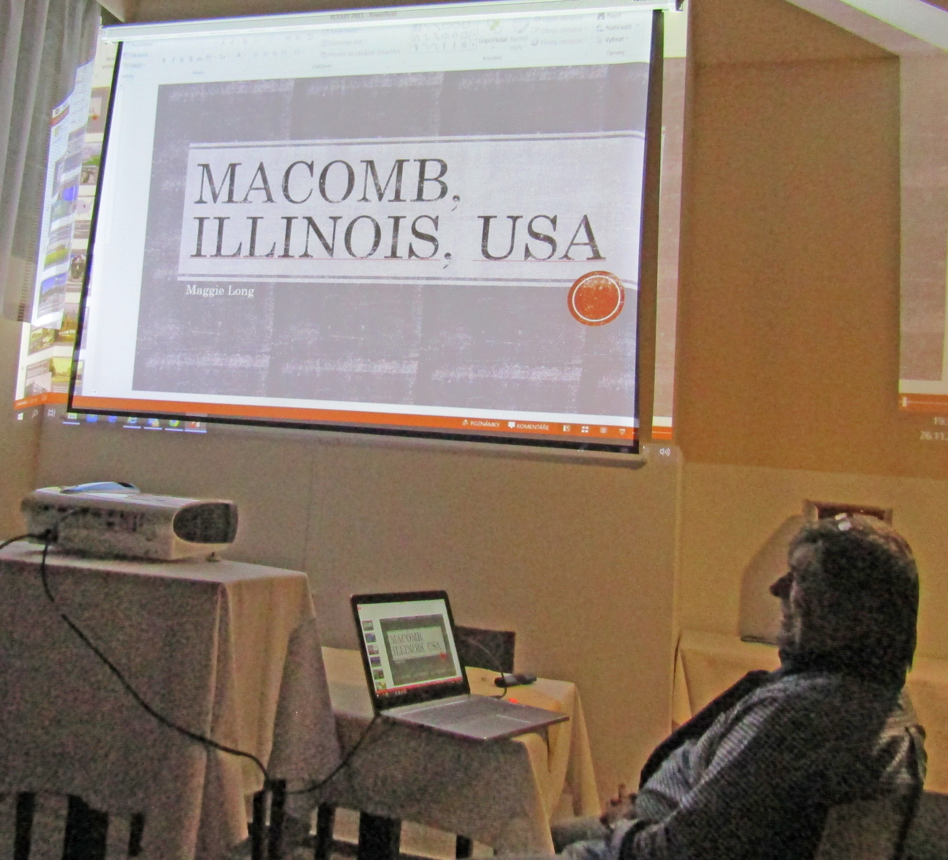 Poté následovala originální večeře, kde hlavní chodem bylo: Pečené kuřecí prsíčko s jablky, kari kořením a tagliatelle. Jako desert jsme dostali skvělé Tiramisu. Po večeři se již přistoupilo k prezentaci Maggie. Její připravené slajdy byly občas popsány poněkud krkolomnou češtinou a její interpretace textů, kterou měla navíc jako pomůcku v mobilu, byla češtině ještě více vzdálená. Proto texty na slajdech začal předčítat YEO Karel Rada, po němž přečtená česká slova již Maggie docela slušně opakovala. Tak jsme se dověděli, že je Magginým rodným městem Macomb ve státě Illinois. Městečko má kolem 20 tisíc obyvatel a vzniklo v roce 1830. Významná je v něm Western Illinois Univerzita, v níž je podle Maggie 10 tisíc studentů?!? V této oblasti je převažující zemědělství, pěstuje se zde hlavně kukuřice a soja. Kromě svého města nám Maggie ukázala hlavní město státu Illinois – Springfield, kde je hrobka Abrahama Lincolna. Největším městem státu je Chicago. Jeho počet obyvatel ani českou historii Maggie neznala. Na slajdu nám ještě ukázala průčelí své střední školy a skupinky svých přátel. Na závěr nám ukázala fotografie svojí rodiny, na nichž byla kromě rodičů i její mladší sestra. Zajímavostí byl její otec jako rychlobruslař. O zájmech a aktivitách této dívky jsme se nic nedověděli. Celé vystoupení Američanky nedosahovalo úrovně, která byla obvyklá u inboundů, kteří byli v našem klubu v minulých letech. Karel Rada se snažil na závěr Maggie vysvětlit, že by nám měla na dalších klubových schůzkách česky sdělovat, co prožila v poslední době. Slabou úroveň zvládání češtiny nám Karel zdůvodnil i tím, že se Maggie na SZŠ zúčastňuje pouze jedné hodiny českého jazyka. Naznačil, že se pokusí se současným ředitelem SZŠ projednat možnost většího zapojení do výuky češtiny. Zdá se, že ani Maggina hostitelská rodina ji asi příliš v osvojování našeho jazyka nepodporuje. Přes výše uvedené problémy jsme zcela na závěr ocenili alespoň evidentní snahu Američanky potleskem.