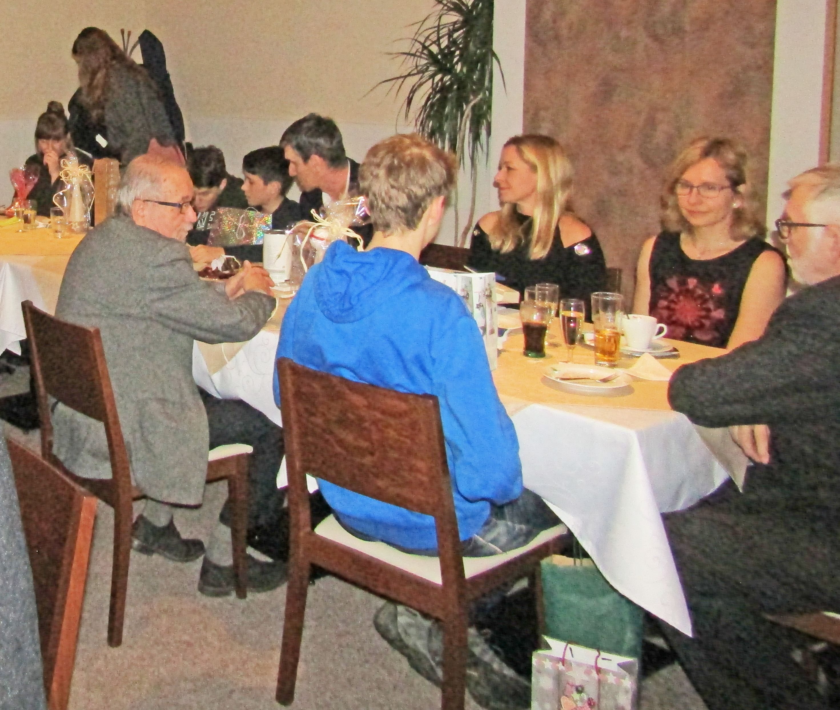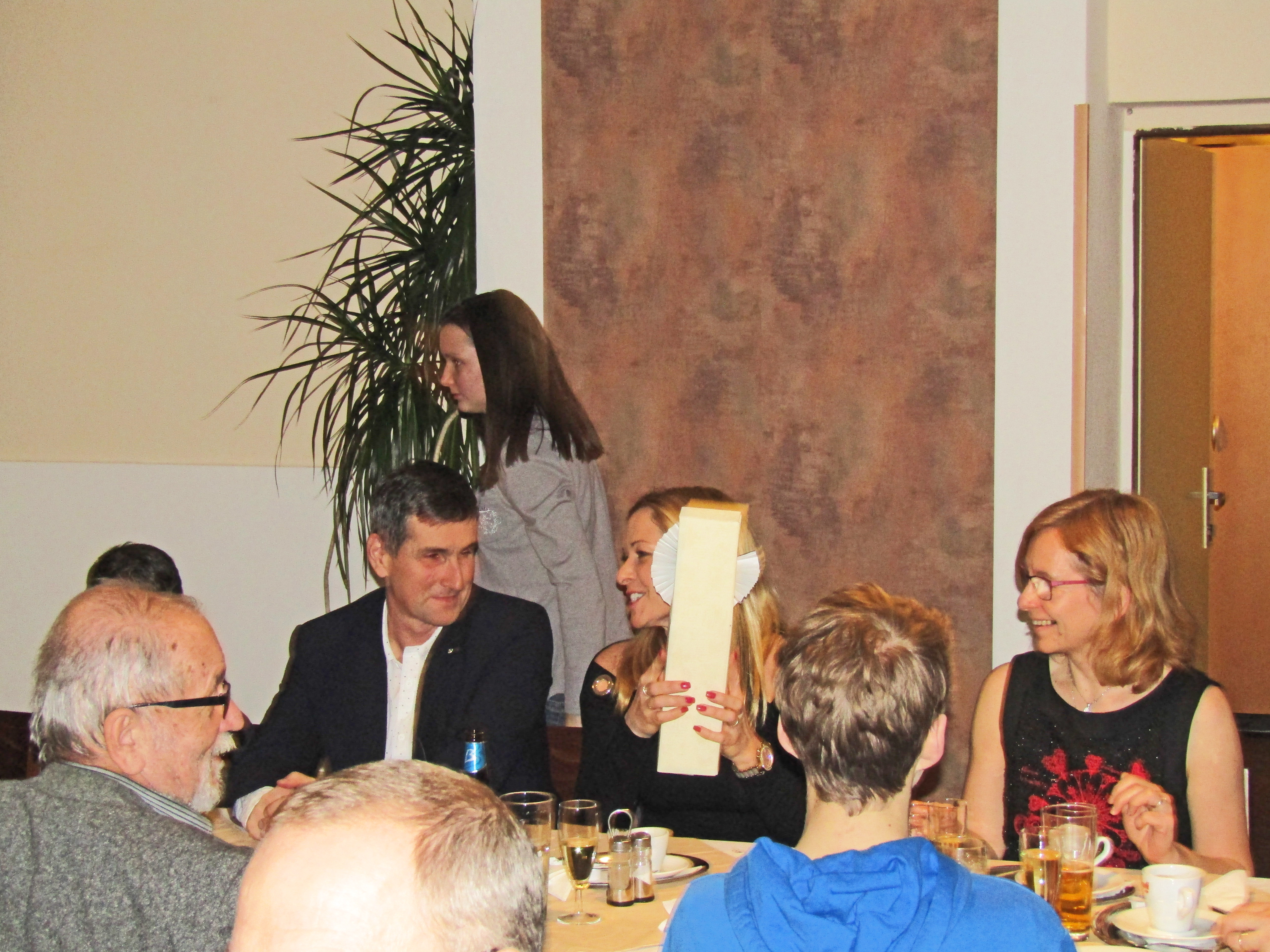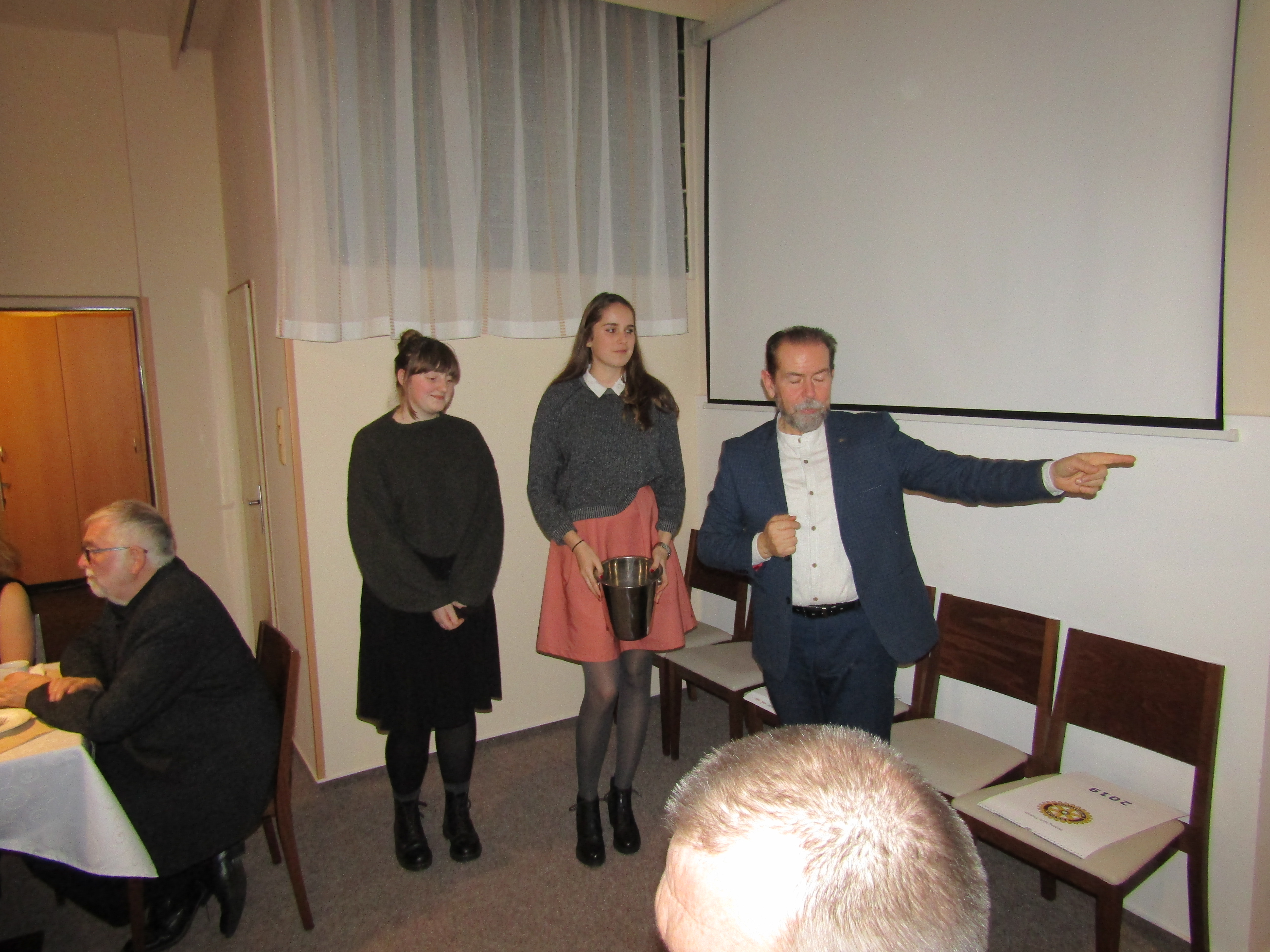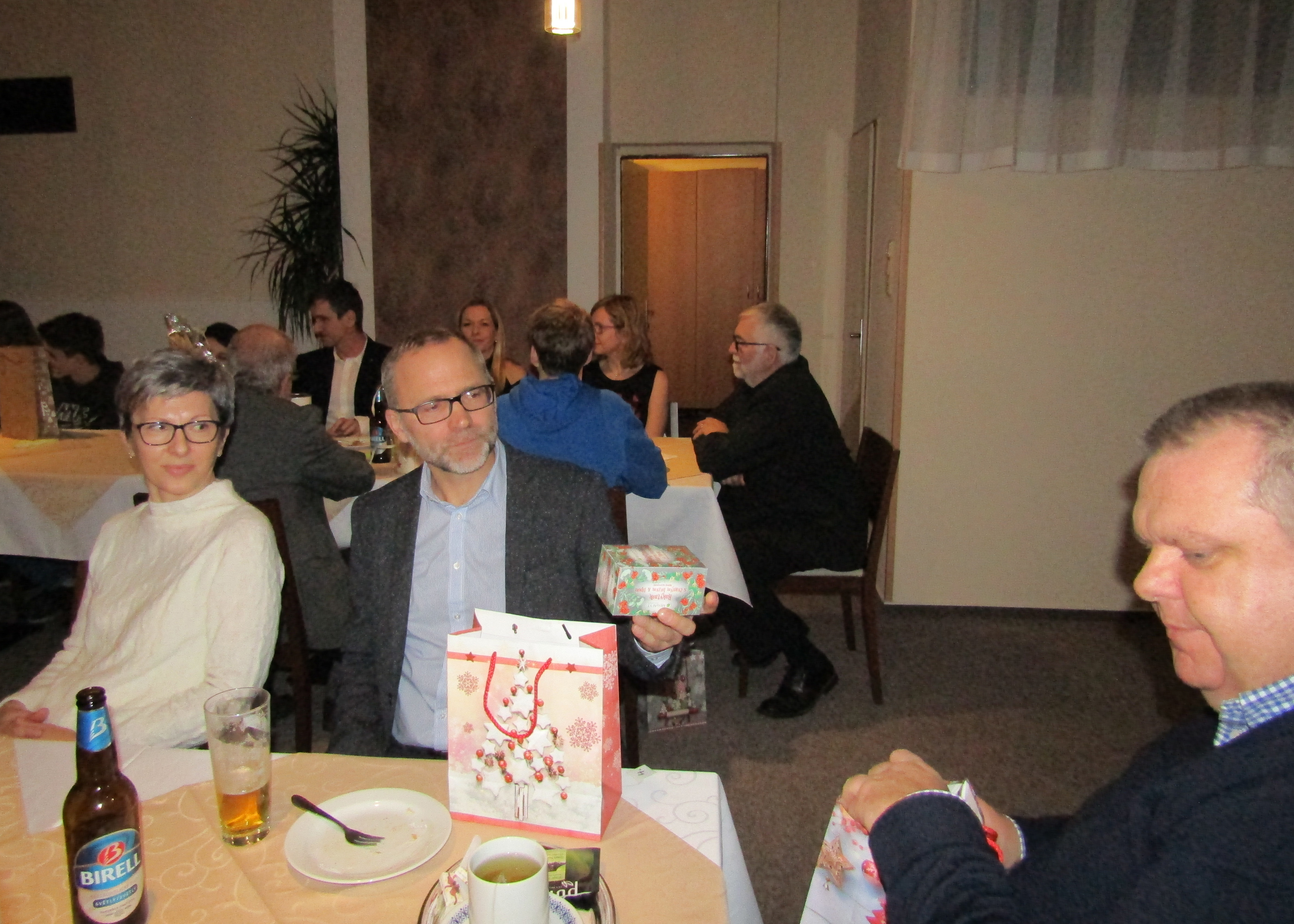 Po této úvodní části schůzky se podávala večeře s tradičním menu. Jako předkrm jsme dostali houbového kubu. Hlavní chod tvořil klasický bramborový salát s opečenou obalenou bílou klobásou a rybím řízkem. Desert byl tvořen kouskem štrůdlu se šlehačkou. Po velmi dobře upravené večeři se ujal slova správce našeho klubu Petr Sogel. Požádal, tak jako každoročně, dcerky přítomných rotariánů a inboundku Maggie o spolupráci při nadělování vánočních dárků. Díky těmto šikovným hosteskám probíhalo tradiční nadílení jako po másle. Jedna z dívek nabídla postupně všem přítomným možnost vylosovat si z kbelíčku na led číslo na lístku. Další dívky pak podle těchto čísel přinášely ke stolu stejným číslem označený dárek. Většina dárků byla v tuhé nebo v tekuté podobě, ale objevily se tentokrát i dárky zcela netradiční. Zasloužený obdiv si získaly například vlastnoručně vyrobení andílci z polystyrénu, které jako dárky připravily dcerky Roberta Hradeckého. Zbytek večera probíhal v optimistické atmosféře u jednotlivých stolů. Do diskuse se zapojovaly především manželky rotariánů, protože se na rozdíl od jejich partnerů, vídají jen 2-3x za rok a tak je toho velmi mnoho, co si chtějí navzájem říci. Na těchto schůzkách se k nadělování dárků scházejí i potomci členů Rotary klubu a na jejich vzrůstu se přesvědčujeme, jak ten čas letí a jak se ještě nedávno malé děti na nás dnes již dívají z nadhledu. Převládala pozitivní atmosféra, všichni si užívali možnost v klidu a pohodě posedět si mezi přáteli. Popíjelo se i vínko, převládaly však nealko pivo, juice, káva a čaje. Tak jako každoročně se i tentokrát naše rotariánská generálka na Štědrý večer vydařila. Svědčí o tom úsměvy účastníků na přiložených fotografiích.