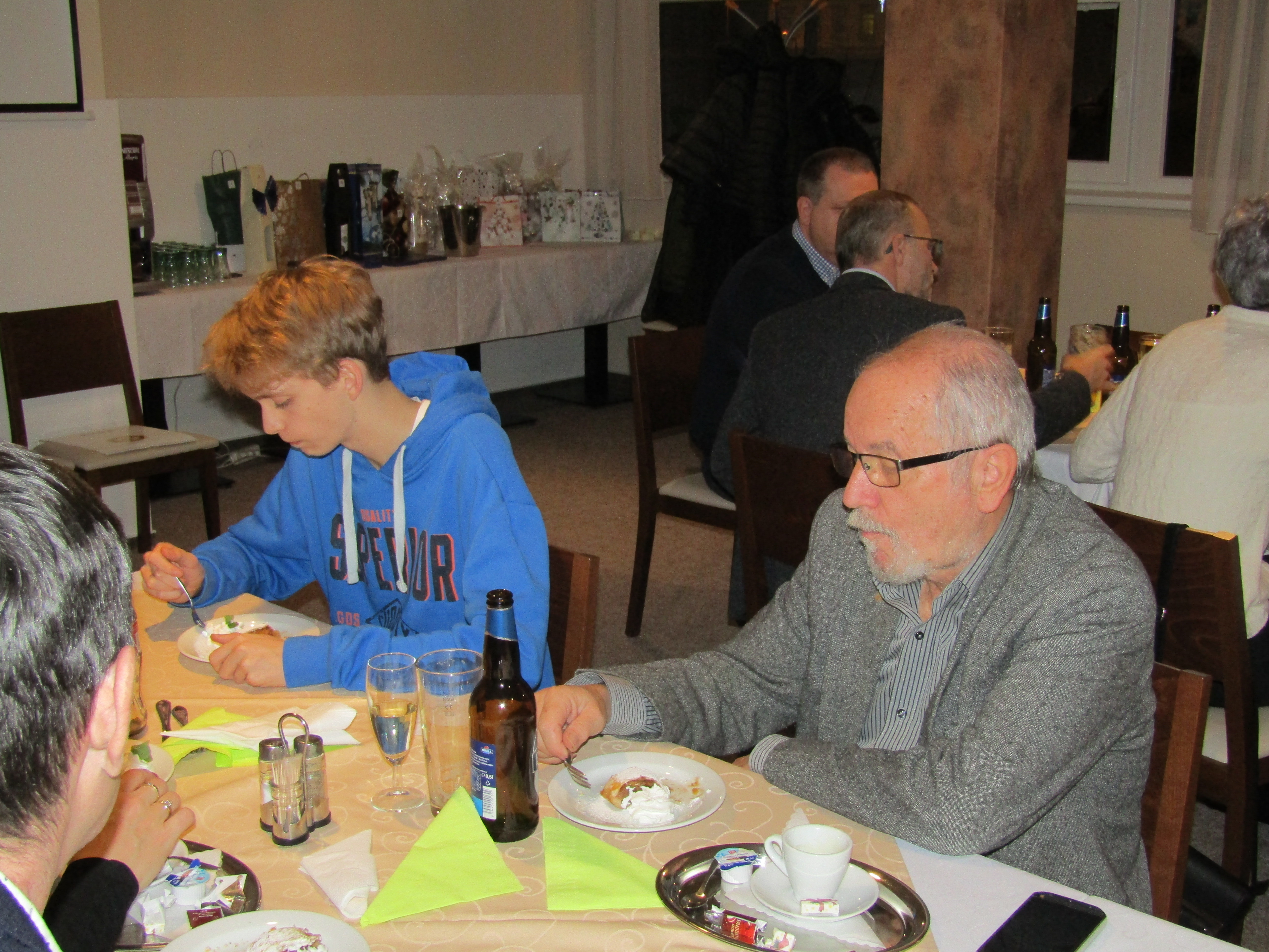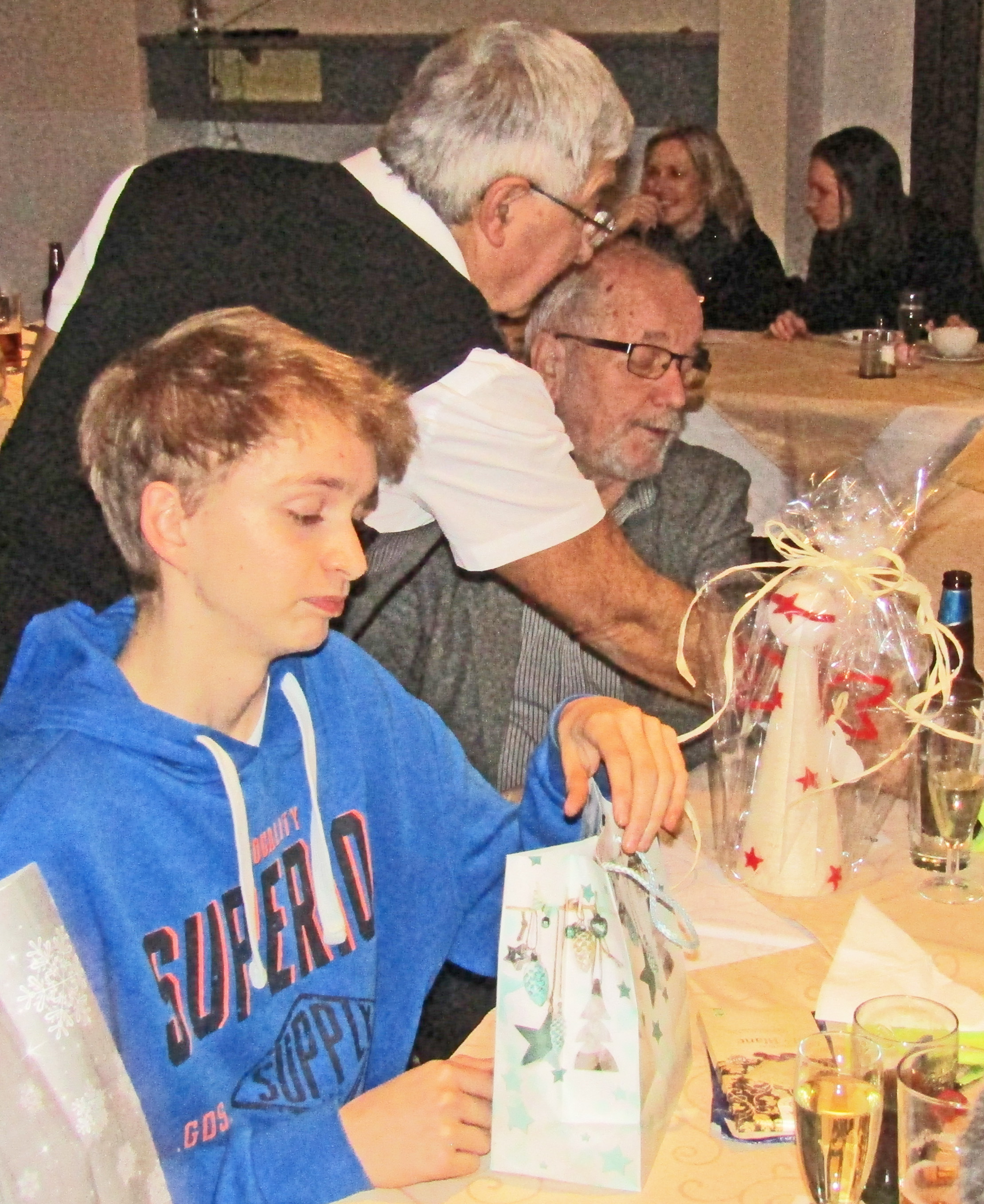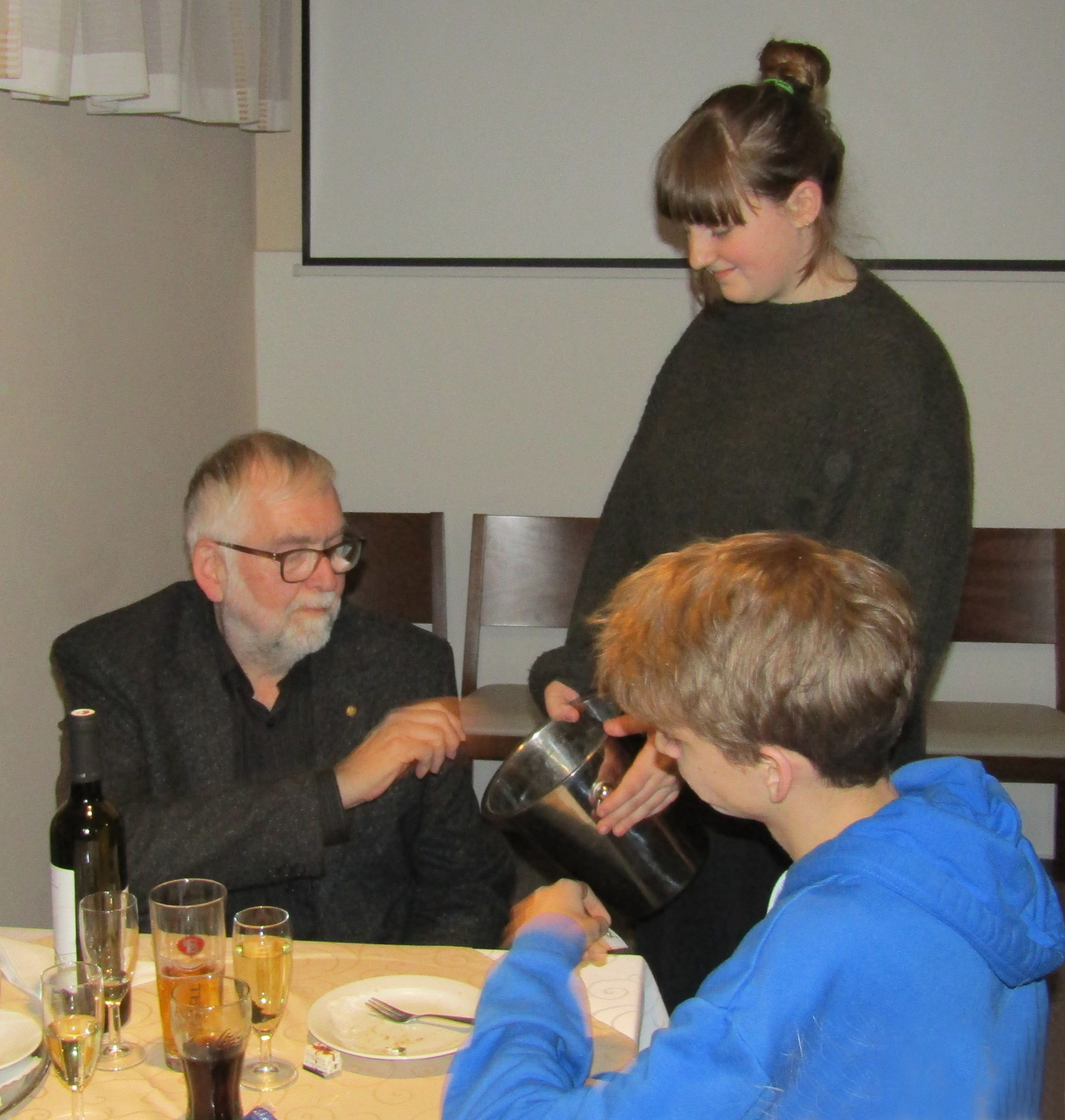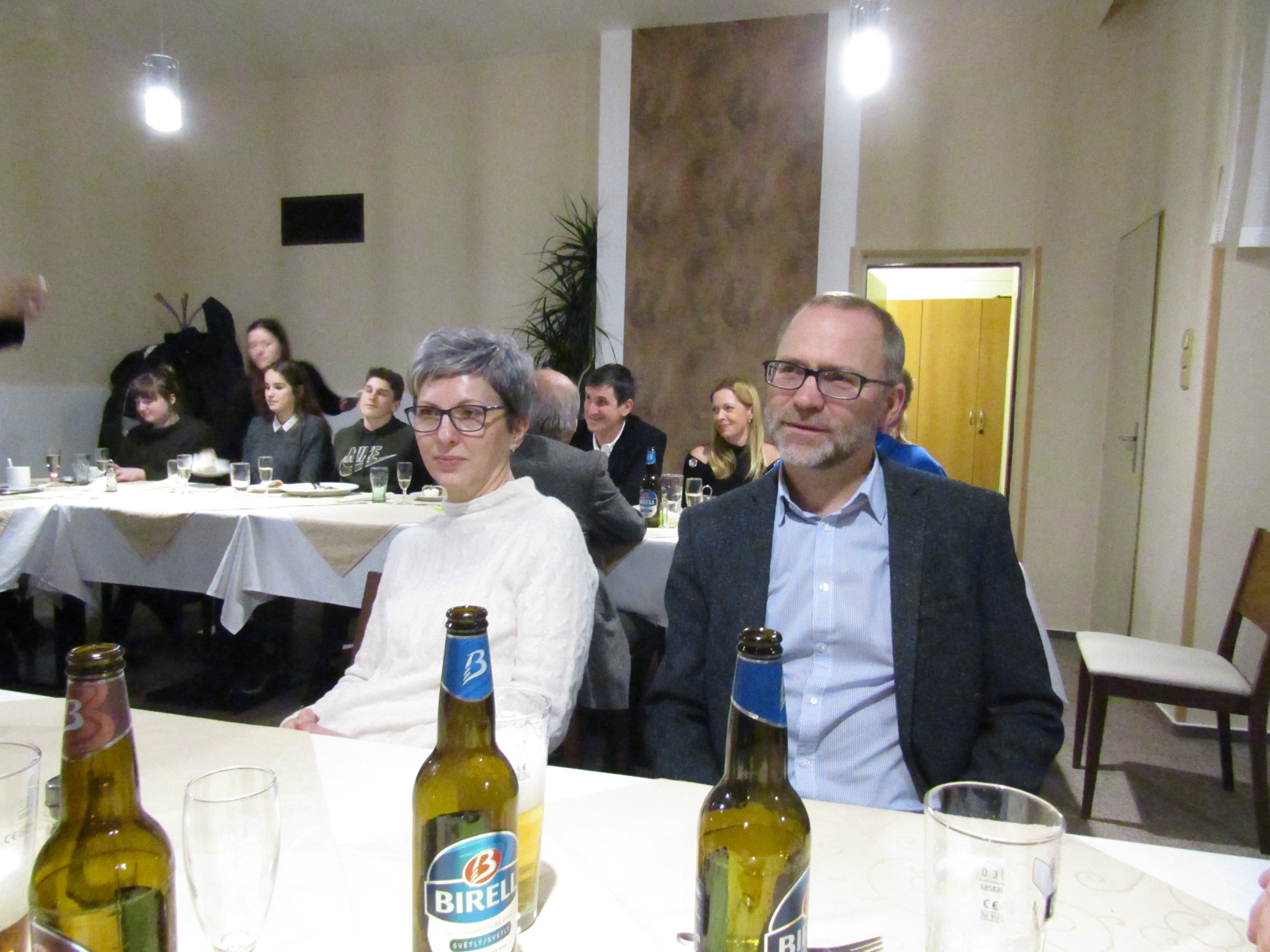 Po této úvodní části schůzky se podávala večeře s tradičním menu. Jako předkrm jsme dostali houbového kubu. Hlavní chod tvořil klasický bramborový salát s opečenou obalenou bílou klobásou a rybím řízkem. Desert byl tvořen kouskem štrůdlu se šlehačkou. Po velmi dobře upravené večeři se ujal slova správce našeho klubu Petr Sogel. Požádal, tak jako každoročně, dcerky přítomných rotariánů a inboundku Maggie o spolupráci při nadělování vánočních dárků. Díky těmto šikovným hosteskám probíhalo tradiční nadílení jako po másle. Jedna z dívek nabídla postupně všem přítomným možnost vylosovat si z kbelíčku na led číslo na lístku. Další dívky pak podle těchto čísel přinášely ke stolu stejným číslem označený dárek. Většina dárků byla v tuhé nebo v tekuté podobě, ale objevily se tentokrát i dárky zcela netradiční. Zasloužený obdiv si získaly například vlastnoručně vyrobení andílci z polystyrénu, které jako dárky připravily dcerky Roberta Hradeckého. Zbytek večera probíhal v optimistické atmosféře u jednotlivých stolů. Do diskuse se zapojovaly především manželky rotariánů, protože se na rozdíl od jejich partnerů, vídají jen 2-3x za rok a tak je toho velmi mnoho, co si chtějí navzájem říci. Na těchto schůzkách se k nadělování dárků scházejí i potomci členů Rotary klubu a na jejich vzrůstu se přesvědčujeme, jak ten čas letí a jak se ještě nedávno malé děti na nás dnes již dívají z nadhledu. Převládala pozitivní atmosféra, všichni si užívali možnost v klidu a pohodě posedět si mezi přáteli. Popíjelo se i vínko, převládaly však nealko pivo, juice, káva a čaje. Tak jako každoročně se i tentokrát naše rotariánská generálka na Štědrý večer vydařila. Svědčí o tom úsměvy účastníků na přiložených fotografiích.