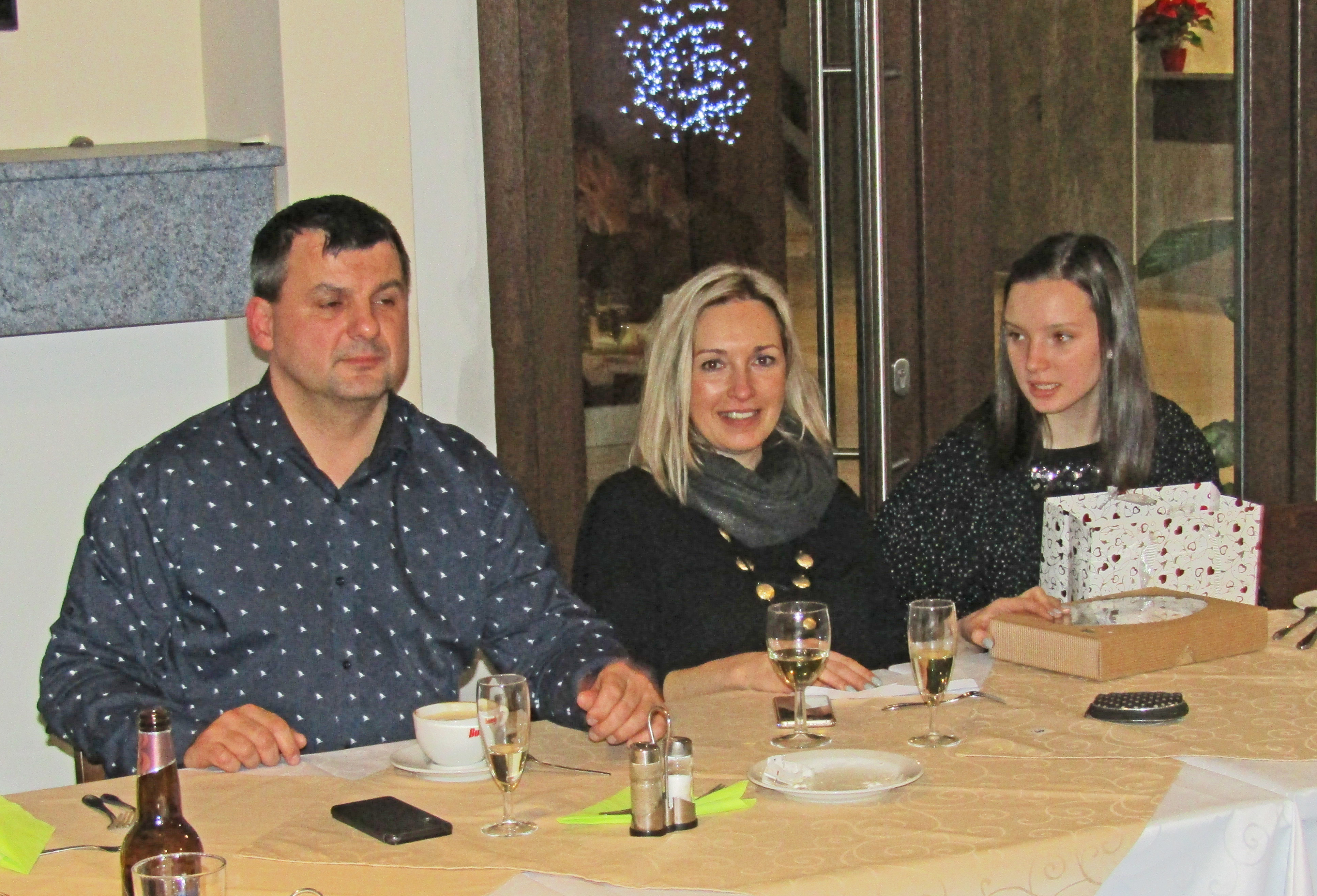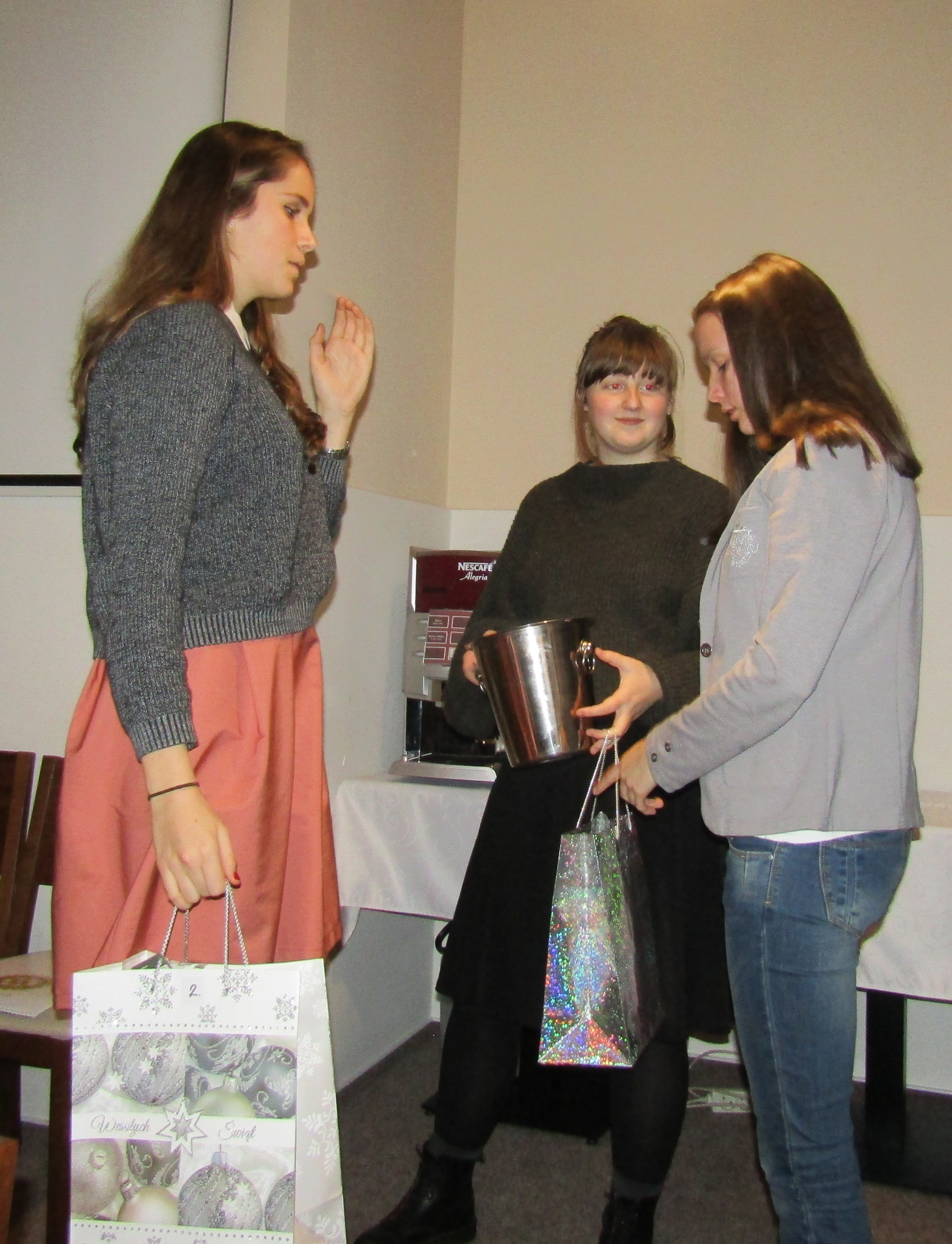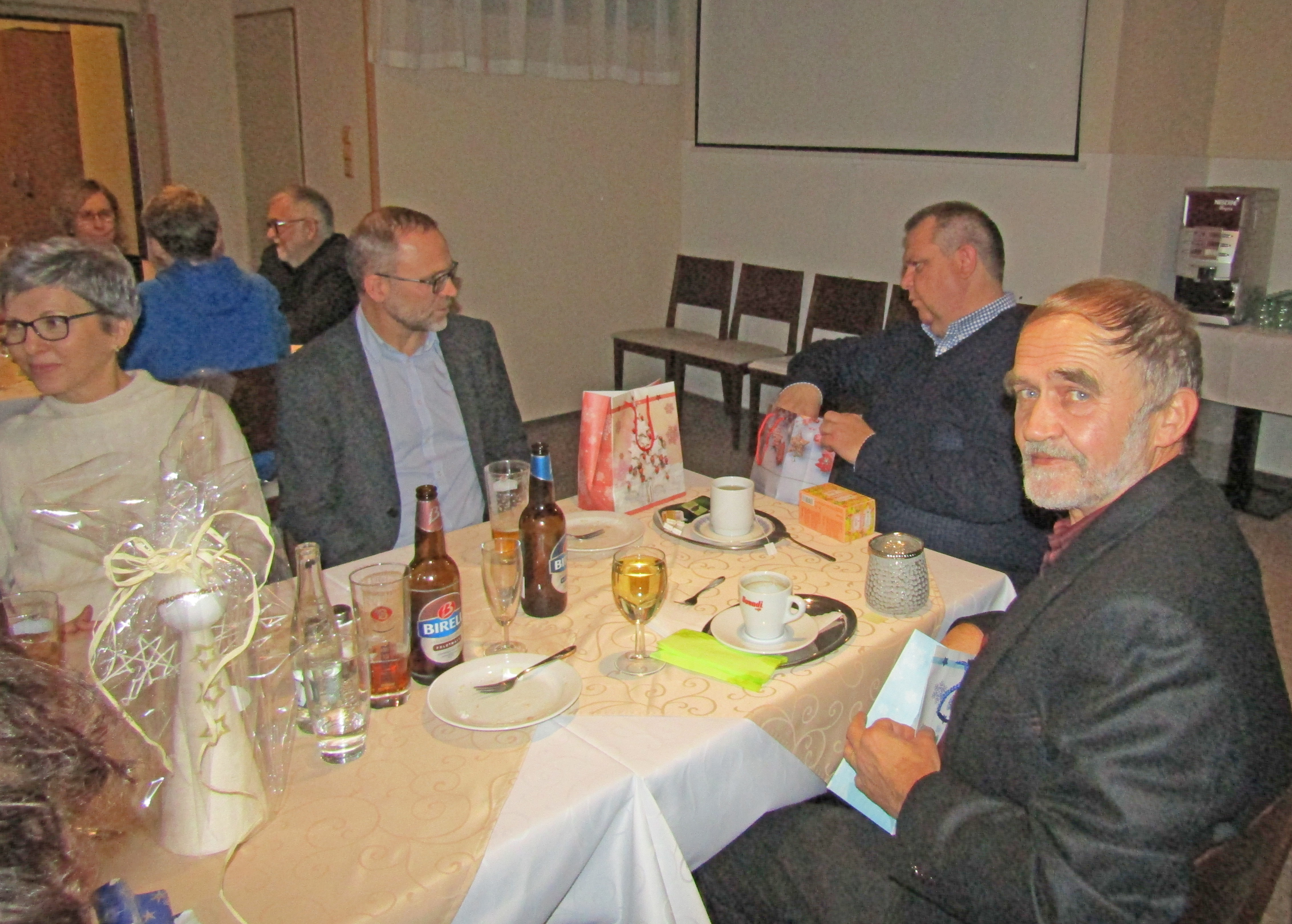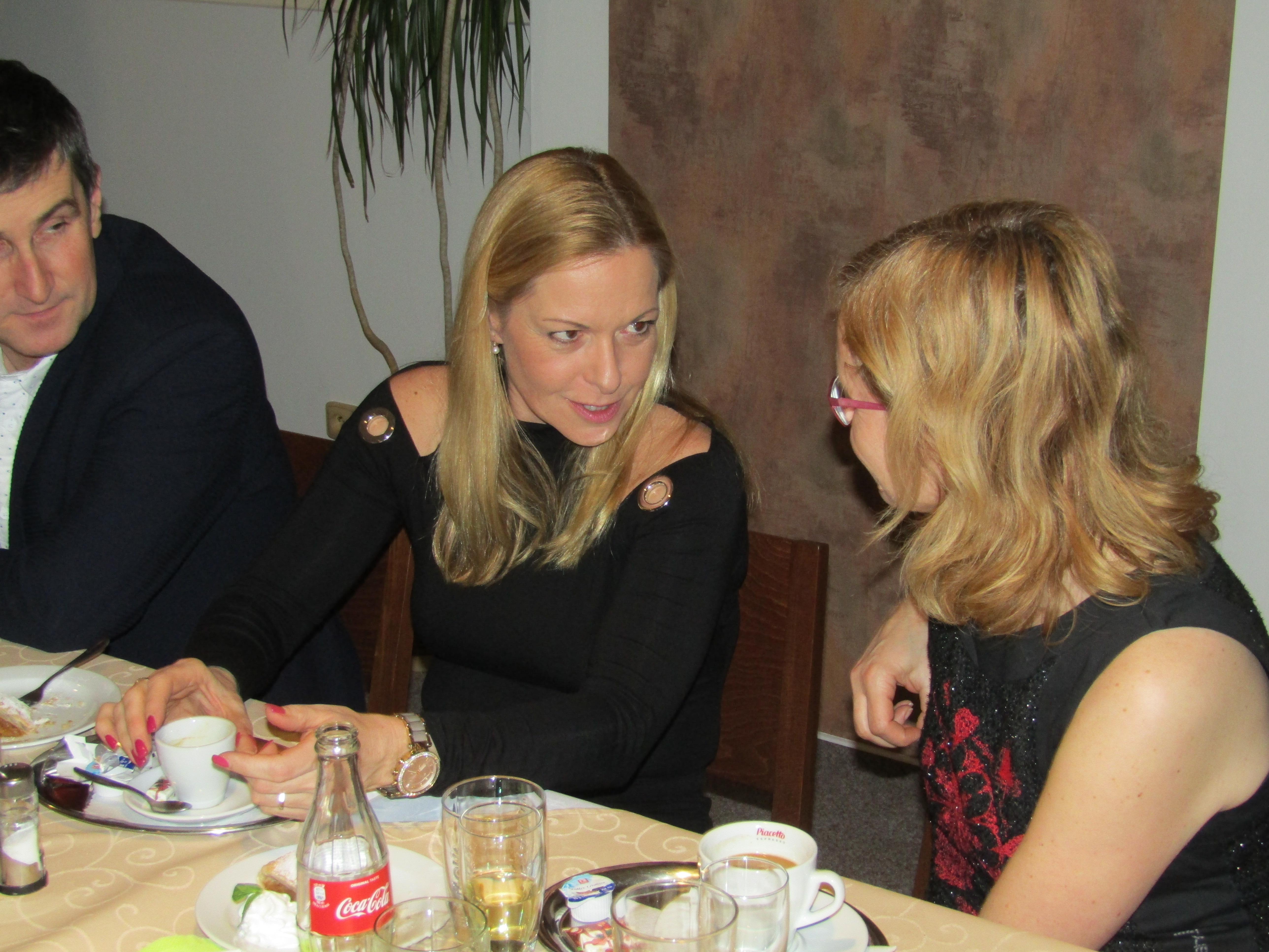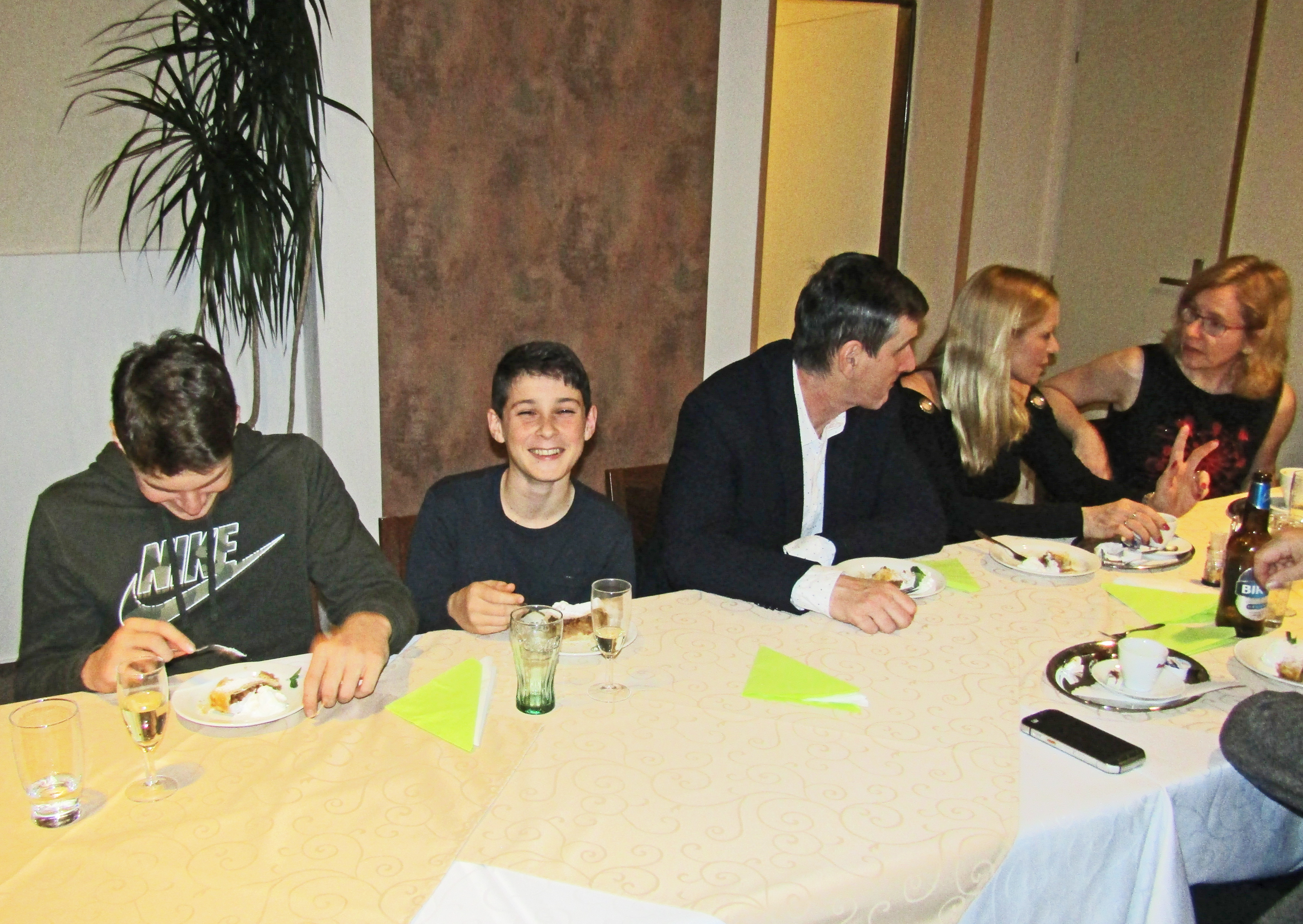 Po této úvodní části schůzky se podávala večeře s tradičním menu. Jako předkrm jsme dostali houbového kubu. Hlavní chod tvořil klasický bramborový salát s opečenou obalenou bílou klobásou a rybím řízkem. Desert byl tvořen kouskem štrůdlu se šlehačkou. Po velmi dobře upravené večeři se ujal slova správce našeho klubu Petr Sogel. Požádal, tak jako každoročně, dcerky přítomných rotariánů a inboundku Maggie o spolupráci při nadělování vánočních dárků. Díky těmto šikovným hosteskám probíhalo tradiční nadílení jako po másle. Jedna z dívek nabídla postupně všem přítomným možnost vylosovat si z kbelíčku na led číslo na lístku. Další dívky pak podle těchto čísel přinášely ke stolu stejným číslem označený dárek. Většina dárků byla v tuhé nebo v tekuté podobě, ale objevily se tentokrát i dárky zcela netradiční. Zasloužený obdiv si získaly například vlastnoručně vyrobení andílci z polystyrénu, které jako dárky připravily dcerky Roberta Hradeckého. Zbytek večera probíhal v optimistické atmosféře u jednotlivých stolů. Do diskuse se zapojovaly především manželky rotariánů, protože se na rozdíl od jejich partnerů, vídají jen 2-3x za rok a tak je toho velmi mnoho, co si chtějí navzájem říci. Na těchto schůzkách se k nadělování dárků scházejí i potomci členů Rotary klubu a na jejich vzrůstu se přesvědčujeme, jak ten čas letí a jak se ještě nedávno malé děti na nás dnes již dívají z nadhledu. Převládala pozitivní atmosféra, všichni si užívali možnost v klidu a pohodě posedět si mezi přáteli. Popíjelo se i vínko, převládaly však nealko pivo, juice, káva a čaje. Tak jako každoročně se i tentokrát naše rotariánská generálka na Štědrý večer vydařila. Svědčí o tom úsměvy účastníků na přiložených fotografiích.