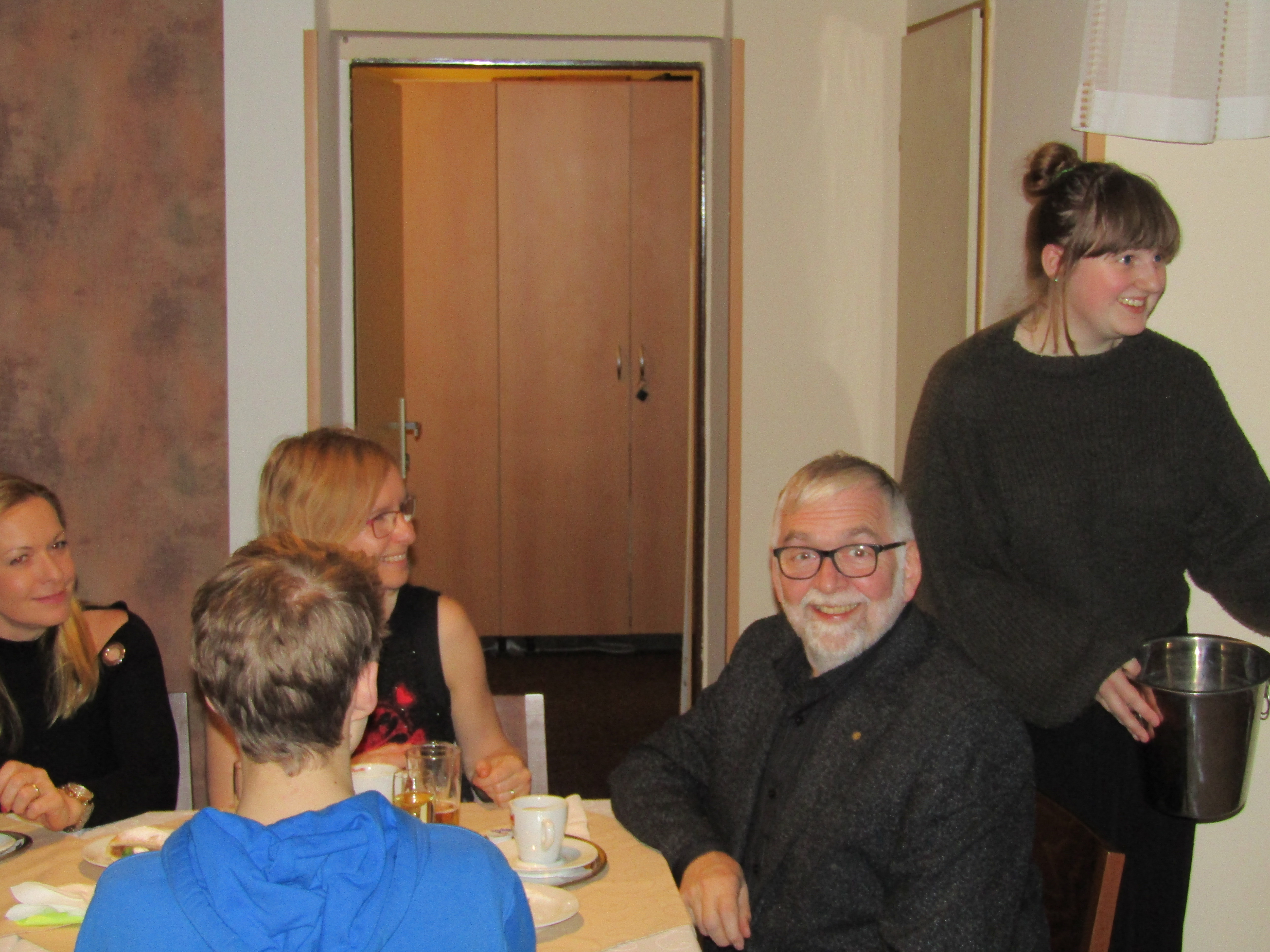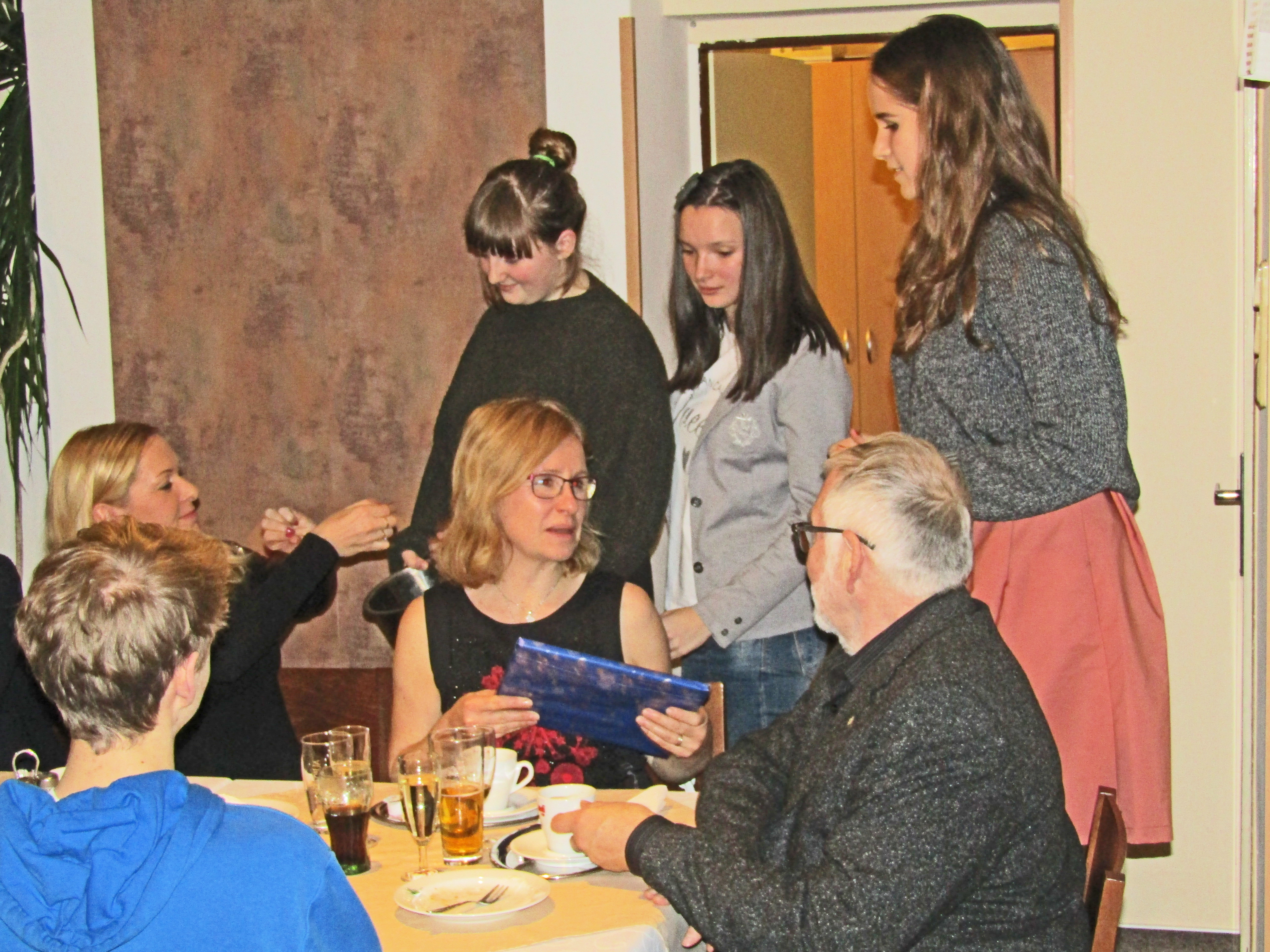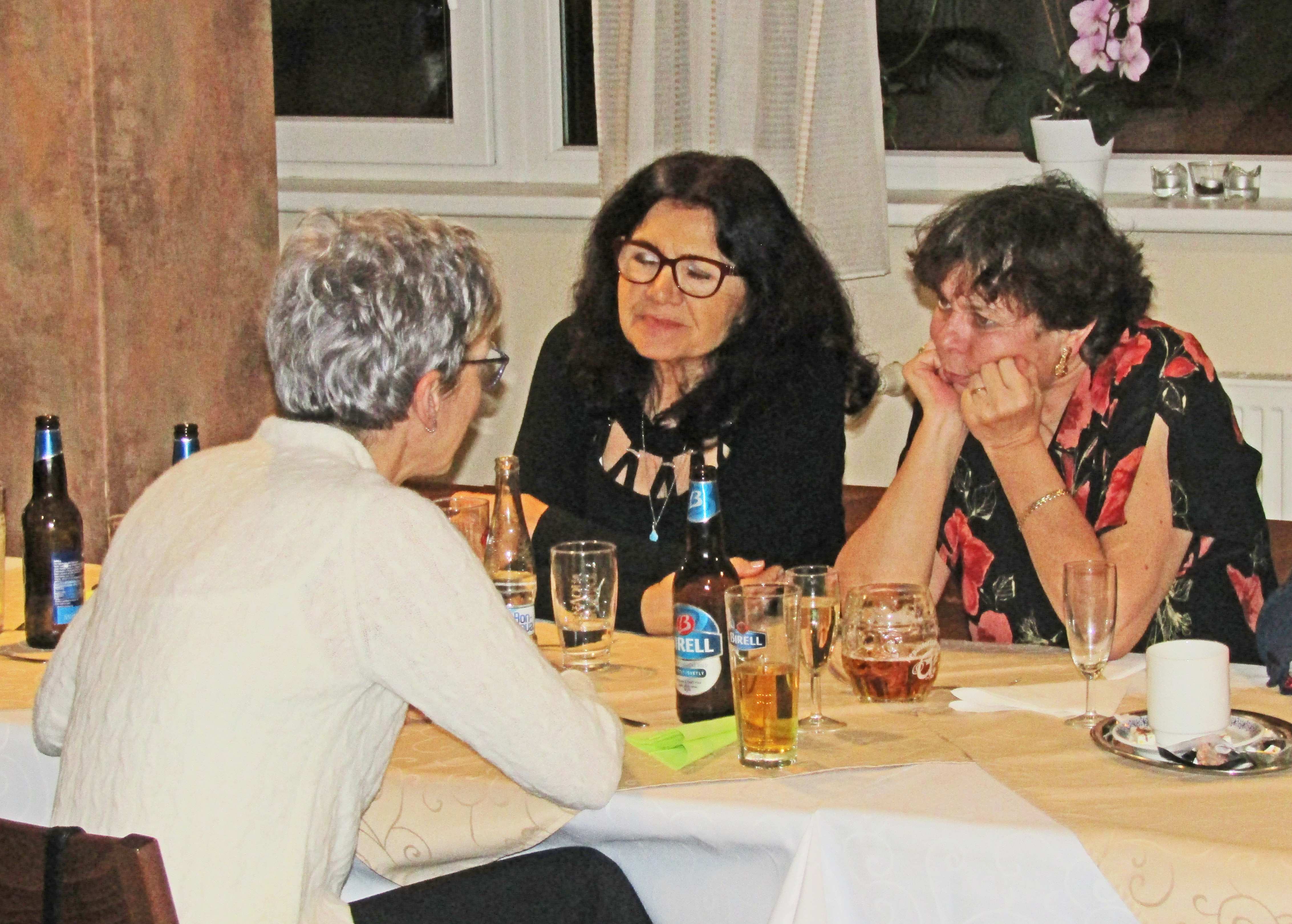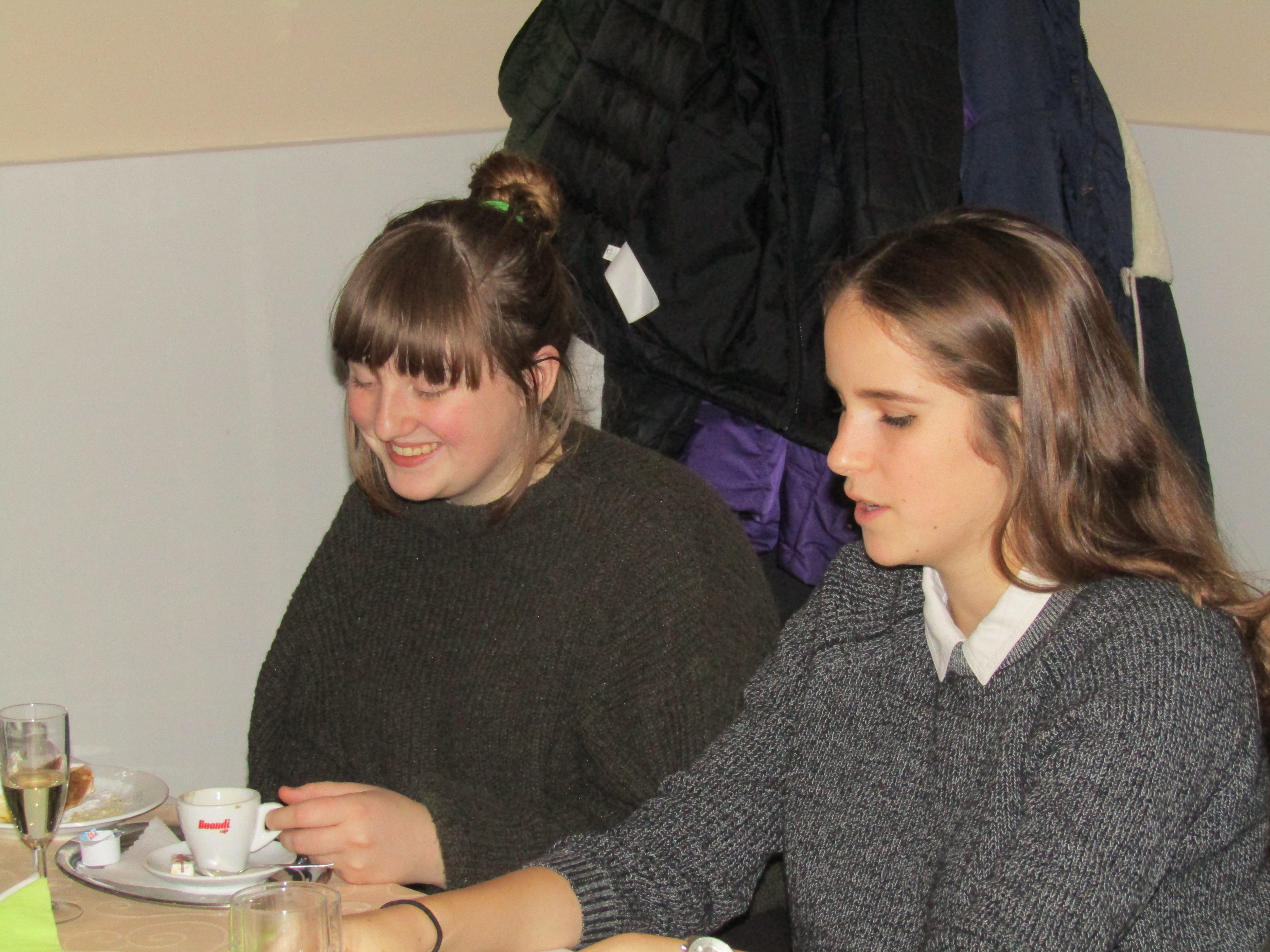 Po této úvodní části schůzky se podávala večeře s tradičním menu. Jako předkrm jsme dostali houbového kubu. Hlavní chod tvořil klasický bramborový salát s opečenou obalenou bílou klobásou a rybím řízkem. Desert byl tvořen kouskem štrůdlu se šlehačkou. Po velmi dobře upravené večeři se ujal slova správce našeho klubu Petr Sogel. Požádal, tak jako každoročně, dcerky přítomných rotariánů a inboundku Maggie o spolupráci při nadělování vánočních dárků. Díky těmto šikovným hosteskám probíhalo tradiční nadílení jako po másle. Jedna z dívek nabídla postupně všem přítomným možnost vylosovat si z kbelíčku na led číslo na lístku. Další dívky pak podle těchto čísel přinášely ke stolu stejným číslem označený dárek. Většina dárků byla v tuhé nebo v tekuté podobě, ale objevily se tentokrát i dárky zcela netradiční. Zasloužený obdiv si získaly například vlastnoručně vyrobení andílci z polystyrénu, které jako dárky připravily dcerky Roberta Hradeckého. Zbytek večera probíhal v optimistické atmosféře u jednotlivých stolů. Do diskuse se zapojovaly především manželky rotariánů, protože se na rozdíl od jejich partnerů, vídají jen 2-3x za rok a tak je toho velmi mnoho, co si chtějí navzájem říci. Na těchto schůzkách se k nadělování dárků scházejí i potomci členů Rotary klubu a na jejich vzrůstu se přesvědčujeme, jak ten čas letí a jak se ještě nedávno malé děti na nás dnes již dívají z nadhledu. Převládala pozitivní atmosféra, všichni si užívali možnost v klidu a pohodě posedět si mezi přáteli. Popíjelo se i vínko, převládaly však nealko pivo, juice, káva a čaje. Tak jako každoročně se i tentokrát naše rotariánská generálka na Štědrý večer vydařila. Svědčí o tom úsměvy účastníků na přiložených fotografiích.