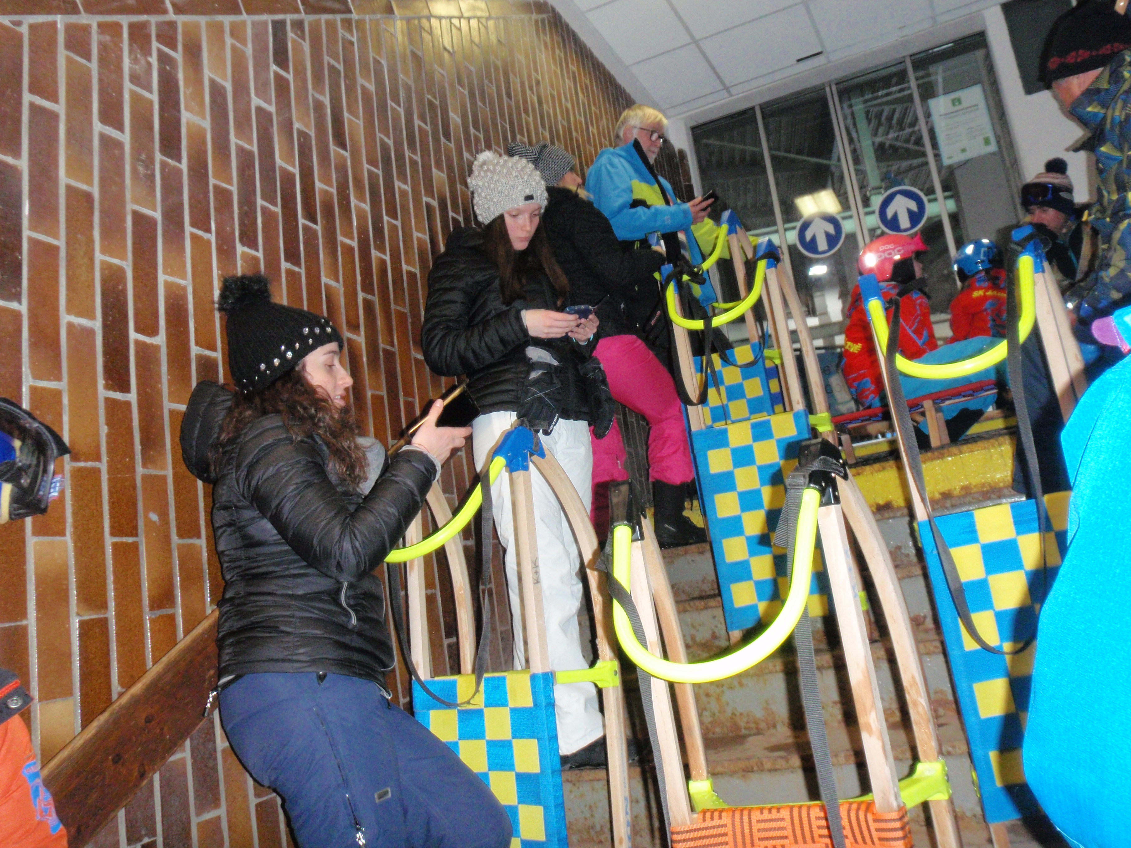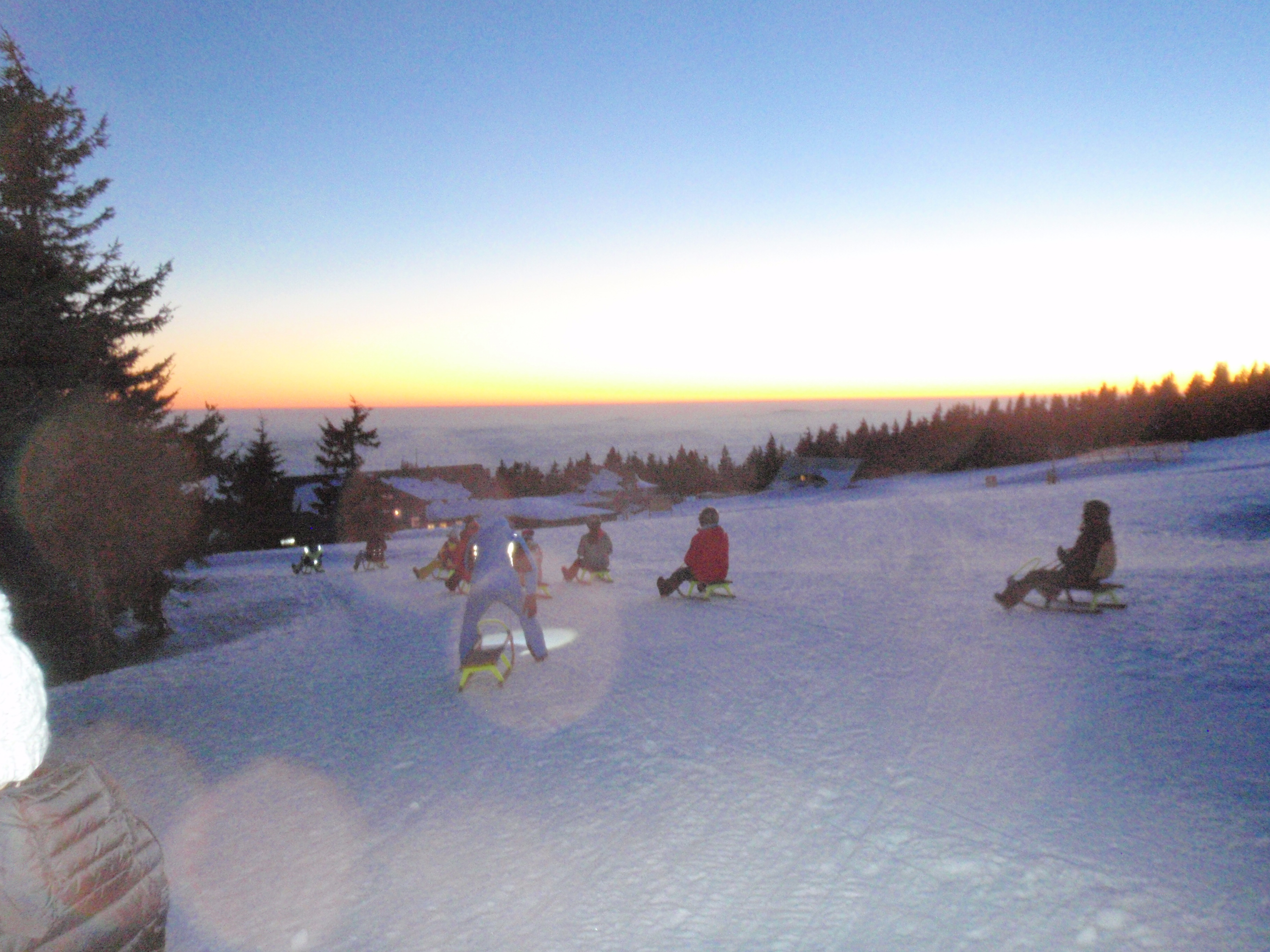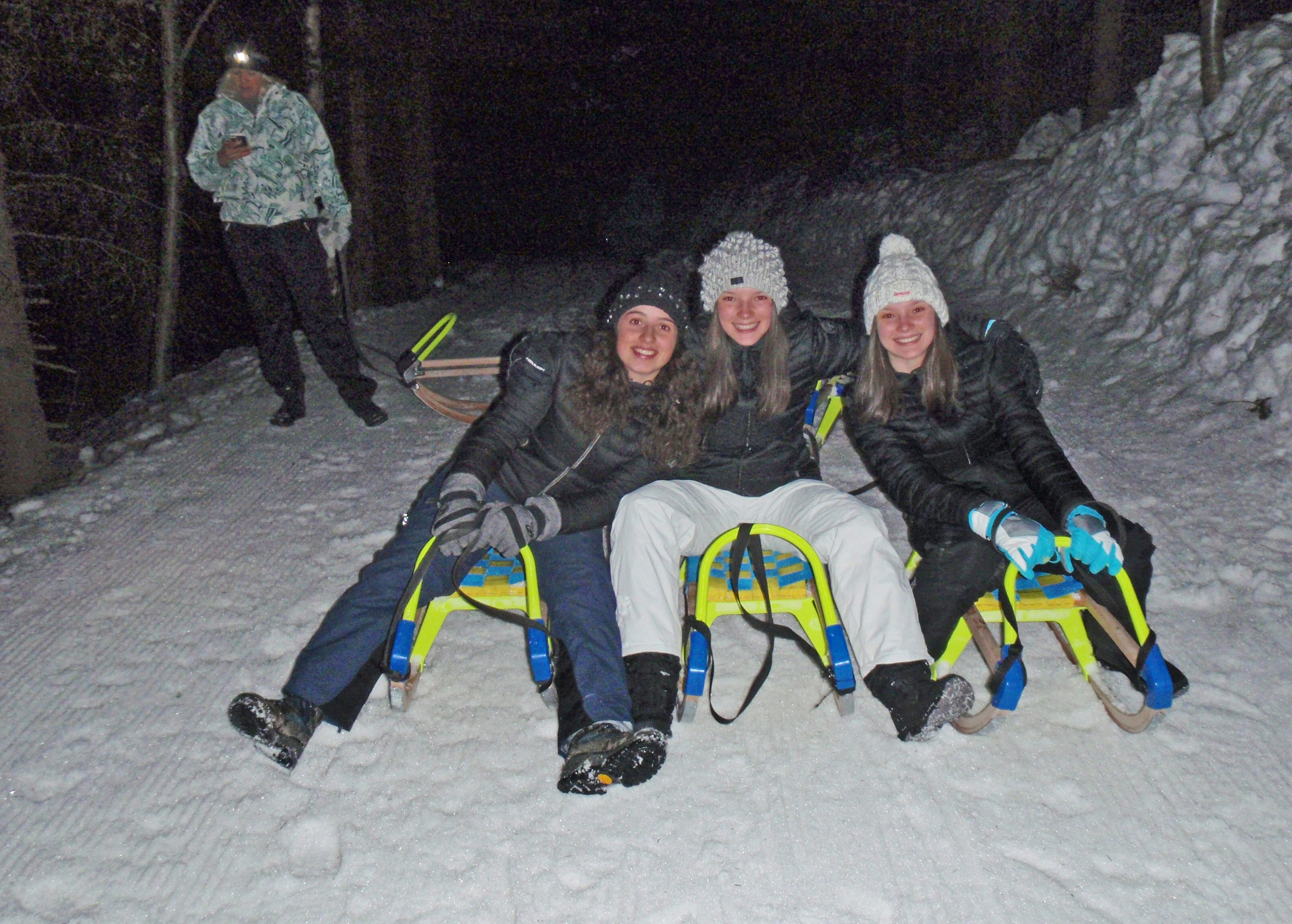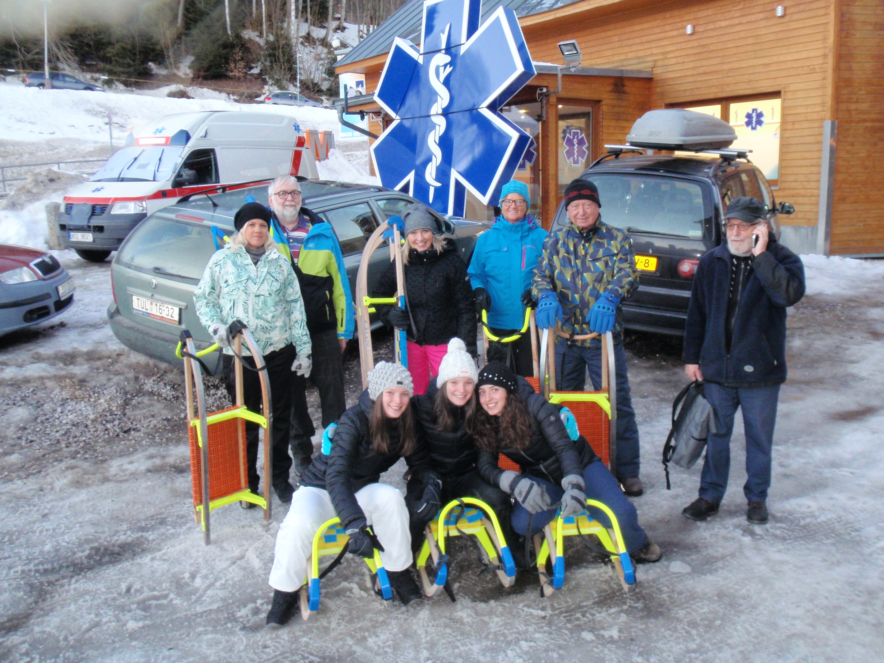 Sportovní část našeho setkání jsme zahájili v půjčovně sportovních potřeb před parkovištěm. Po zapůjčení saní byla pořízena skupinová fotografie. Pak jsme se již přesunuli k budově nástupní stanice lanovky, která nese název Černohorský expres. Krásný sluneční den s denními zcela jarními teplotami poznamenal světelné podmínky naší akce. V průběhu čekání na odjezd lanovky právě zapadalo slunce, takže čekající studentky i pokladník klubu Richard Houdek mohli ještě dobře pracovat s internetovými informacemi na svých mobilech. Poněkud nižší účast rotariánů umožnila, že jsme obsadili se svými saněmi pouze dvě kabinky lanovky, i když v té druhé, která obsahovala čtyři dívky a sekretáře RC, bylo poněkud přesáňkováno. Při předcházejících cestách k vrcholu Černé hory jsme obvykle pozorovali světla v krajině pod námi. Tentokrát byla ještě tak dobrá viditelnost, takže pouliční osvětlení nebylo spuštěno. Červánky od právě zapadlého slunce jsme mohli pozorovat ještě i po výstupu z lanovky po přechodu směrem k Sokolské boudě, kde je obvyklý start sáňkového sjezdu Černé hory. Jako zkušení harcovníci jsme se tentokrát zcela obešli i bez obvyklého instruktora, který by nás na trase orientoval na tu nejoptimálnější cestu. Po úpravě své výstroje a po rozsvícení čelových svítilen si nejmladší účastnice naší akce pořídily selfíčka a společnou rozesmátou fotografii a vyrazili jsme na zpáteční cestu do Jánských lázní. Výpravu vedl jako první sjezdař zkušený horal - klubový pokladník Richard Houdek, závěr jistil sekretář RC Karel Javůrek. Poměrně vysoká vrstva sněhu, která na vrcholové části trasy dosahovala 120 cm, měla za následek, že se saně poněkud bořily v povrchové sněhové vrstvě, změklé od vyšších denních teplot. To poněkud zpomalovalo jízdu na cestách, kde nebyl sníh zpevněný a zarovnaný rolbou, tak jako tomu bylo v předcházejících sjezdech v posledních letech. Tím se v těch částech sjezdu, kde byl jen velmi mírný sklon svahu, saně více bořily než rozjížděly. Ve spodní části trati, kde je již sklon svahu dostatečný, byla naše jízda přiměřeně rychlá. Dostatek sněhu i v nejspodnější části trati umožnil dojezd prakticky až ke vchodu do budovy výchozí stanice lanovky.
