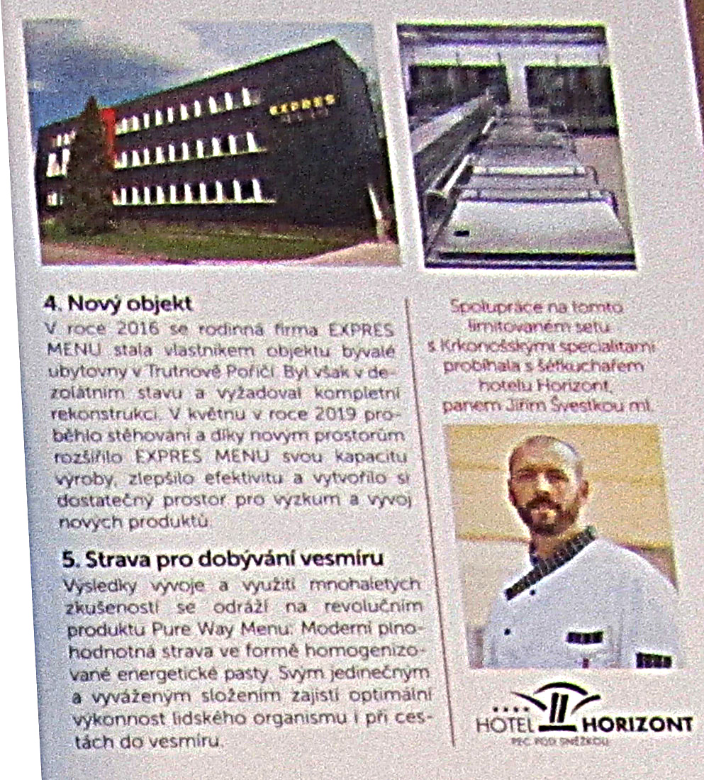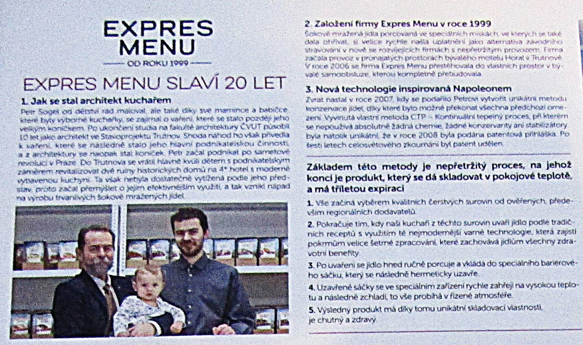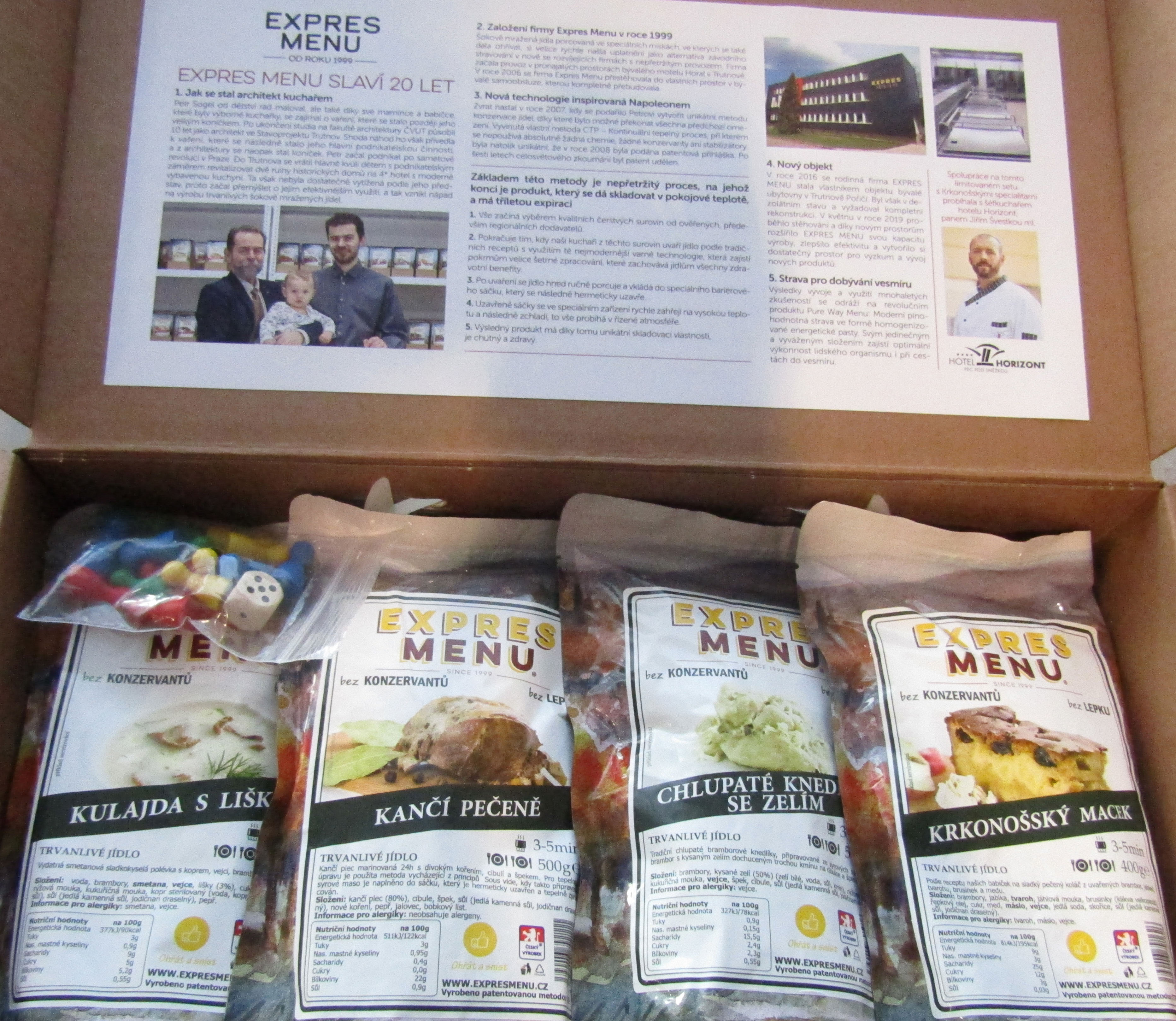 Petr nám ukázal i dárkovou kazetu, kterou k příležitosti 20 let trvání firmy připravili. Na víku kufříku s klasickými regionálními pokrmy byla zajímavou formou stručně popsaná historie jeho firmy, včetně principu unikátní technologie, kterou při výrobě pokrmů využívá.