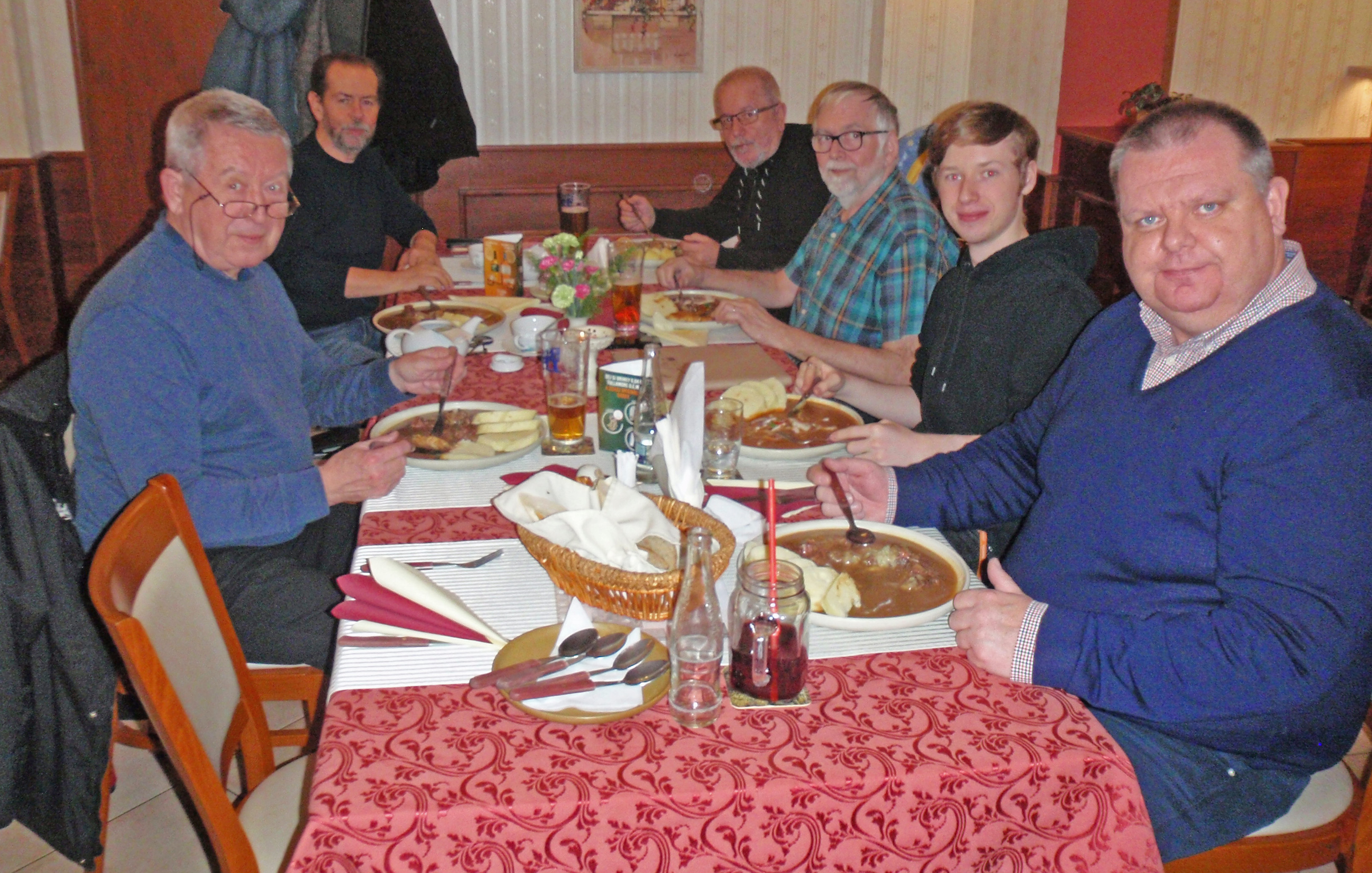 Poslední lednová schůzka se nemohla uskutečnit v našich tradičních prostorách hotelu Patria, kde se snad jen v tomto týdnu vyskytly nečekané technické problémy s provozem restaurace. Správce klubu Petr Sogel operativně zajistil náhradní místo schůzky ve velmi pěkně upravené restauraci Penzionu v Poříčí. Podařilo se mu dojednat i levnější polední menu, které na rozdíl od obvyklé nabídky restaurace v Patrii obsahovalo dokonce možnost výběru ze 4 jídel. Rovněž velikost porcí jídla v restauraci Penzionu, kde se obvykle stravují fyzicky pracující řemeslníci, nás velmi překvapily a jen s vypětím všech sil jsme byli schopni si s nimi poradit. Tím ani nemohlo dojít k objednávce desertu, neboť ten už by se do našich žaludků zcela jistě nevešel. Sám organizátor této večeře, který již od Silvestra ve stravování naprosto  abstinuje, nás nad přeplněnými talíři zvěčnil a upozornil na blížící se čtyřicetidenní tradici předvelikonočního půstu. Sám pak „povečeřel“ šálek čaje (viz foto). Kromě večeře jsme se věnovali některým „pracovním“ problémům souvisejícím s našimi projekty a s programem příštích schůzek.