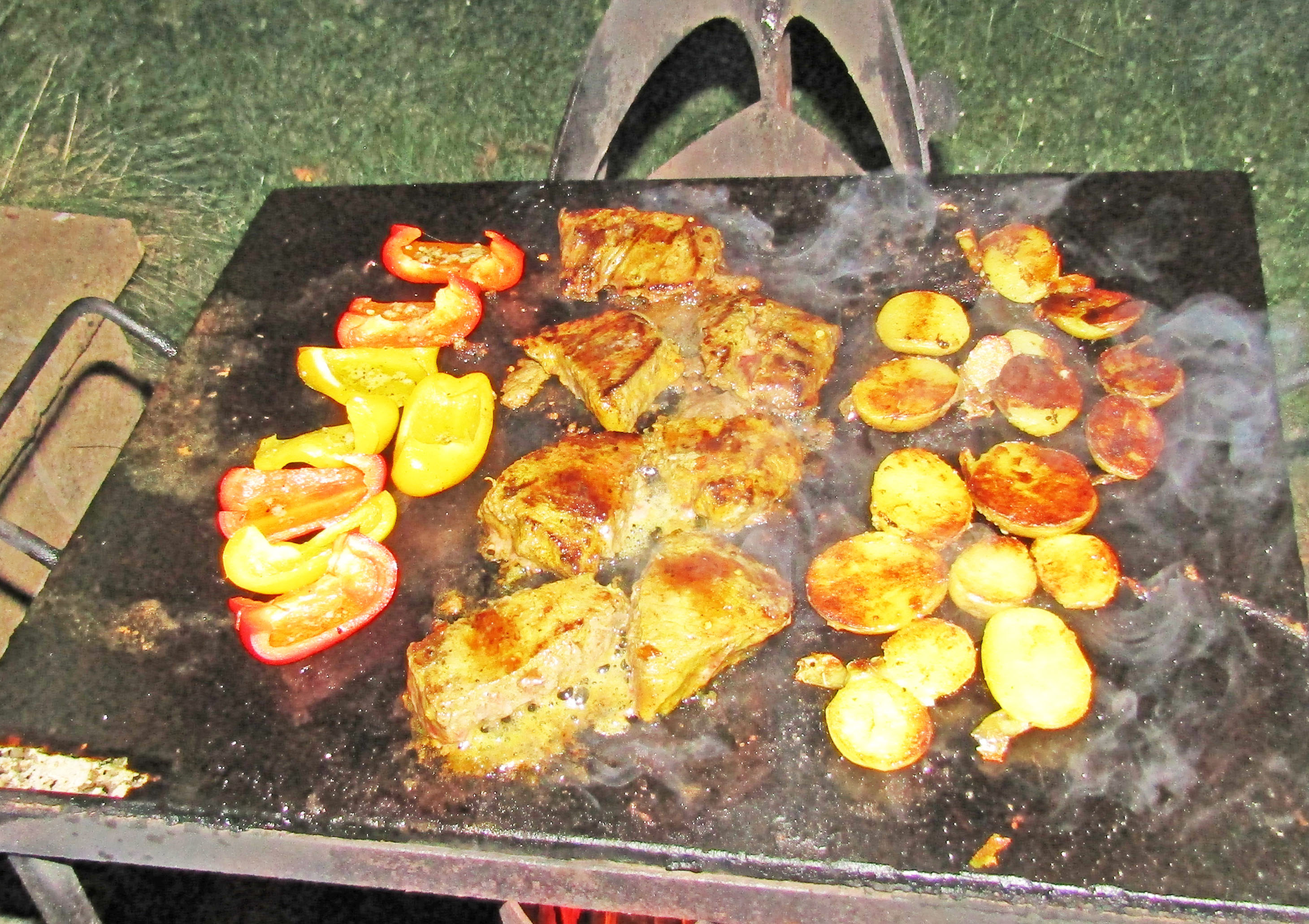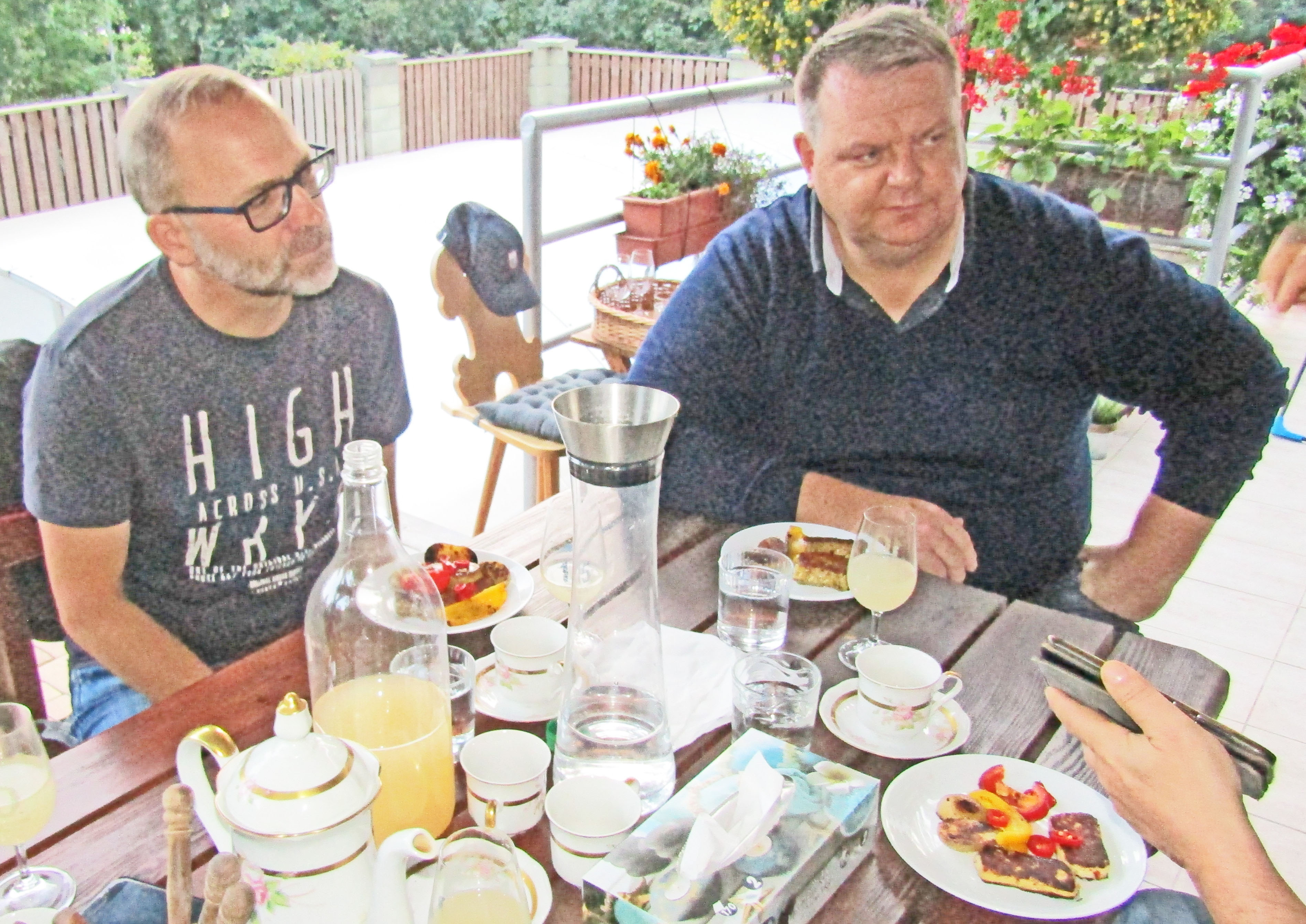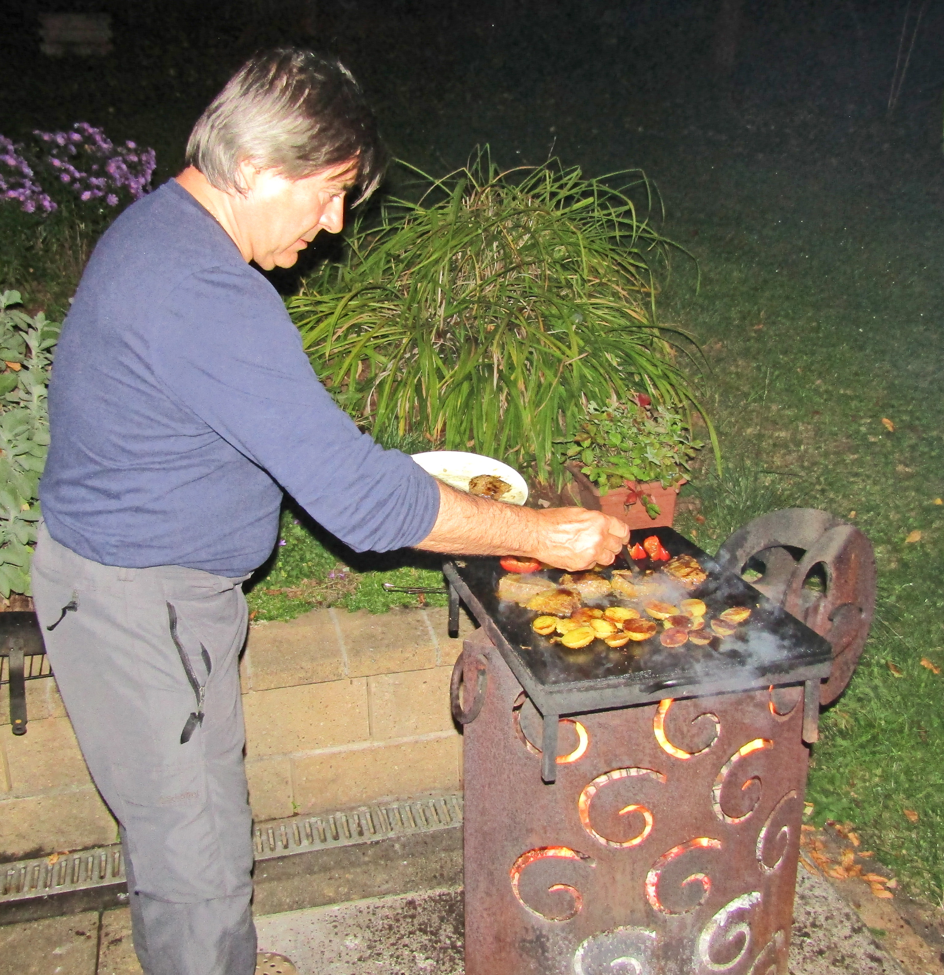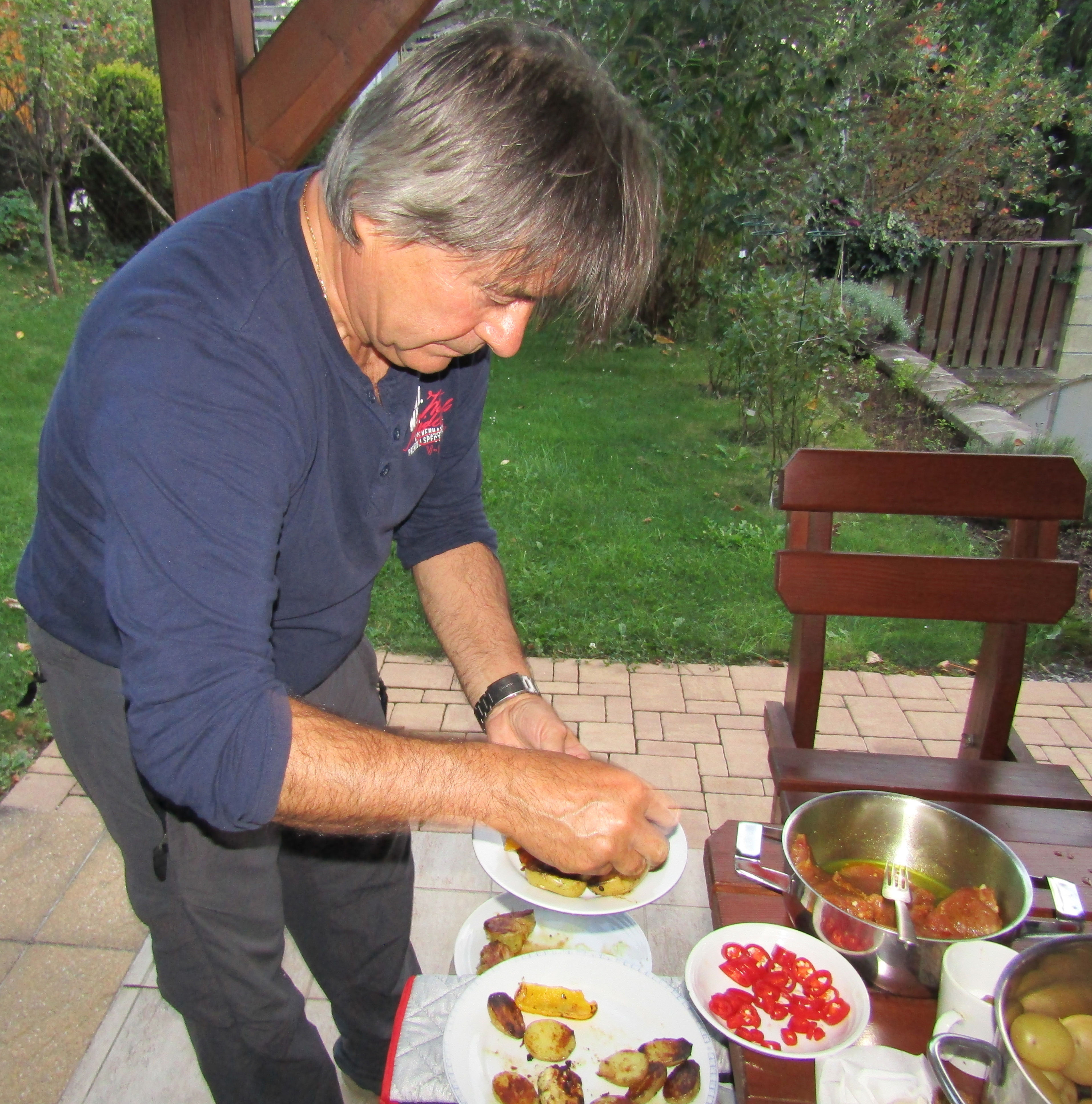 Třetí zářijová schůzka, původně plánovaná do hotelu Patria, se pod vlivem krásného letního počasí, které už zřejmě nebude mít dlouhé trvání, přesunula díky nabídce našeho současného prezidenta Karla Rady na terasu jeho domu v ulici Slunečná Stráň. V 18.00 hodin nás kromě hostitele přivítal předem rozpálený originální ocelový gril v podobě skopce. Z objemné nádoby se načepovaly poháry čerstvě dovezeného kvalitního moravského burčáku z odrůdy Irsai Oliver, který Karel pro nás zajistil na tento večer. Tato podzimní vinařská specialita byla pro nás velmi příhodná nejen svou vyváženou poloslanou chutí, ale především malým obsahem alkoholu, neboť v něm kvasinky ještě nepřeměnily v moštu obsažený cukr na alkohol. To nám následně umožňovalo odjet ze schůzky auty či Vaškovi Flanderovi na kole. Při úvodním symbolickém přípitku jsme se také od hostitele dozvěděli, že správní vinaři si sklenkou s burčákem nepřiťukávají, neboť tento druh přípitku patří pouze k vínu. Po tomto neoficiálním zahájení se náš prezident naplno věnoval přípravě večeře na rozpálené žulové desce, která tvořila jakousi vrchní plotnu na grilu. Z kvalitních surovin – vepřové panenky a svíčkové a příloh, tvořených především opečenými bramborami a paprikou, dokázal Karel vykouzlit vynikající pokrmy, jimiž nás následující hodinu postupně zásoboval. Ochucující koření, olejovou nebo vinnou zálivku na masa i přílohy zůstávaly při přípravě jídle tajemstvím mistra zdejší kuchyně. Při této zcela profesionální gastronomické seanci jsme naživo poznali, že je náš prezident nejen úspěšným manažerem a podnikatelem, ale i skvělým kuchařem. Tento závěr nám potvrdila i Karlova manželka Zorka a dcerka Kateřina, jímž Karel průběžně svěřoval pouze některé pomocné práce, jako bylo porcování zeleniny či odnášení použitého nádobí. V průběhu prezidentovy gastronomické aktivity nás Vašek Flandera podrobně seznámil se stavem budování jeho nové provozovny, která se realizuje při rekonstrukci objektu bývalé tovární budovy Texlenu naproti současnému Autostylu. Některé vzniklé problémy této stavby Vašek konzultoval s Petrem Sogelem, který svoji profesi architekta hlavně v současnosti využívá k tvorbě projektů pro domy obou svých dětí. Po dokončení stavby dceřina domu v Barceloně se nyní věnuje vytváření projektu na stavbu silnice a na zemní práce k pozemku navazujícímu na ulici U Pramene, kde bude ve strmém svahu stát dům jeho syna Adama. S projektem této stavby nás Petr rovněž rámcově seznámil. Po skončení skvělé kulinářské exhibice Karla Rady, při níž pro nás připravil postupně čtyři chody večeře, jsme se dostali k řešení některých úkolů v činnosti našeho Rotary klubu.