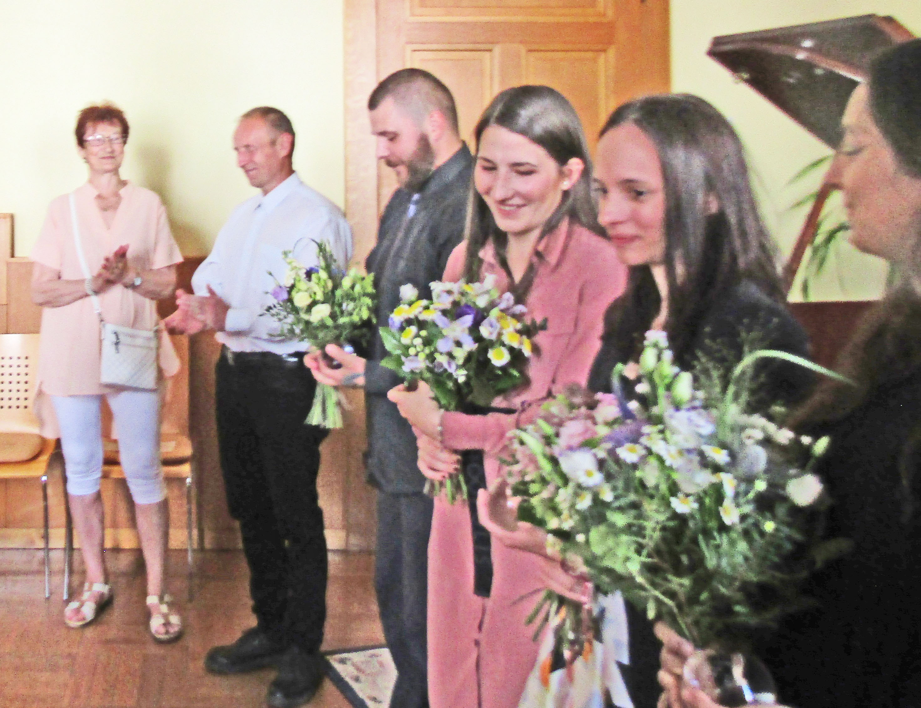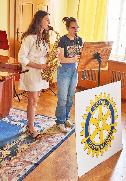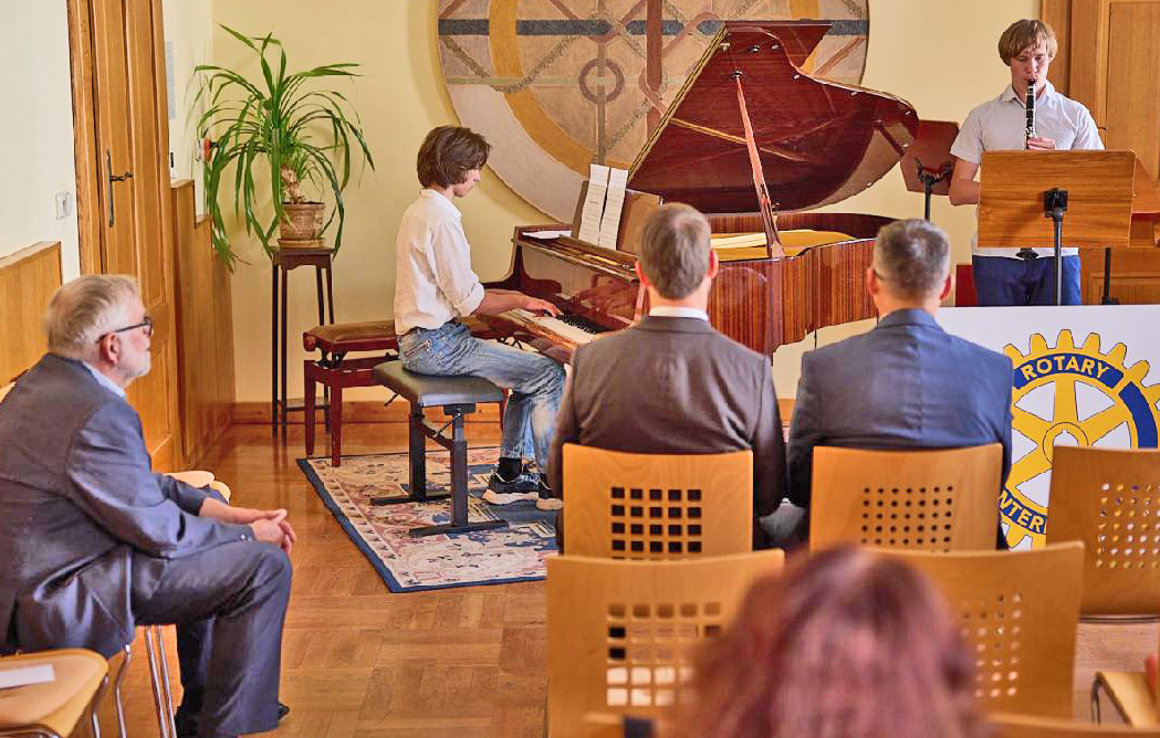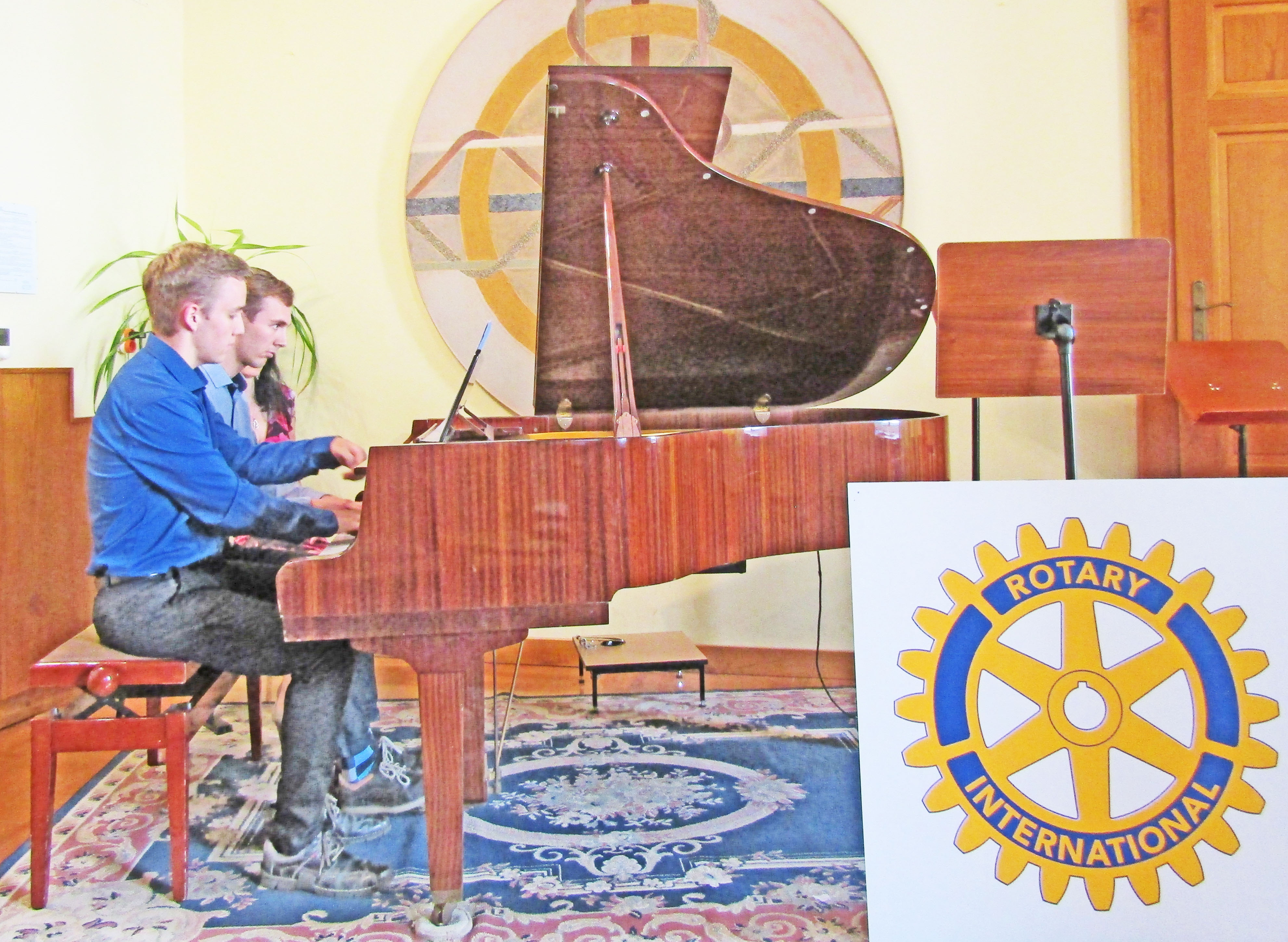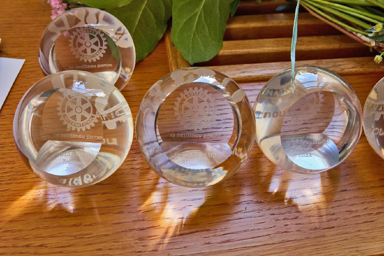 Všichni představovaní dobrovolníci po přečtení jejich aktivit za potlesku přítomných hostů nastupovali do přední části sálku, kde jim prezident Rotary klubu předával upomínková skleněná těžítka a sekretář RC kytice. Závěr Společenského večera uzavřeli opět dva žáci ZUŠ, kteří ve dvojici současně zahráli hudební skladbu na klavír. Kromě kytic pro dobrovolníky i pro všechny vystupující žáky ZUŠ zajistil Vašek Flandera čokoládovou odměnu.