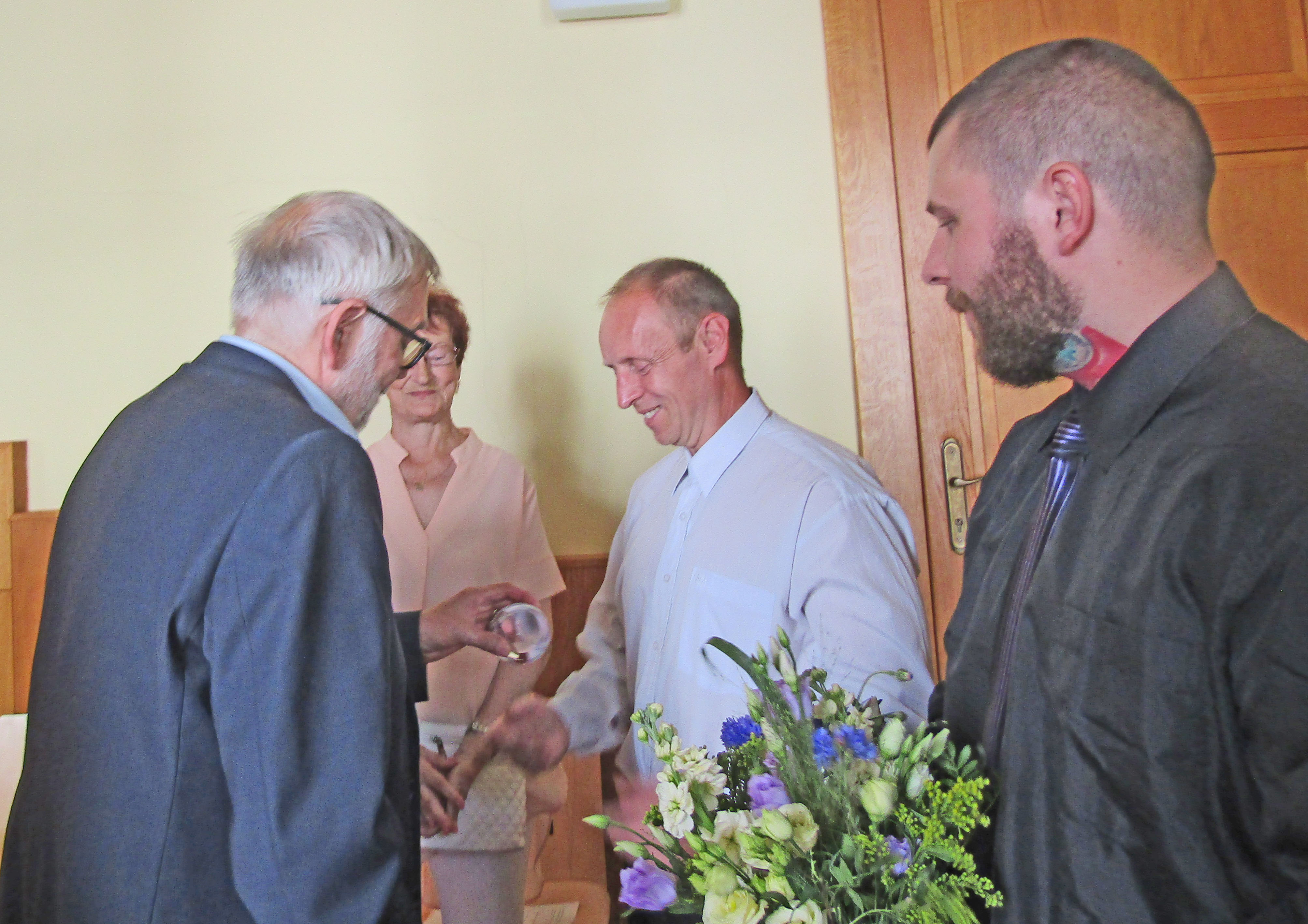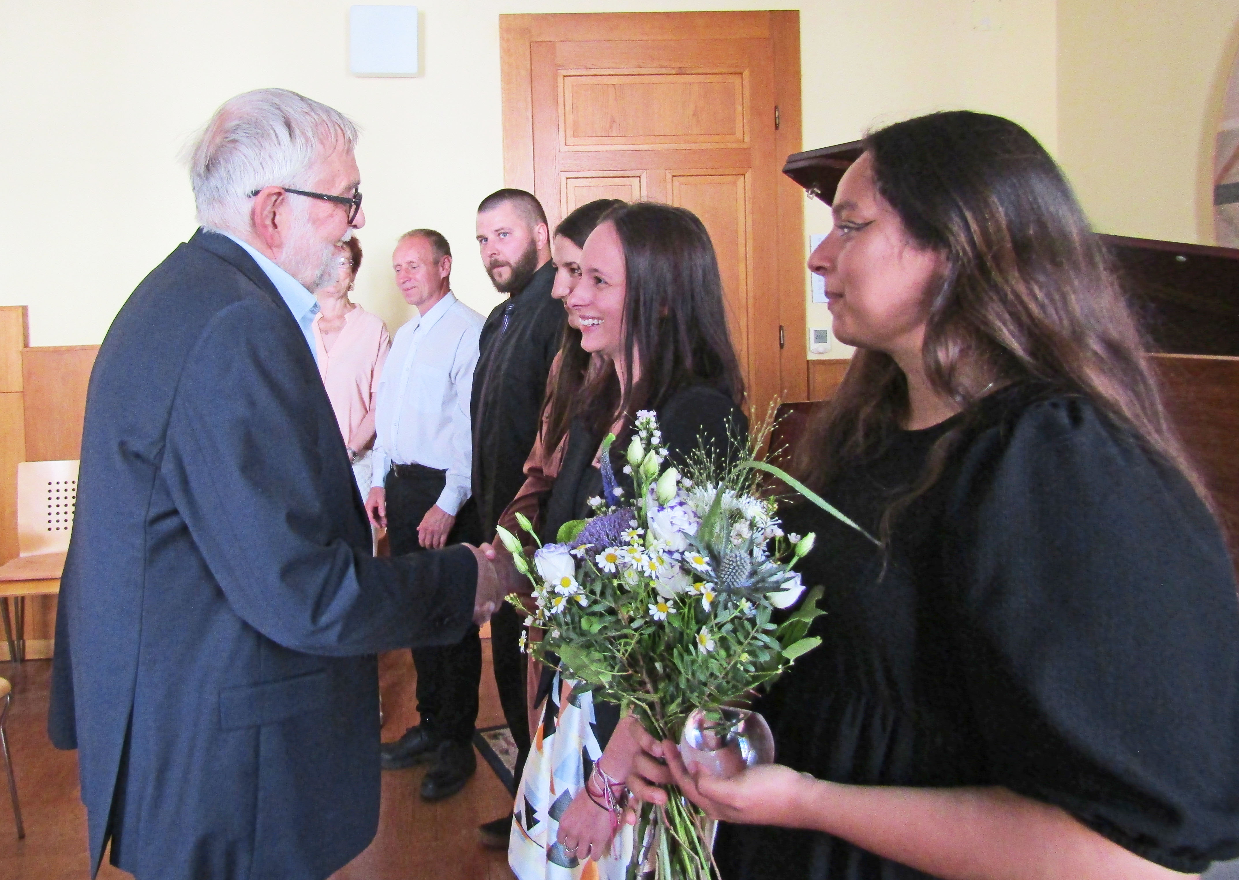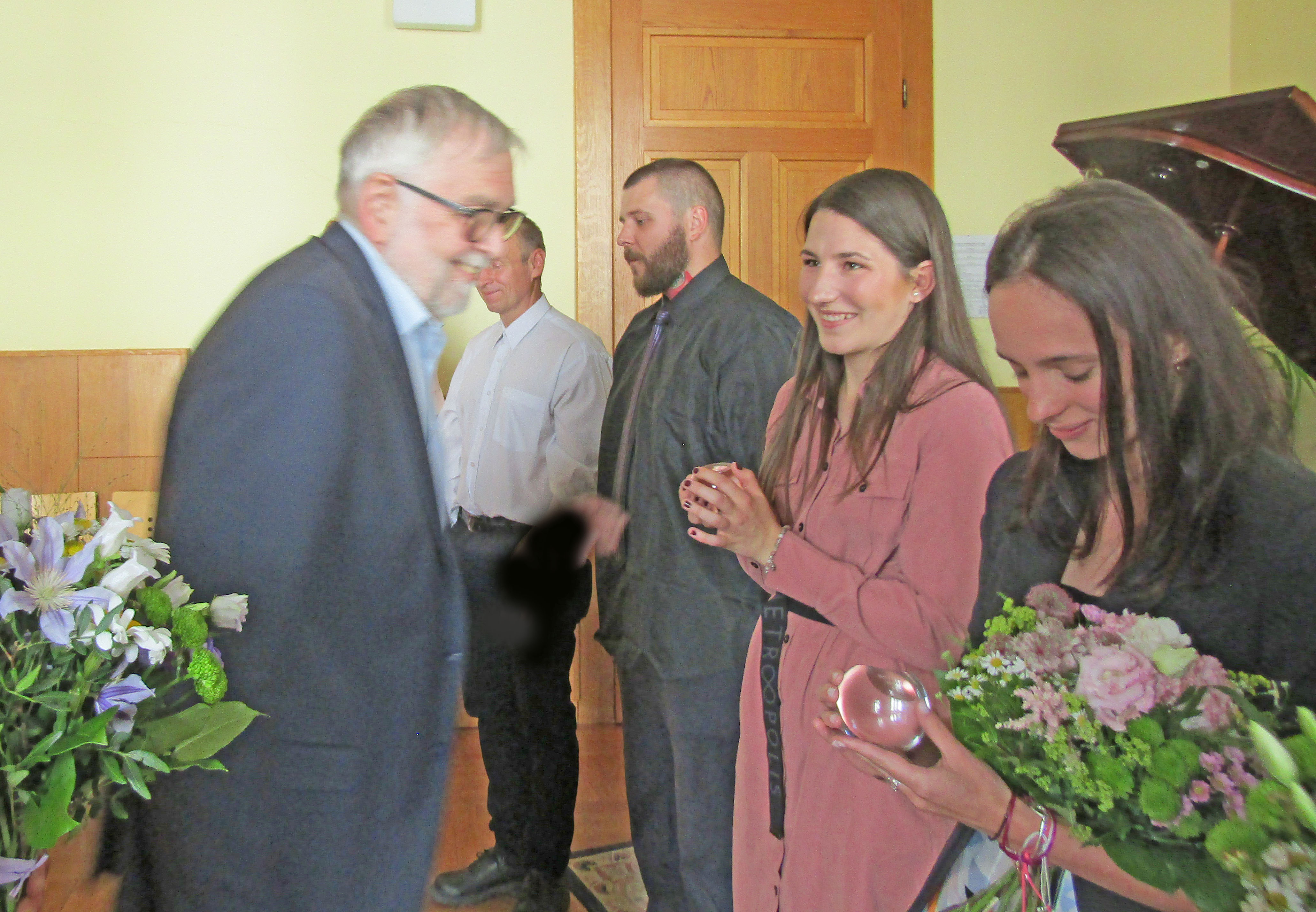Všichni představovaní dobrovolníci po přečtení jejich aktivit za potlesku přítomných hostů nastupovali do přední části sálku, kde jim prezident Rotary klubu předával upomínková skleněná těžítka a sekretář RC kytice. Závěr Společenského večera uzavřeli opět dva žáci ZUŠ, kteří ve dvojici současně zahráli hudební skladbu na klavír. Kromě kytic pro dobrovolníky i pro všechny vystupující žáky ZUŠ zajistil Vašek Flandera čokoládovou odměnu.