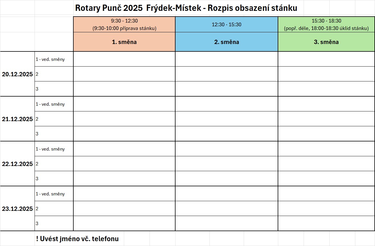 V příloze máte tabulku s rozpisem služeb. Tentokrát naléhavě potřebujeme podporu všech členů klubu, rodinných příslušníků a přátel, abychom pokryli dny prodeje. Zejména je třeba, aby vedoucí směny byli členové našeho klubu. Kdo bude chtít a bude moci se v těchto dnech zapojit do prodeje punče, nechť napíše na pczekaj@mspakt.cz či na arnekudela@gmail.com nebo na WA 737 28 60 60, do které směny např. 20.12./1 nebo 2 nebo 3. Zkoordinujeme a společně doplníme tabulku.