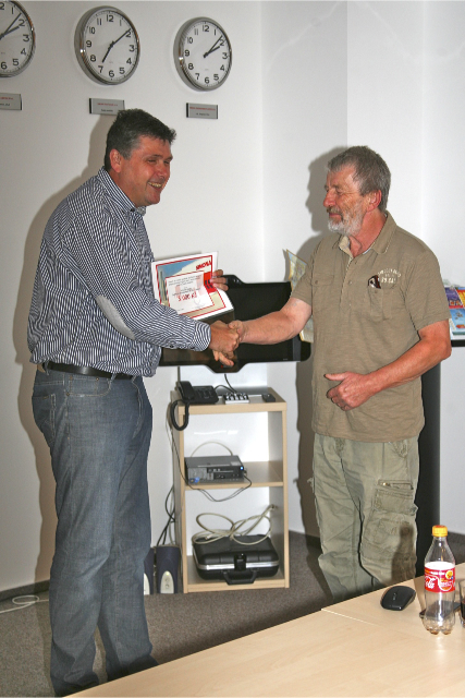 Zaměstnanci závodu Simona Plast Litvínov vybrali mezi sebou prostředky na pomoc Sdružení, kterou dnes symbolickým šekem na 5000,-Kč předal ředitel Rothe panu Syrovátkovi.