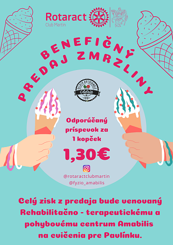 1.9.2023 sme sa opätovne zúčastnili streetfood festivalu v Martine s názvom Fest Jedlo, kde sme aj vďaka členom RAC Košice mohli návštevníkom ponúknuť možnosť vďaka zakúpeniu si benefičnej zmrzliny podporiť - tento rok Pavlínku Fajnovú, ktorá je najmladšou zo 4 sestier a trpí stredne ťažkou až ťažkou retardáciou neznámeho pôvodu.