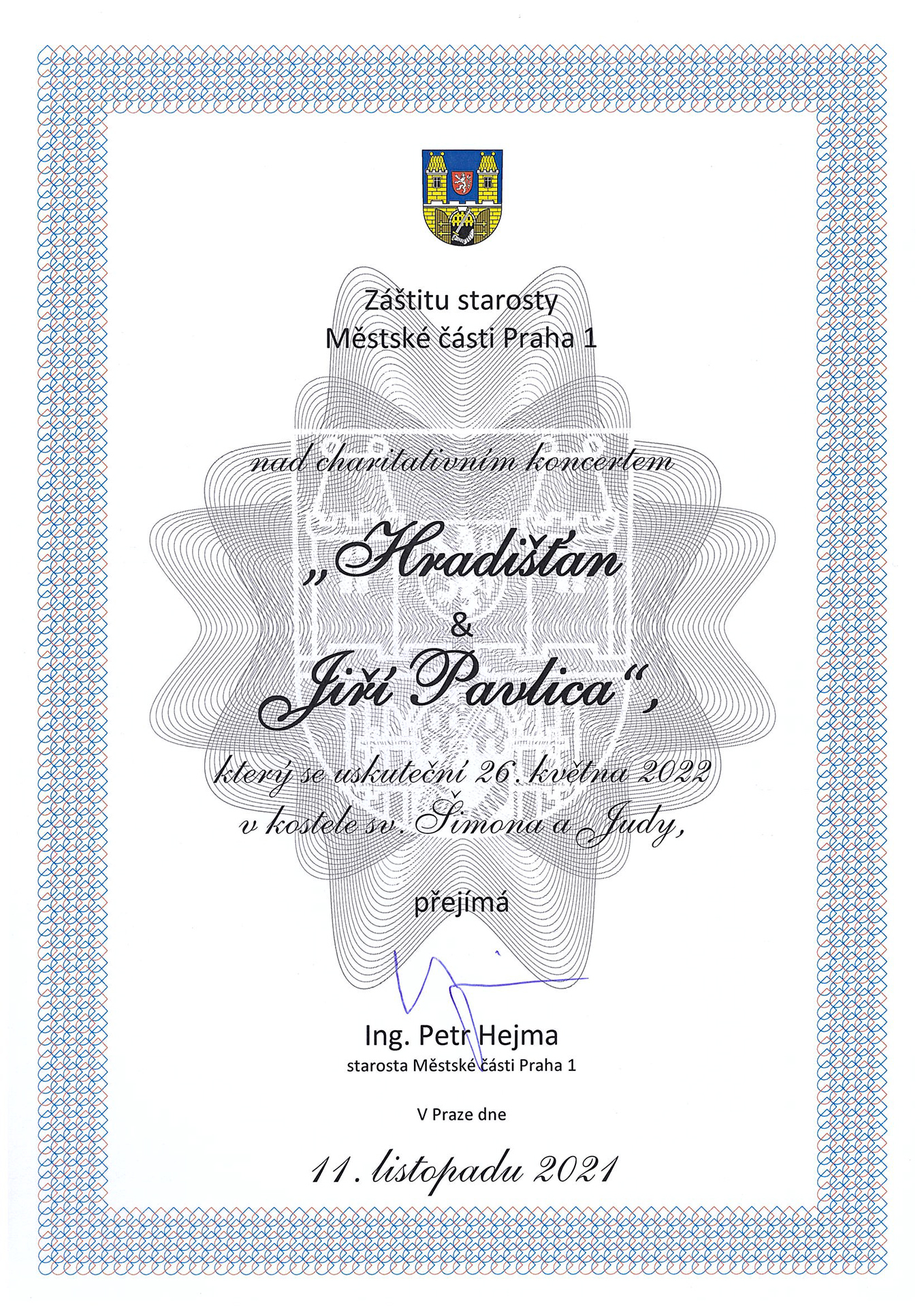 Nad charitativním koncertem převzal záštitu starosta Městské části Praha 1 pan Petr Hejma.